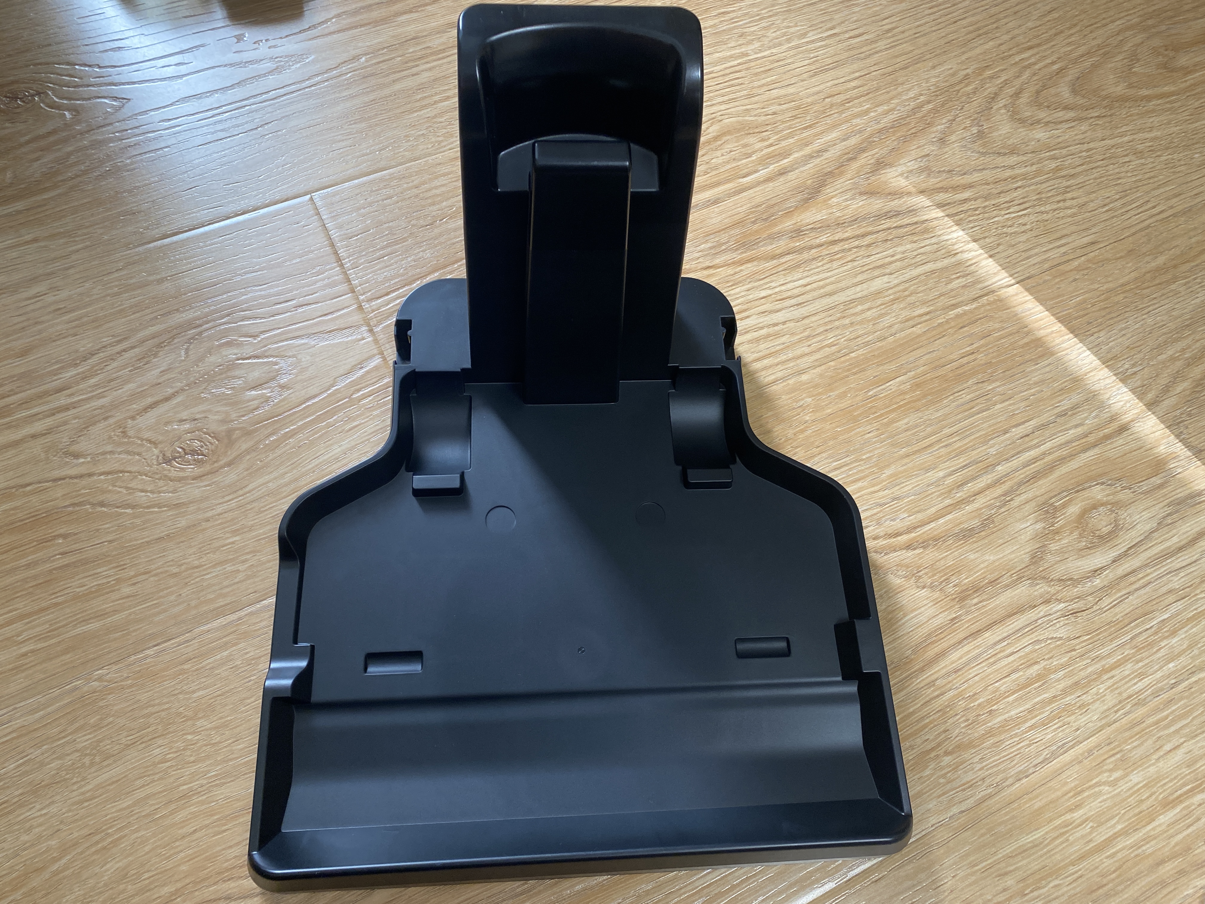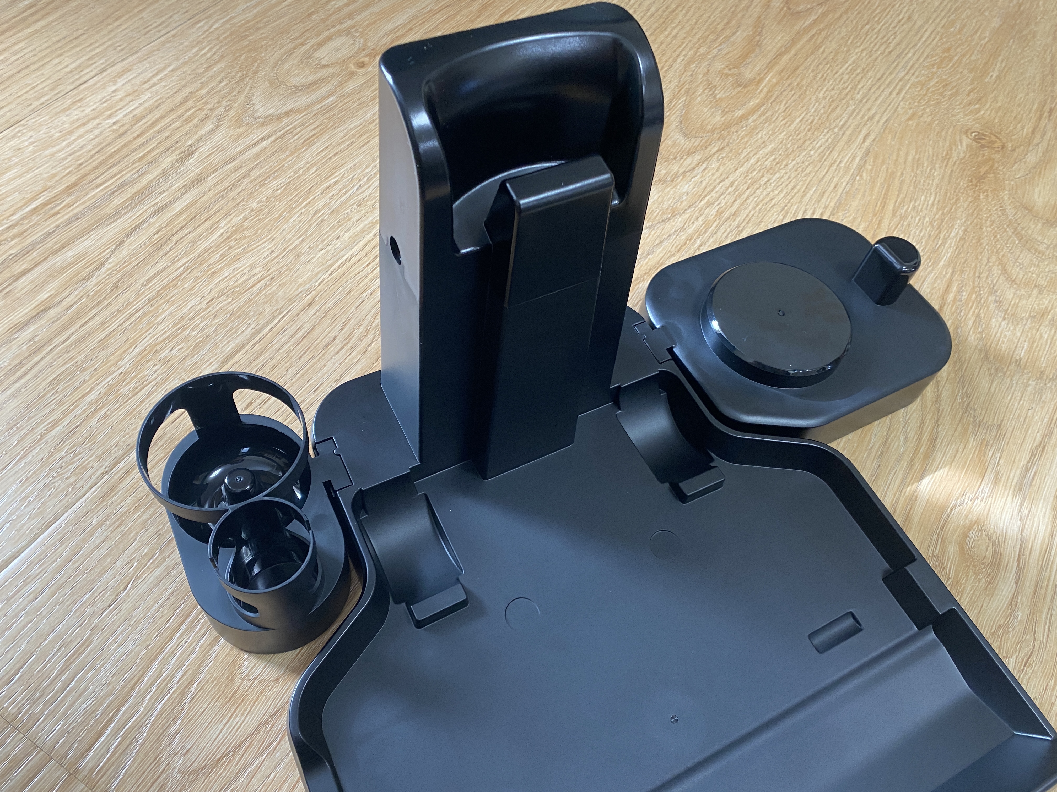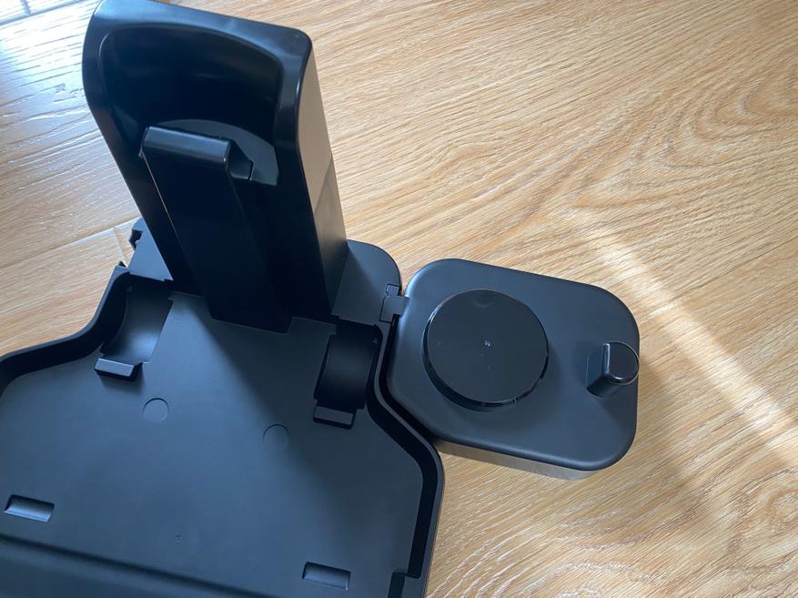 В комплекте также имеется лоток-подставка, она же станция-зарядки-самоочистки, которая имеет с двух сторон возможность установить дополнительные лотки для хранения аксессуаров. Конечно, разместить весь комплект у пользователя не получится, так как комплектация слишком большая, но на лотке можно разместить часто используемые компоненты. Лоток полностью сделан из пластика черного цвета. Поверхность пластика матовая и загрязнений практически невидно. На нижней части лотка имеются мягкие накладки для предотвращения скольжения по гладкой поверхности.