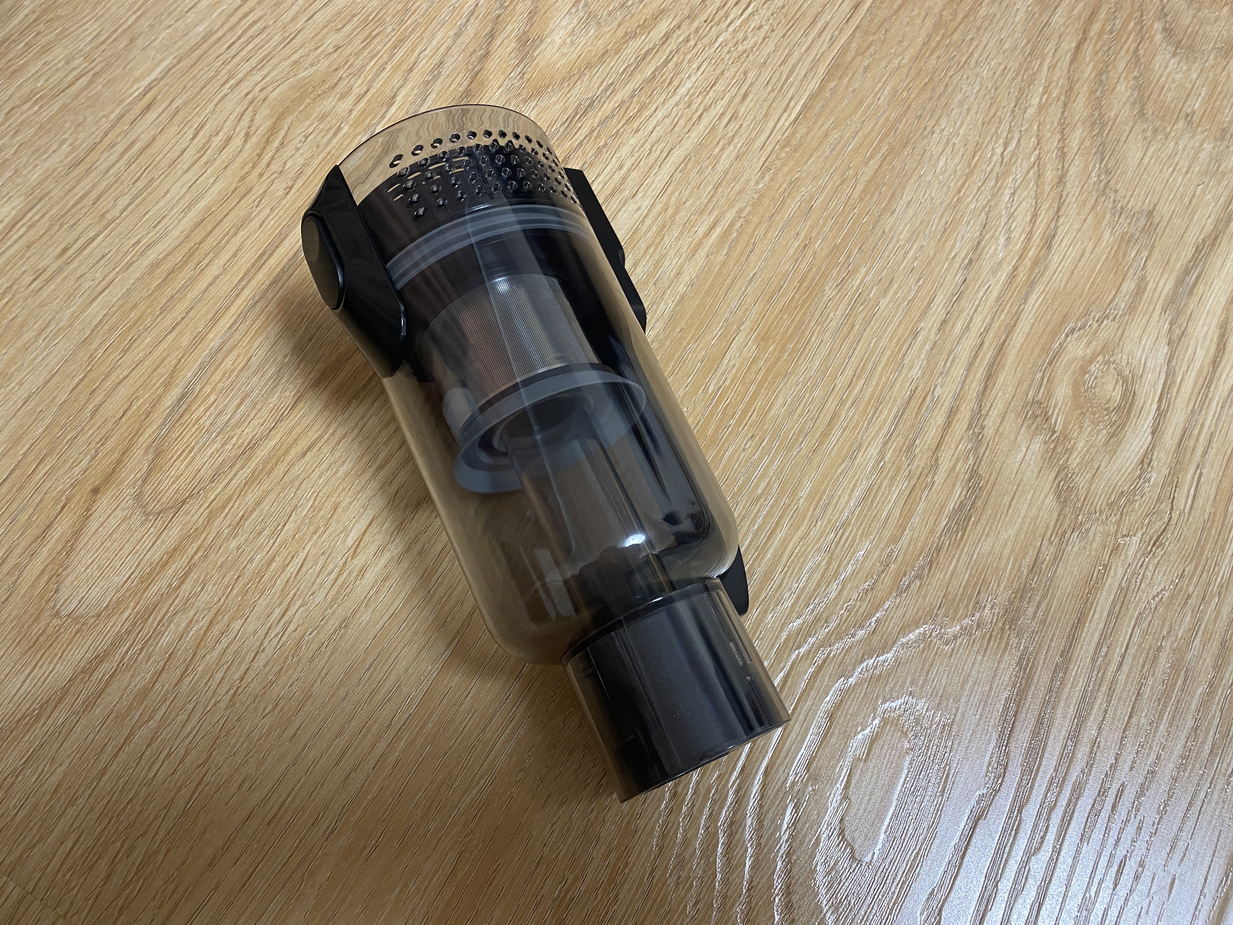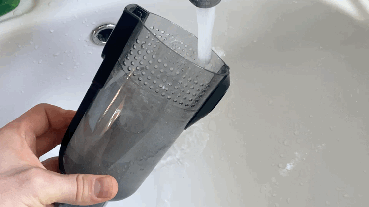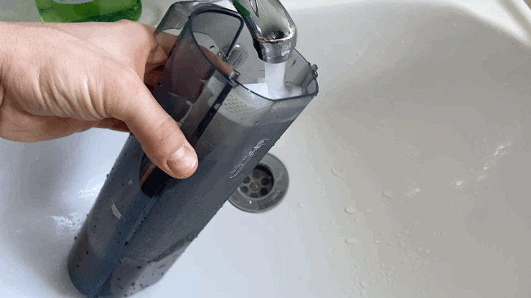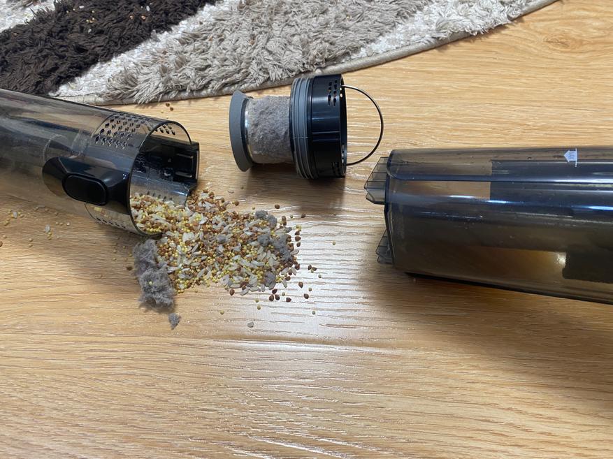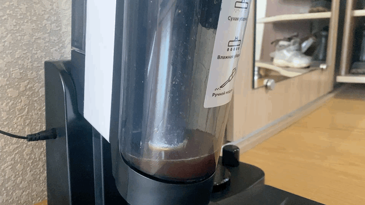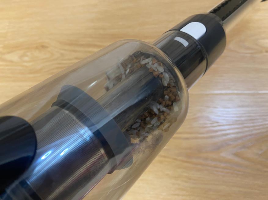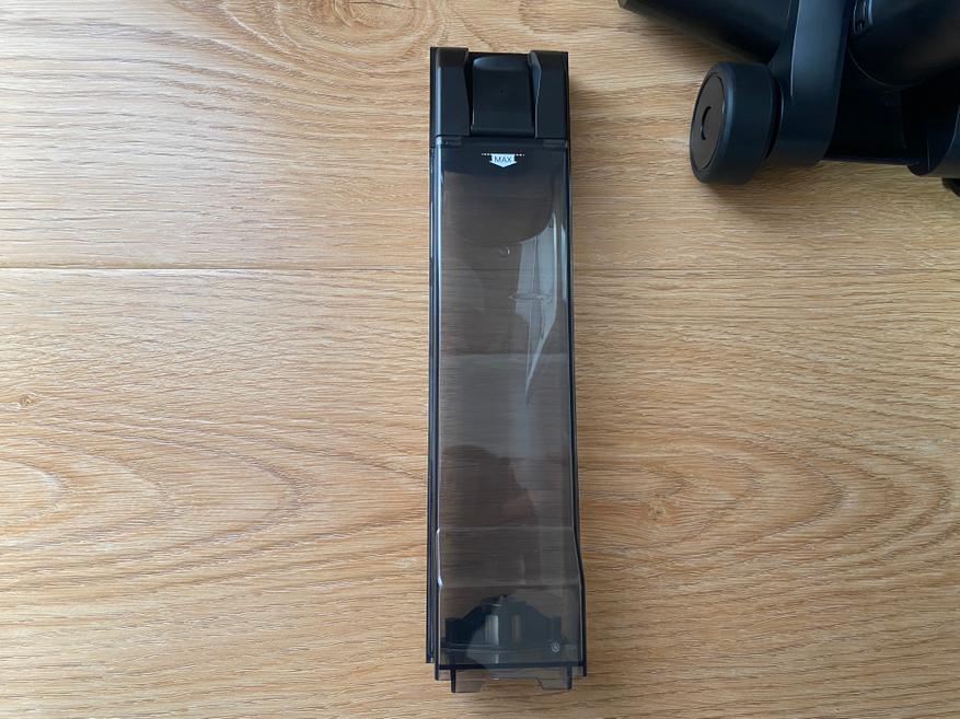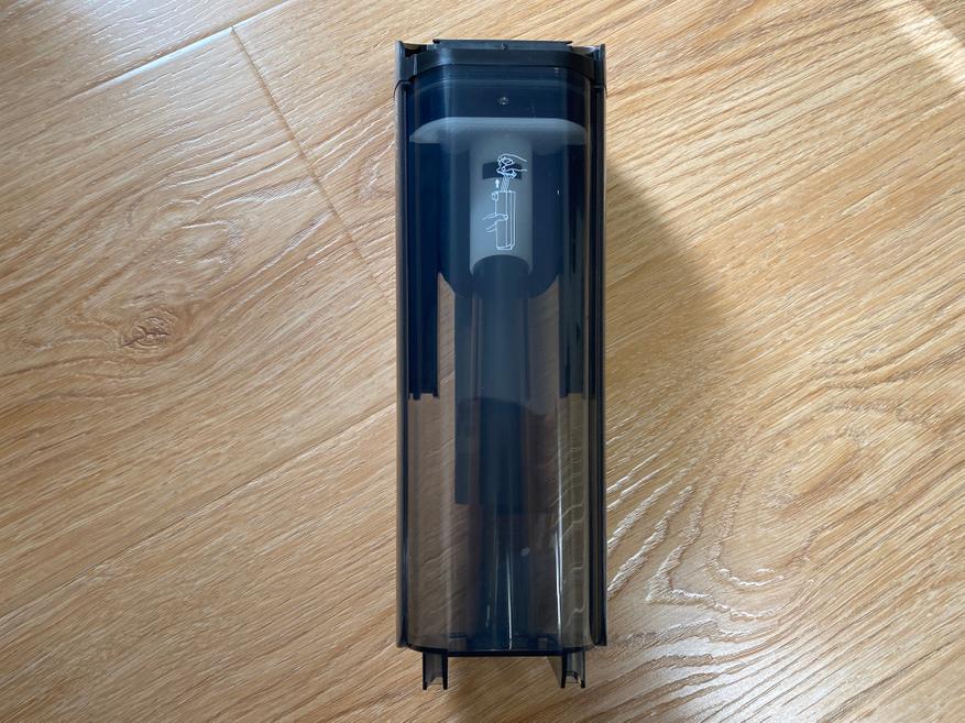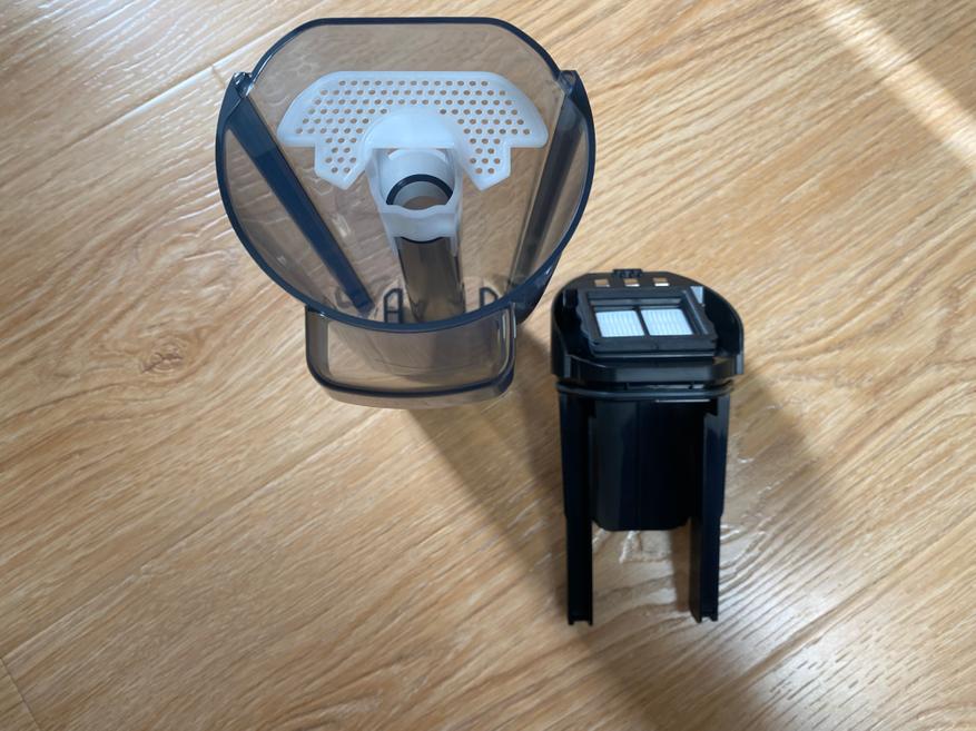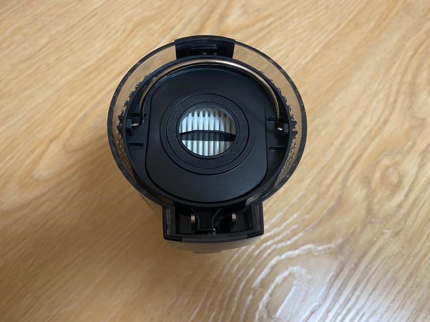 Контейнер для сбора мусора выполнен в цилиндрической форме и полностью сделан из пластика. Корпус полностью прозрачный и через него хорошо видно все содержимое. Во время уборки крупные частицы остаются в нижней части, а мелкая пыль оседает на металлической сетке. Чтобы вся пыль удерживалась внутри контейнера, используется 2 элемента очистки, поролоновый фильтр и НЕРА фильтр. Чтобы достать фильтрующий элемент, на верхней части имеется металлическая ручка.