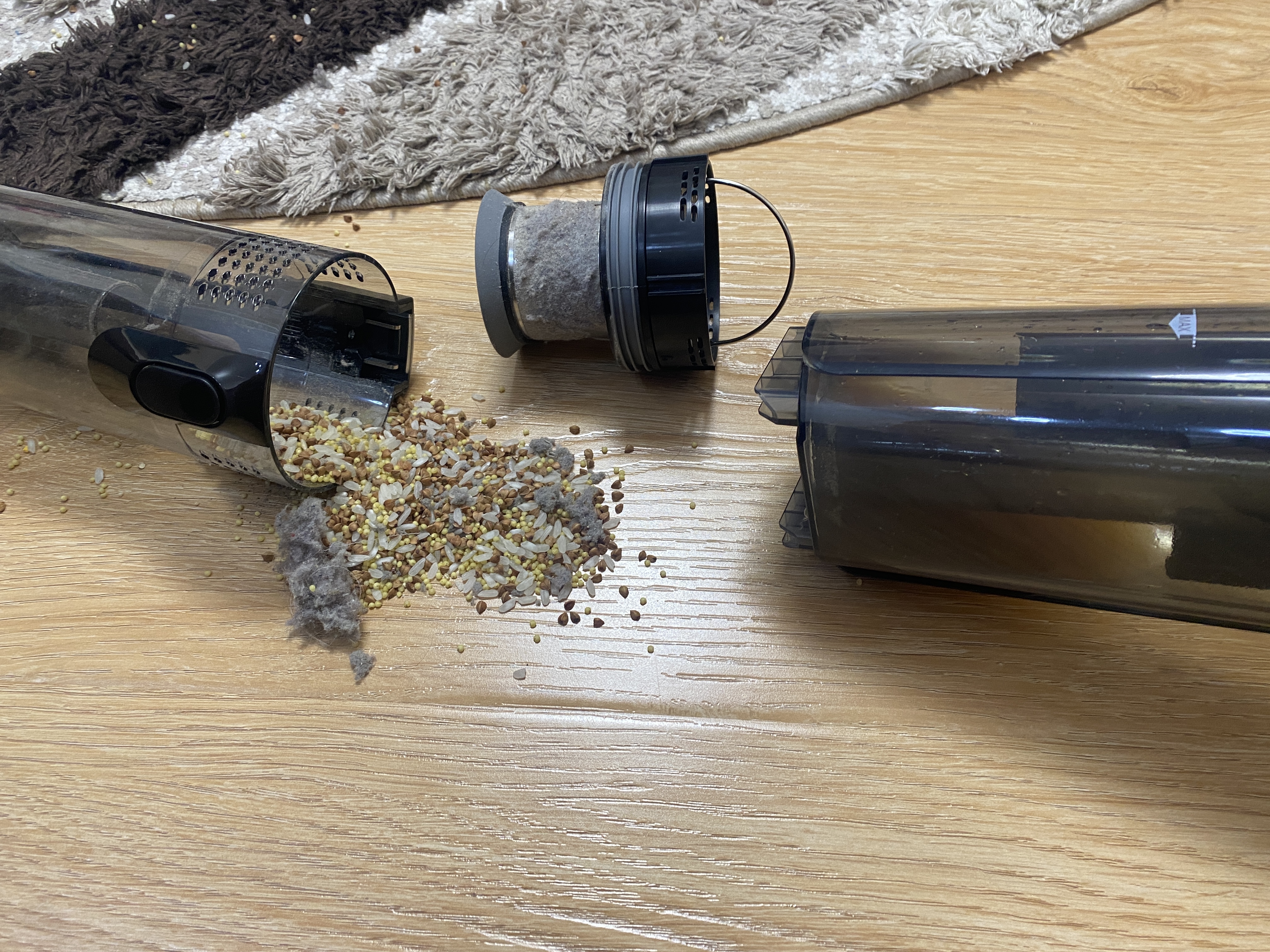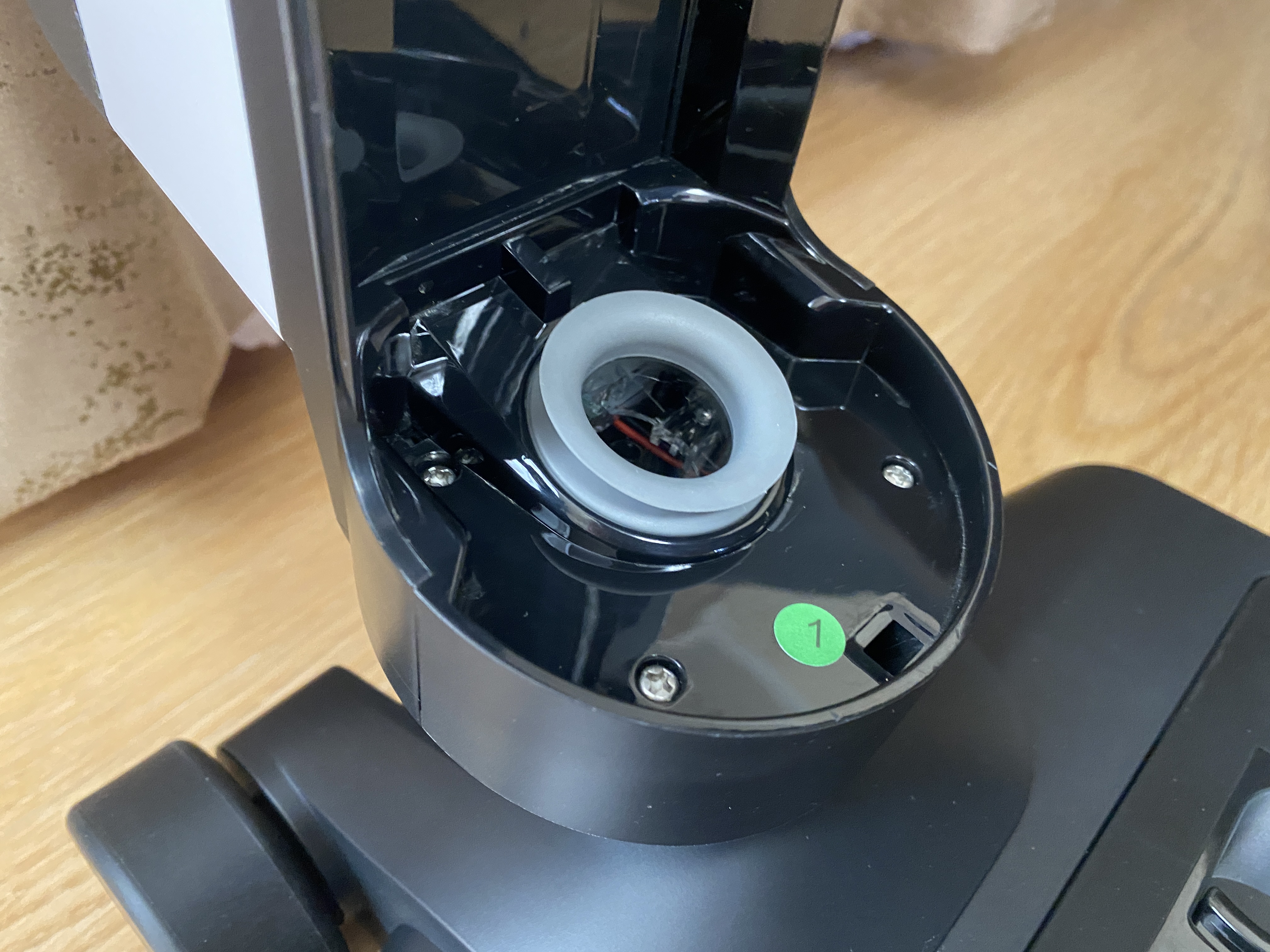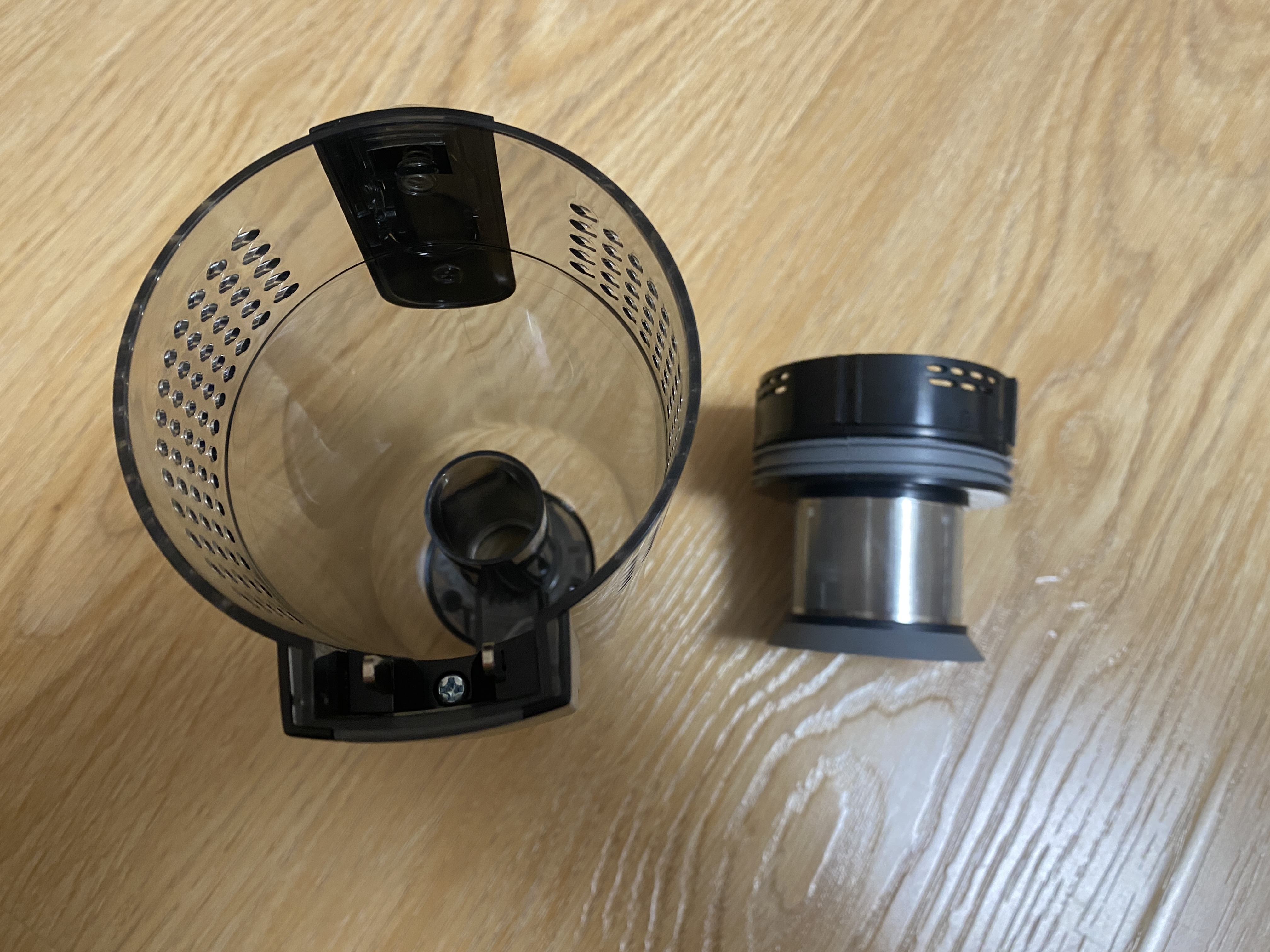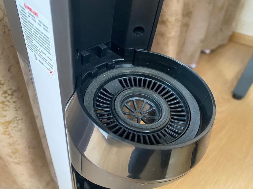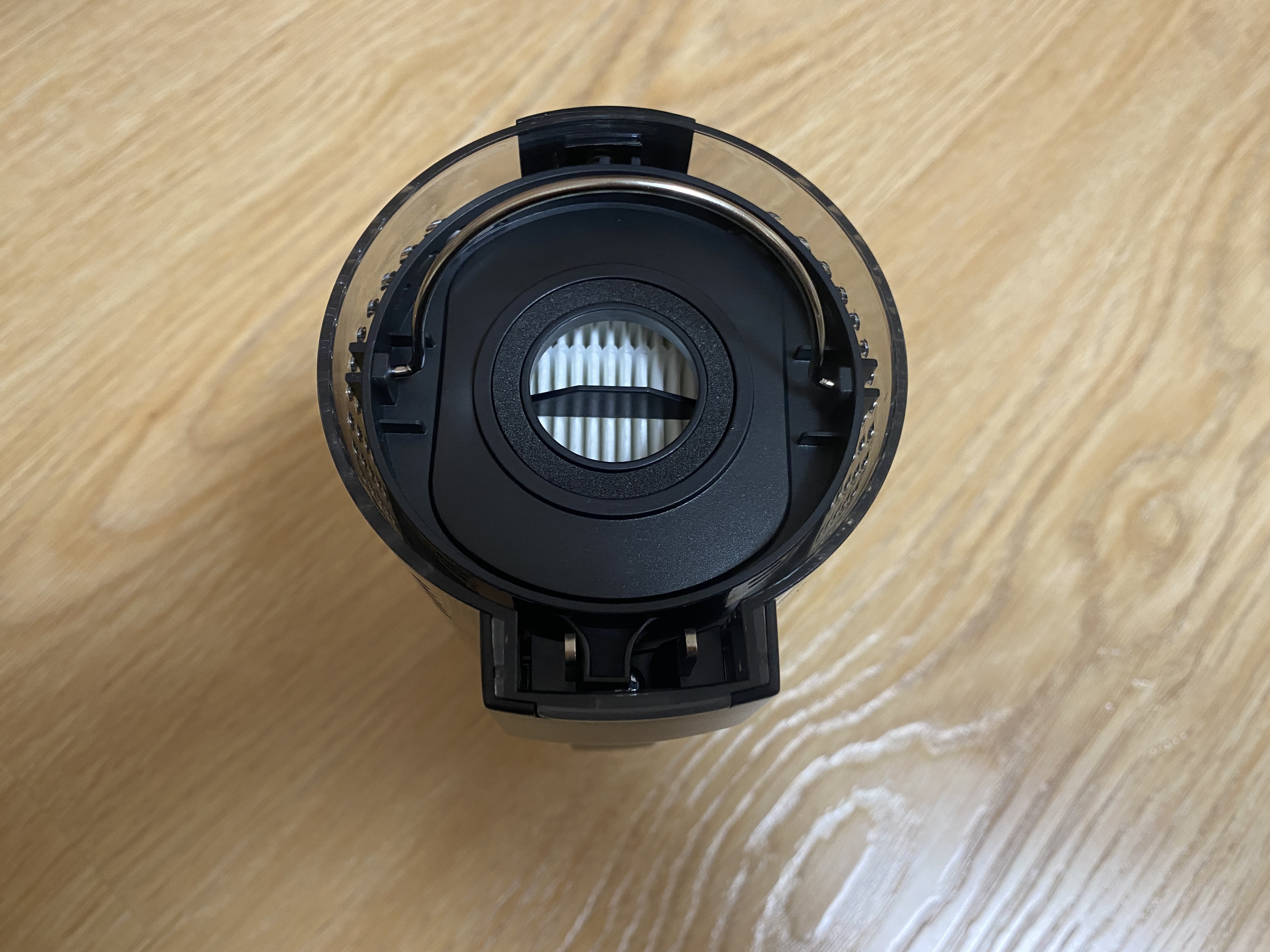 Контейнер для сбора мусора выполнен в цилиндрической форме и полностью сделан из пластика. Корпус полностью прозрачный и через него хорошо видно все содержимое. Во время уборки крупные частицы остаются в нижней части, а мелкая пыль оседает на металлической сетке. Чтобы вся пыль удерживалась внутри контейнера, используется 2 элемента очистки, поролоновый фильтр и НЕРА фильтр. Чтобы достать фильтрующий элемент, на верхней части имеется металлическая ручка.