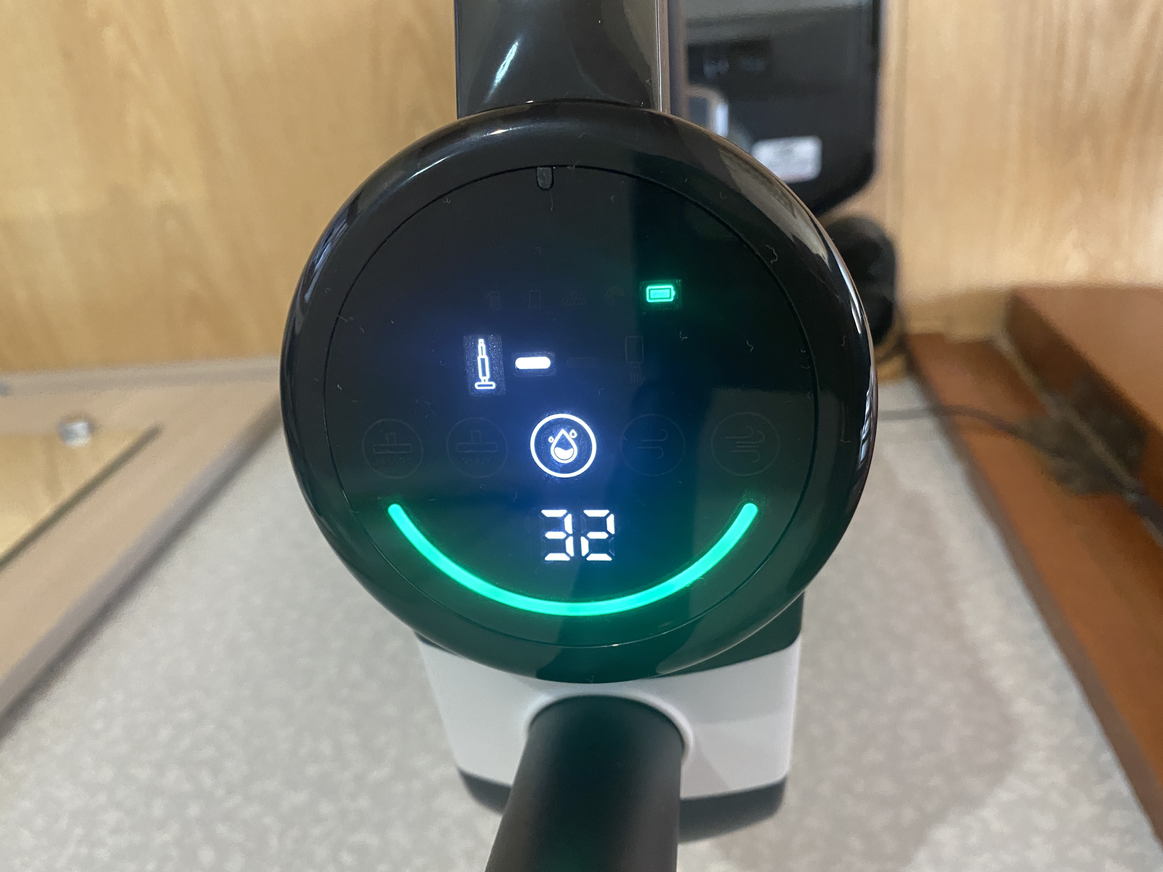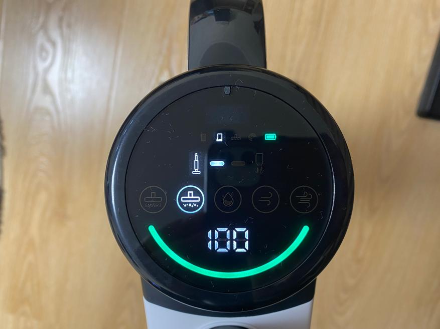 Индикаторы на дисплее: заполнения контейнера для сухого мусора, полное отсутствие воды, блокировка турбощетки, проблемы с датчиками, остаточный заряд аккумулятора крупными цифрами, режим самоочистки, индикатор MIN и MAX мощности всасывания, индикатор работы в полной сборке, индикатор работы в режиме ручного модуля. Также в нижней части дисплея есть индикаторная полоска, которая горит красным цветом если воздух после фильтра имеет большое количество пыли и фильтр сильно загрязнен, а если индикатор горит зеленым цветом, то количество пыли после фильтра минимально.