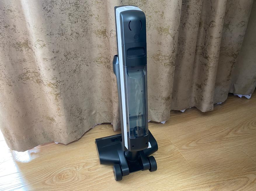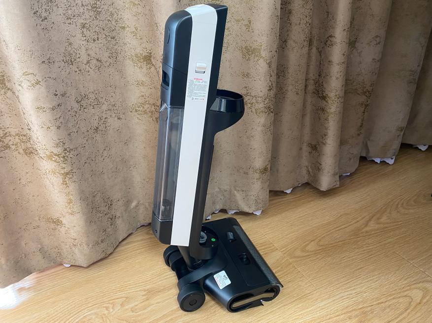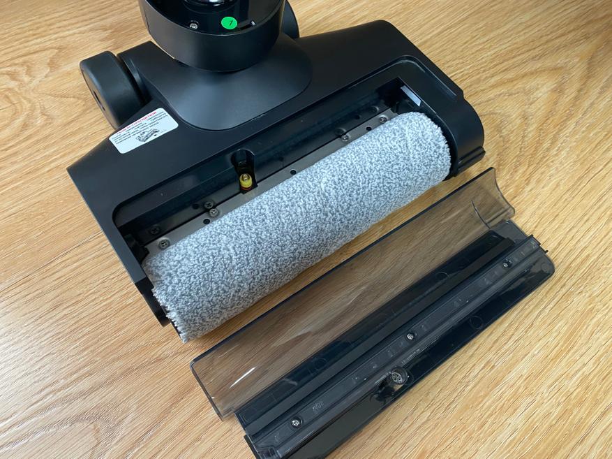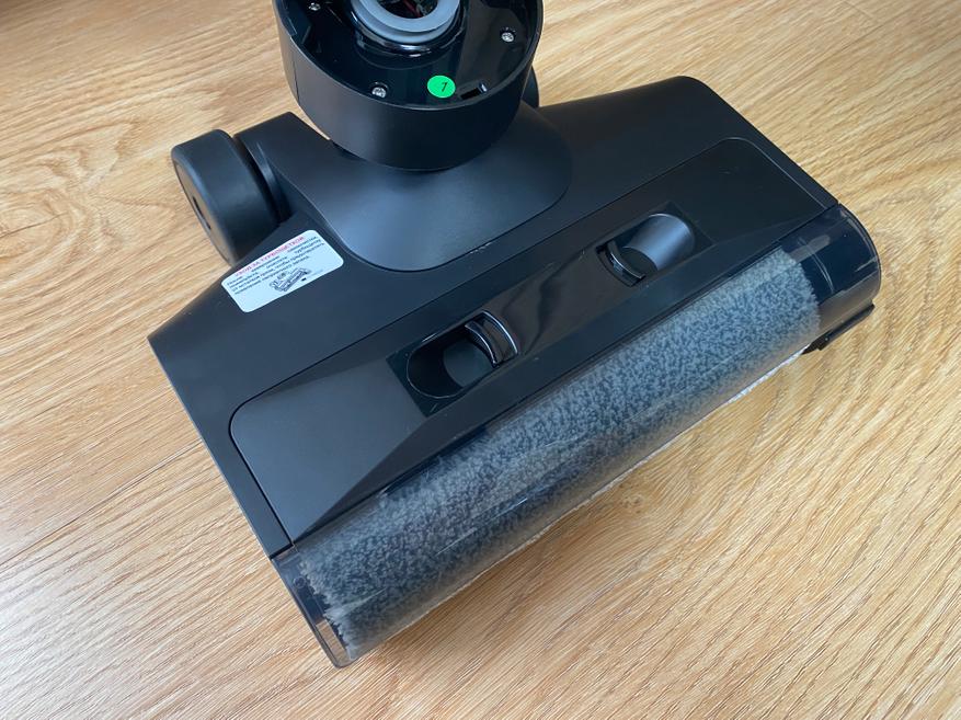 Резервуар для чистой воды оснащен удобной горловиной, благодаря которой набирать воду можно напрямую из-под крана. Объем резервуара для чистой воды составляет 0.6 литров, которого вполне достаточно для уборки всего напольного покрытия в квартире или доме общей площадью 52 квадратных метра. Резервуар для сбора грязной воды имеет на верхней части НЕРА фильтр. В нижней части расположена сама платформа с турбо-щеткой. Для удобного перемещения используются два боковых колесика и 2 маленьких вспомогательных колесика под платформой. Безрамочная конструкция щетки позволяет произвести уборку грязи и пыли вдоль стен или в труднодоступных углах. Сама щетка выполнена из мягкого ворса, который без особого труда собирает всю влагу и остатки мелкой пищи. На верхней части имеется пластиковый фиксирующий замок, отщелкнув который мы можем снять пластиковую крышку и извлечь щетку для последующей промывки. Данную процедуру выполнять необязательно, так как пылесос имеет станцию зарядки-самоочистки, на которой щетка прекрасно очищается за считанные минуты, а грязь попадает в резервуар (бак).