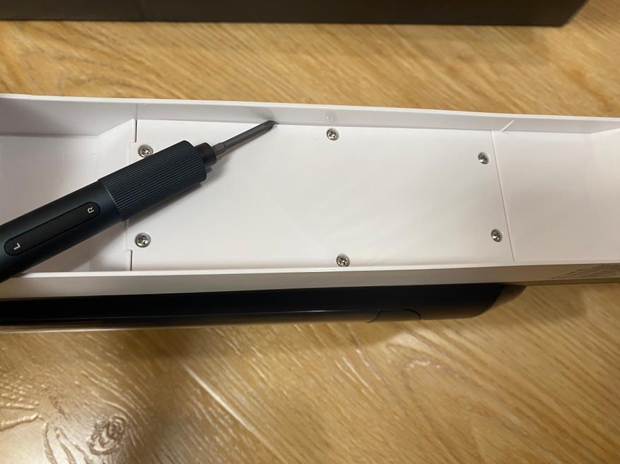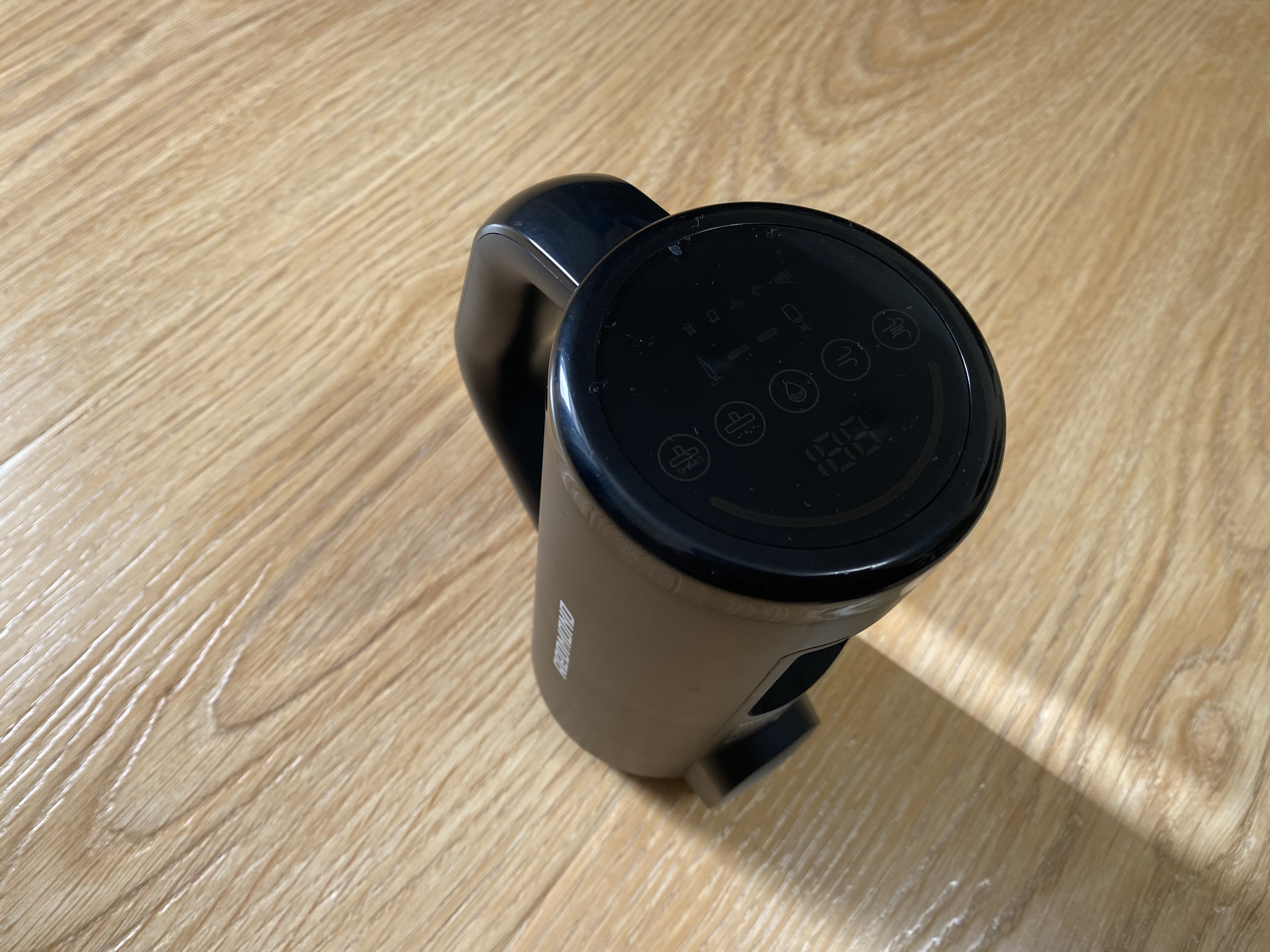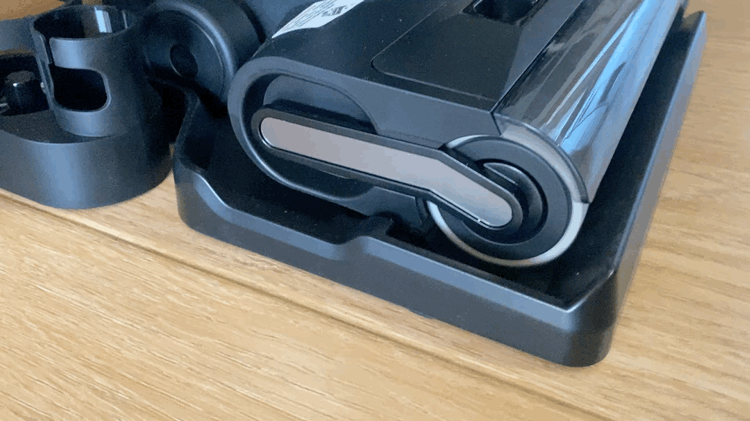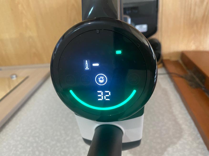 Моторный блок выполнен в черном цвете и имеет (D) образную форму. На рукояти имеются 2 кнопки, одна включает и выключает пылесос, а вторая используется для переключения уровня мощности всасывания. У данной модели пылесоса есть только 2 скорости, а именно экономичная и максимальная. Сразу отмечу, что уровень шума не сильно отличается, но эффективность уборка определенно увеличивается, собственно, как и потребление аккумулятора. На верхней части блока имеется дисплей с индикаторами работы пылесоса. Внутри блока стоит аккумулятор на 2500 мА*ч, которого хватает на 50 минут непрерывной уборки, но стоит понимать, что время работы будет напрямую зависеть от выбранного режима и метода уборки. Но скажу так, что 3-х комнатную квартиру можно без проблем пропылесосить и помыть полы и некоторое количество заряда еще останется. До 100 % аккумулятор заряжается за 240 минут.