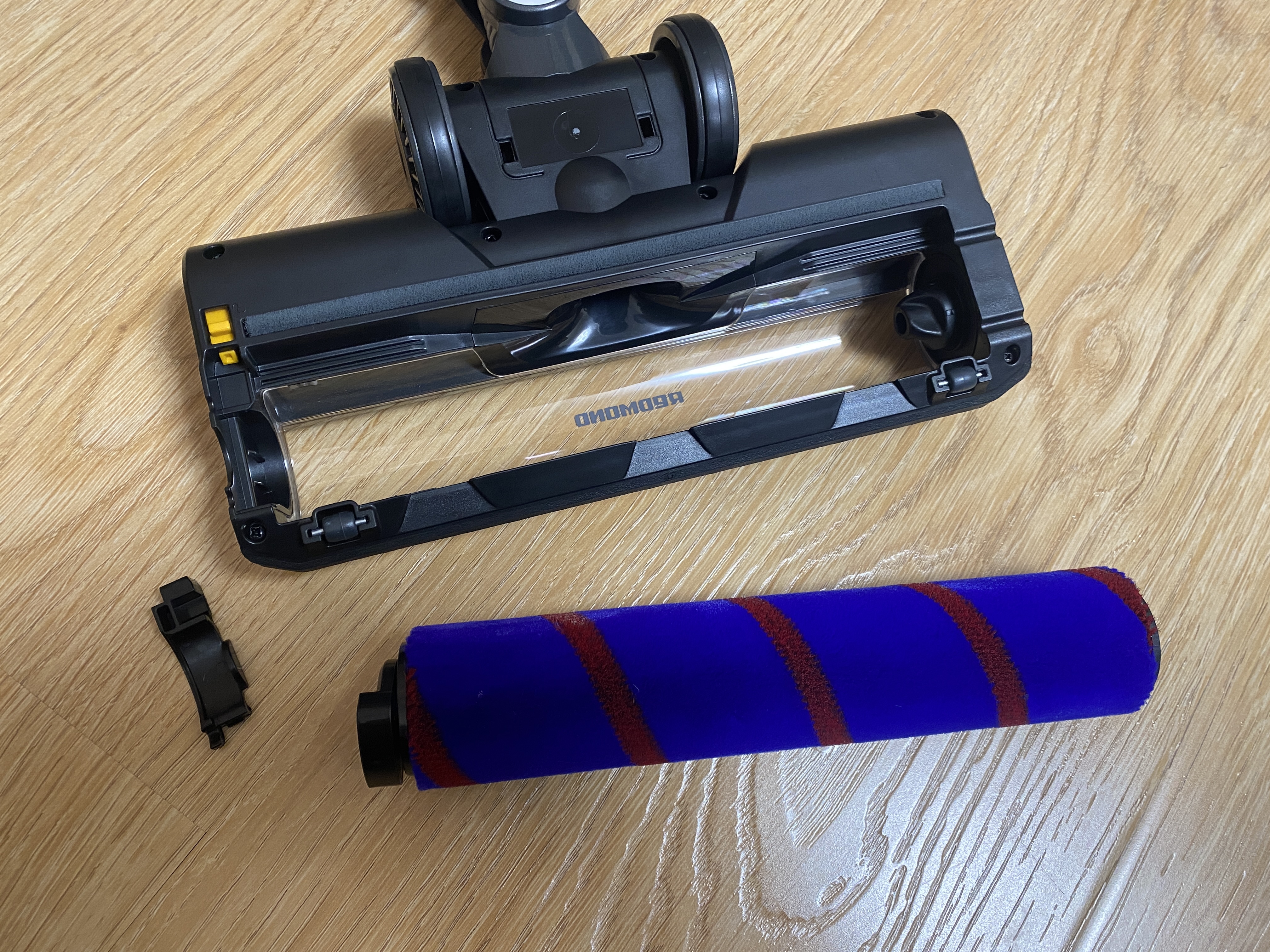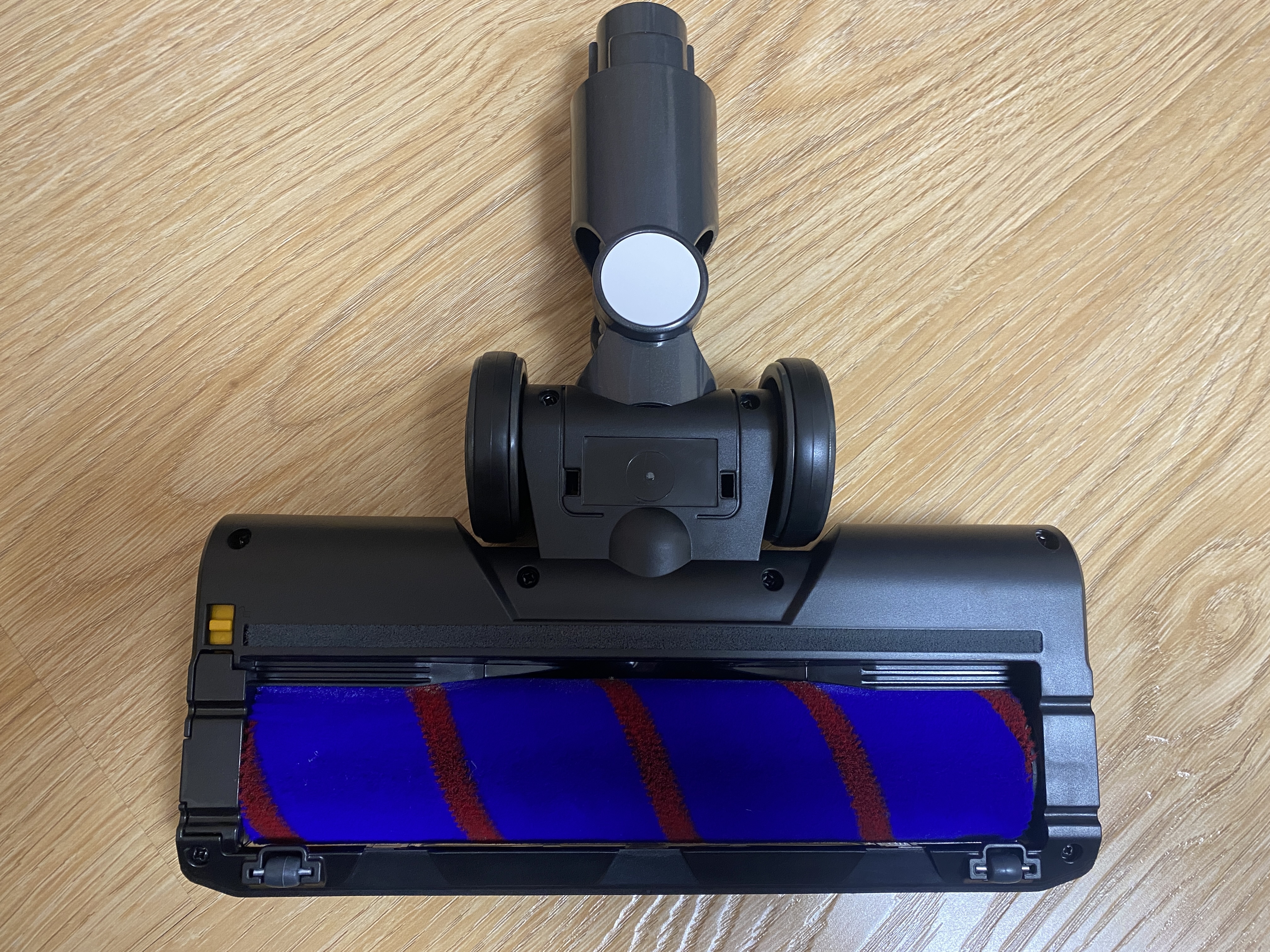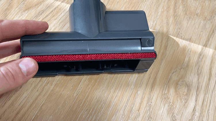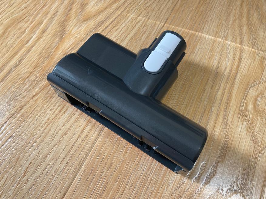 Основная насадка используется в основном для гладкого напольного покрытия и имеет один ролик из микрофибры. На передней части имеется светодиодная подсветка, которая отлично подсвечивает зону уборку, чтобы не упустить даже мельчающую пыль. Для того чтобы снять и помыть ролик нам необходимо открыть фиксатор и разблокировать пластиковый замок. С правой и левой сторон имеются массивные пластиковые колесики, которые также имеют резиновую вставку. На передней части также имеются миниатюрные ролики, которые также помогают перемещать насадку по полу. Для максимально эффективной уборки в труднодоступных местах имеется шарнирное крепление, которое позволяет изгибаться насадке вправо и влево на 45 градусов и назад-вперед примерно на 90 градусов.