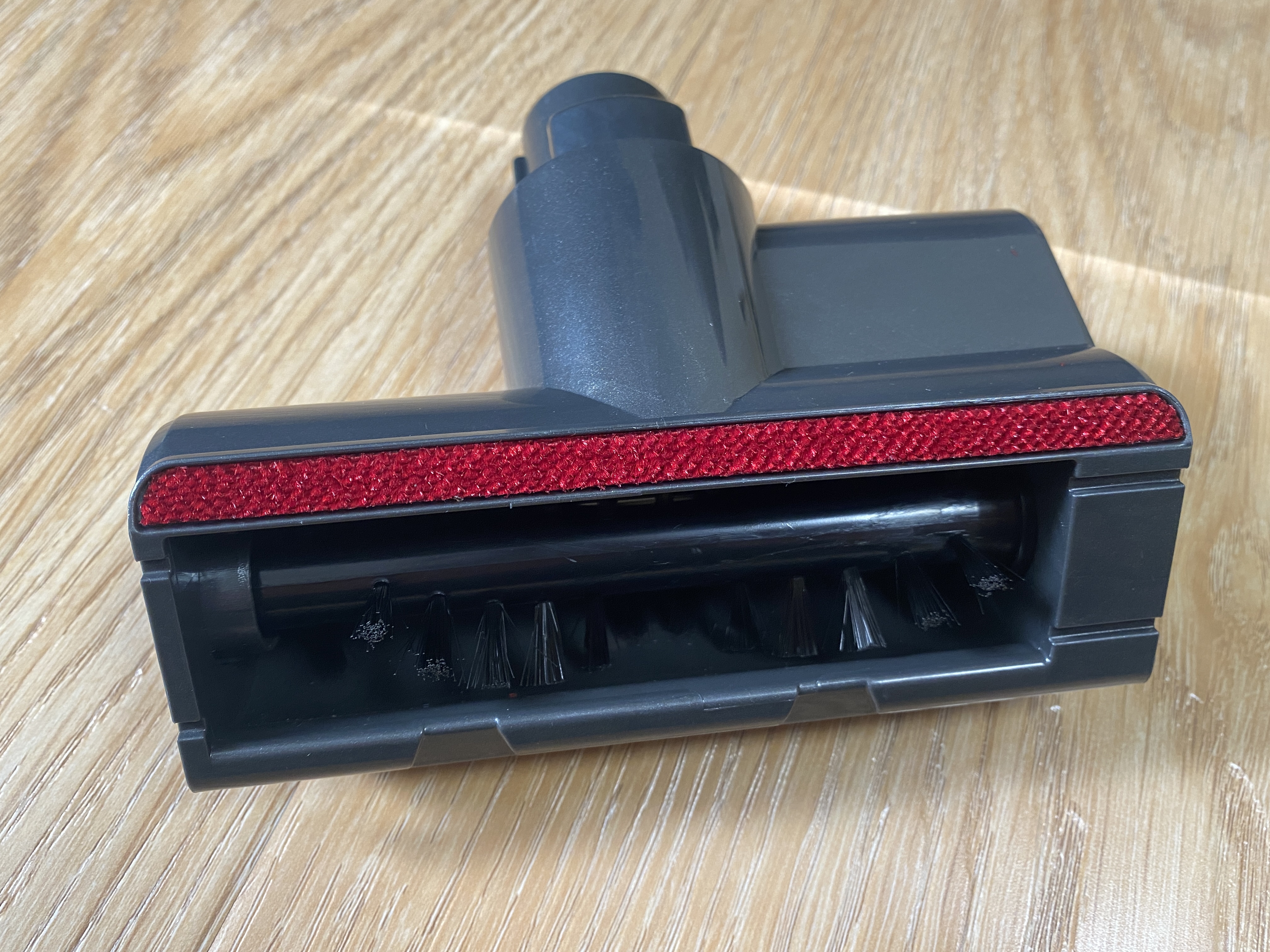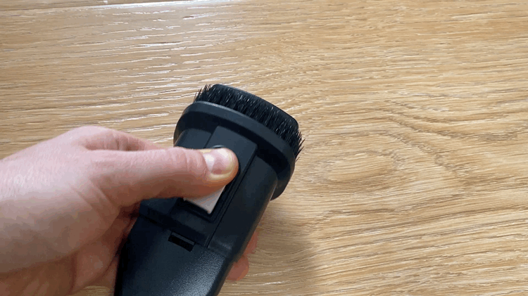 Электрощетка выполнена из пластика и имеет только электромотор и вращающий ротор с щеткой. Данная насадка отлично походит для уборки ковровых покрытий, очистки мебели. Для лучшего скольжения по поверхности используется велюровая накладка. Внутренняя щетка представляет из себя несколько рядов щетин в V-образной форме. Для того чтобы очистить щетку, пользователю необходимо открыть заглушку и извлечь пластиковый тубус с щетиной.