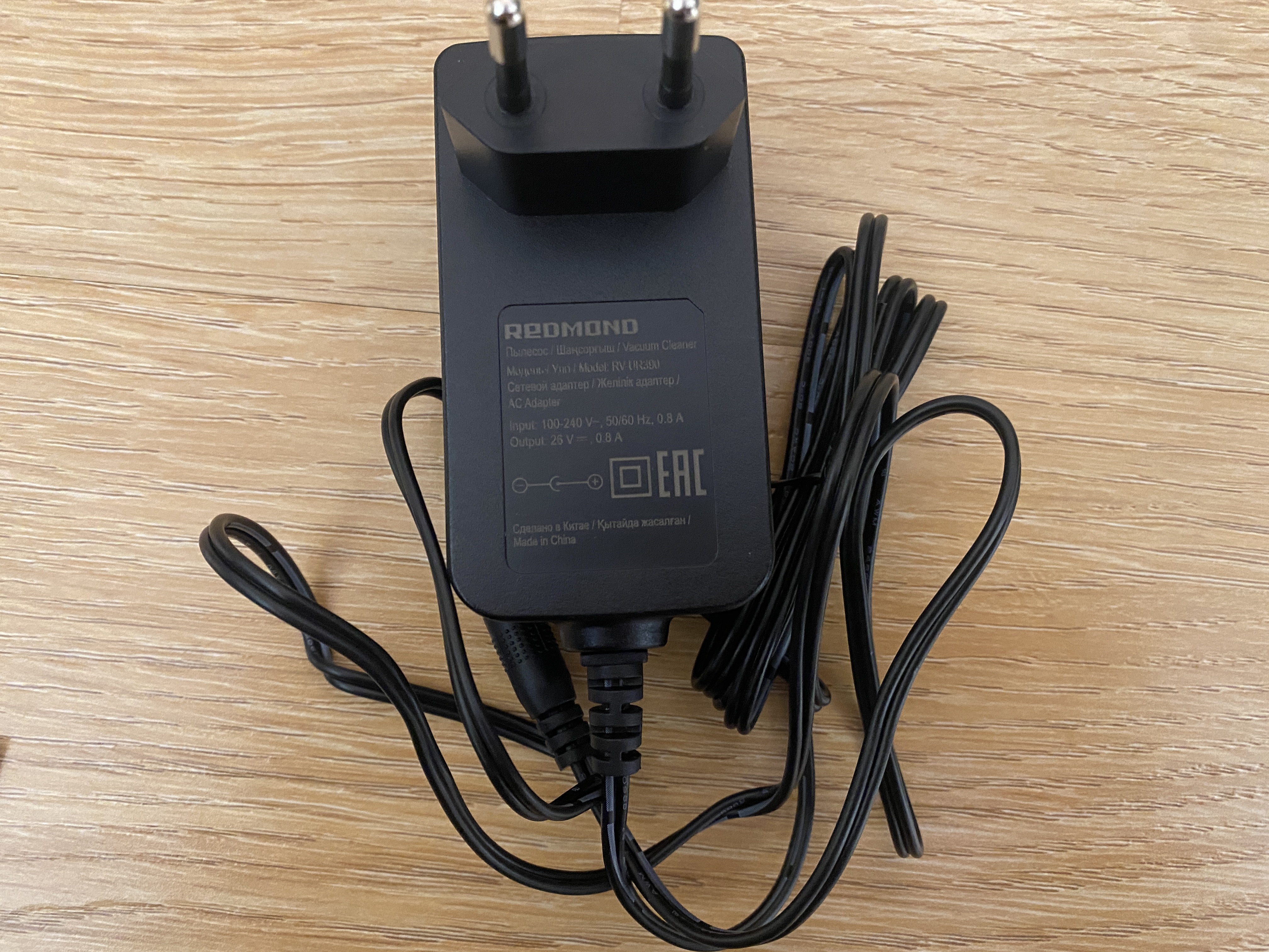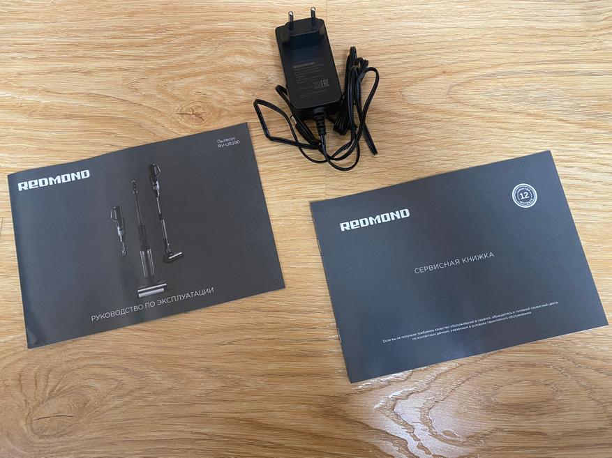 В комплекте, как уже говорилось выше, имеется дополнительный НЕРА фильтр и щеточка для ручной очистки труднодоступных мест пылесоса. Руководство пользователя полностью на русском языке и имеет не только рекомендации по использованию, но и подробную инструкцию по уходу и исправления ошибок или возможных поломок. Комплектный блок питания имеет довольно стандартную форму и имеет следующие выходные характеристики: 25 V — 0.8 А.