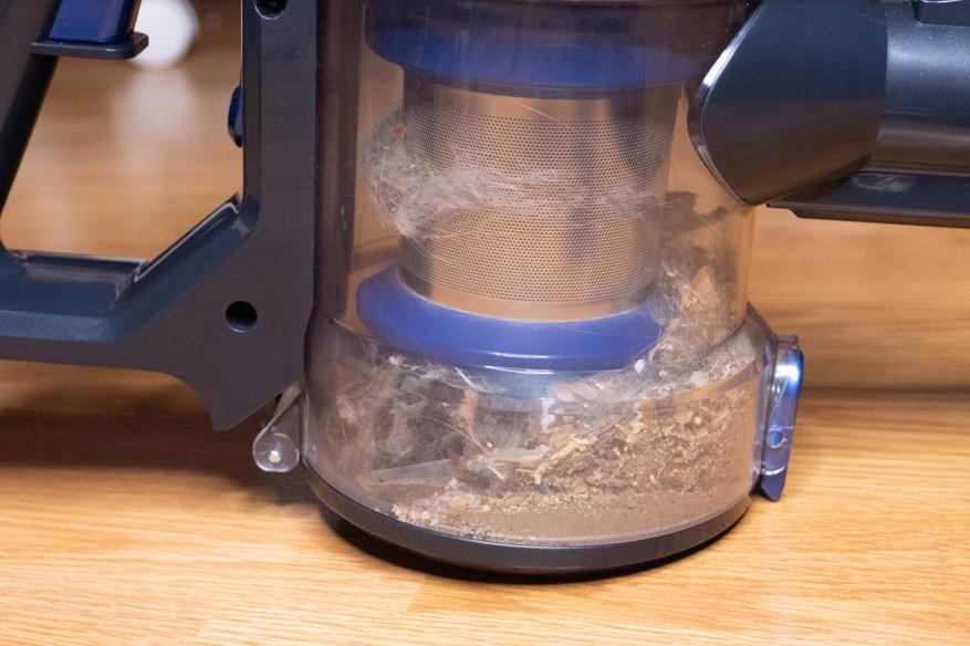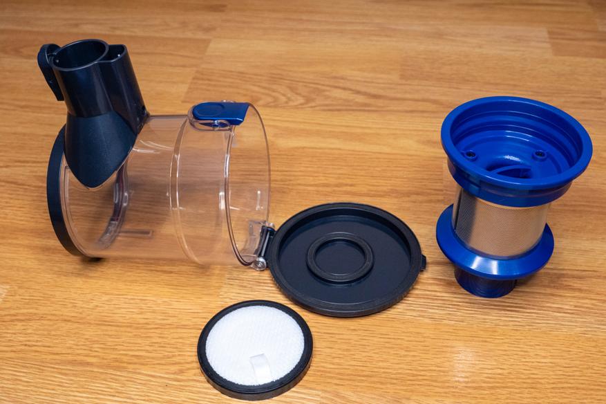 Циклонный сепаратор и фильтр тонкой очистки снимаются легко. Полную очистку рекомендуется проводить после нескольких уборок, а мусор можно вытряхивать просто открыв крышку нижнего отсека.