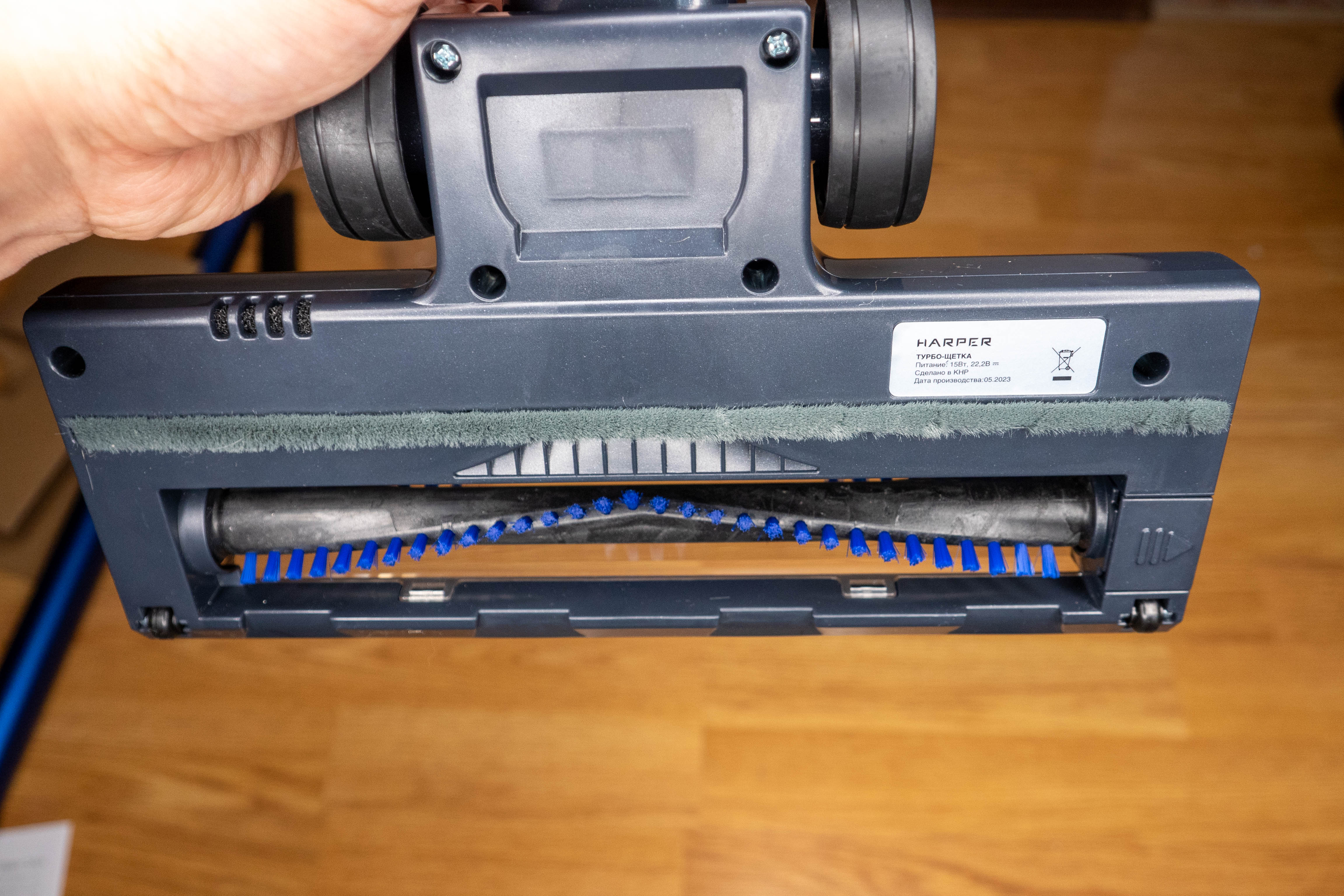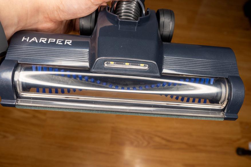 Мощность привода 15Вт, но внутри стоит редуктор, так что двигателя хватает, чтобы вращать валик при контакте с ворсовым покрытием. Над щеткой сделали прозрачное окошко, чтобы было удобно контролировать её засорение. В прошлом пылесосе в этом месте был черный пластик и приходилось переворачивать насадку для проверки.