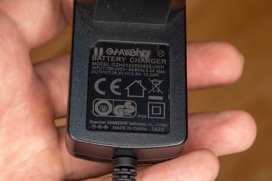 Основная электронная начинка находится в аккумуляторе, поэтому в коннекторе столько контактов. Напряжение батареи 22.2В, ёмкость 44.4Втч или 2000мАч, чего хватает до 40 минут работы в экономичном режиме. Заряжается аккумулятор блоком питания 26.5В и током 500мА, с нуля до 100% процесс занимает 5 часов.