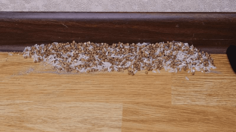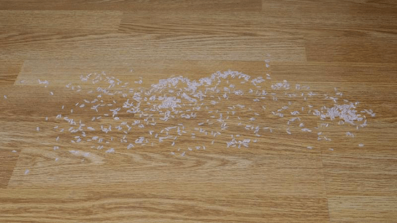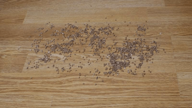 У нас в доме нет ковров, так что мусор раскидывал на ламинат. Рис собрал без каких-либо проблем на первом уровне мощности, после выключения питания ни одного зернышка не высыпалось из щетки.