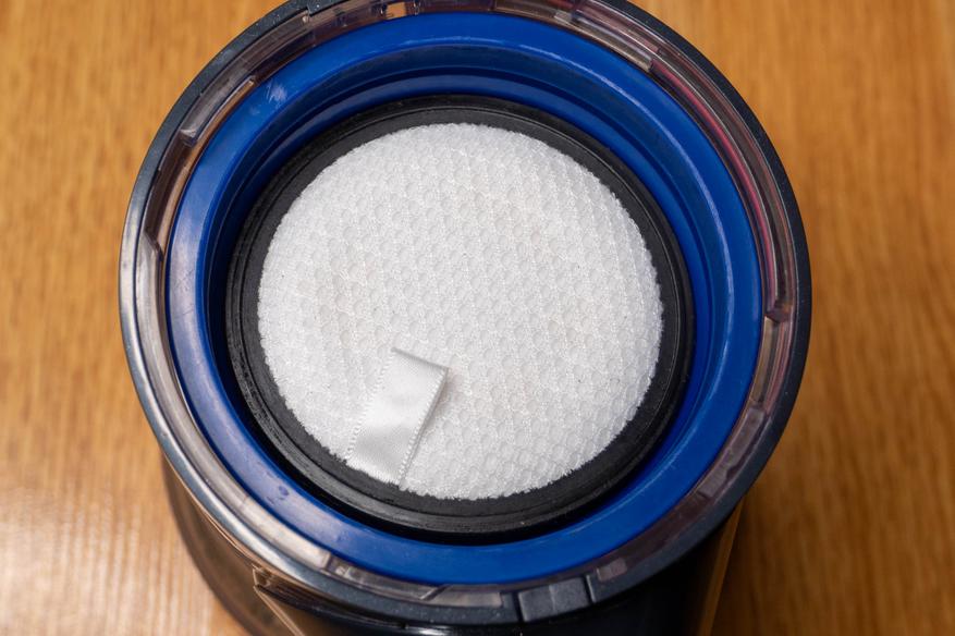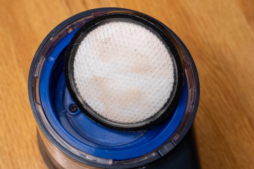 Благодаря этому нет нужды в постоянных полных чистках и после уборки достаточно опустошить контейнер, нажав на кнопку в нижней части, которая открывает крышку. Вот сколько всего я смог собрать, пропылесосив полы, диван и кресла. В доме помимо нас живут два кота и ребенок, так что пылесосить приходится частенько. С внешней стороны фильтр тонкой очистки сохранил свой первоначальный вид, а вот с обратной совсем немного запачкался. Кстати, в моем случае подошли запасные фильтры от моего старого пылесоса, видимо используется какой-то распространенный типоразмер.