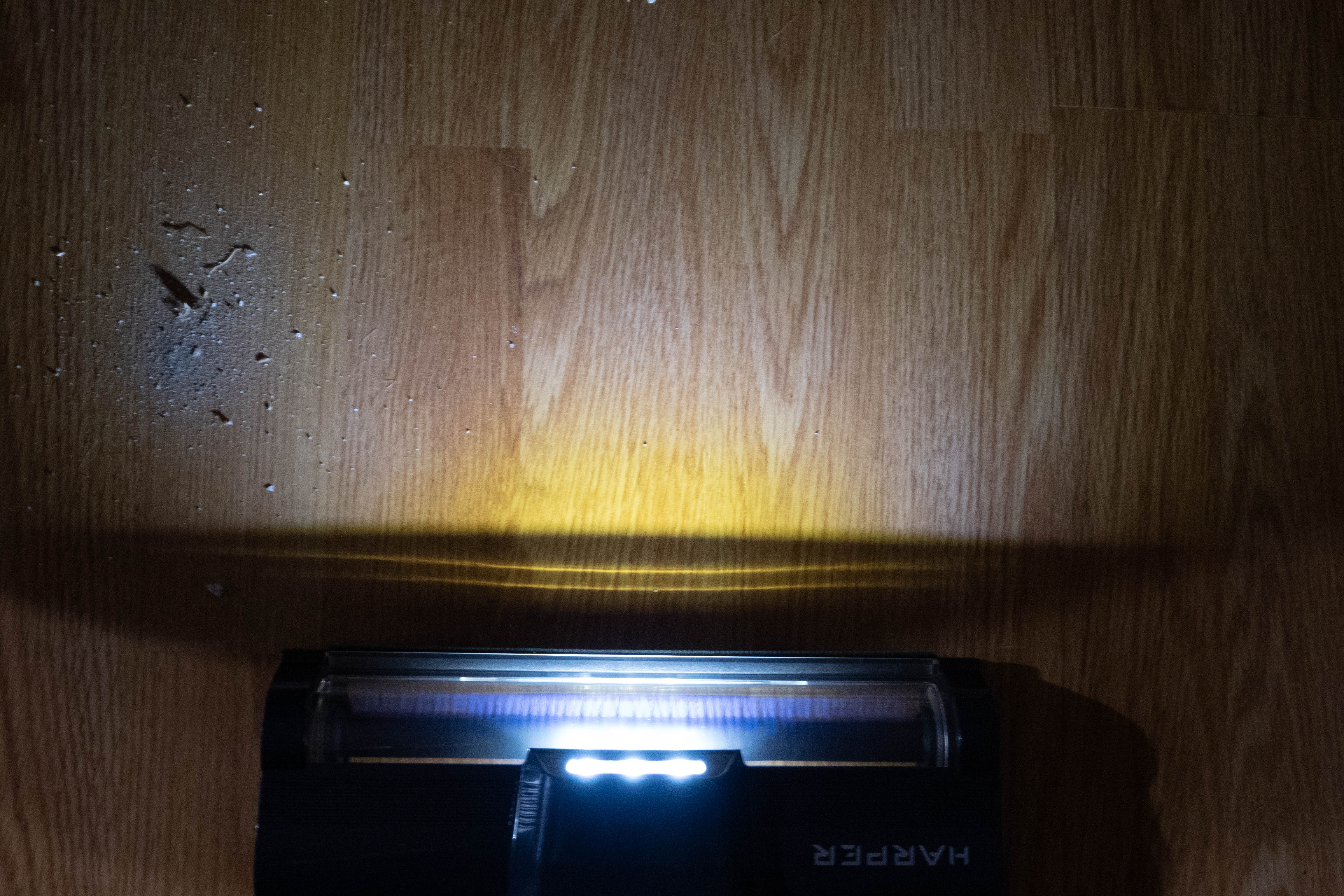 В верхней части имеется светодиодная подсветка. Излучатели не очень мощные, но если приглушить свет, сантиметрах в 30 мусор выделяет.