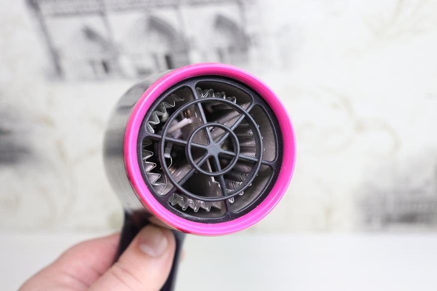 С задней стороны фена можно наблюдать рабочие лопасти вентилятора, которые и создают воздушный поток. В данном случае лопасти вентилятора изготовлены в общем цветовом стиле изделия.