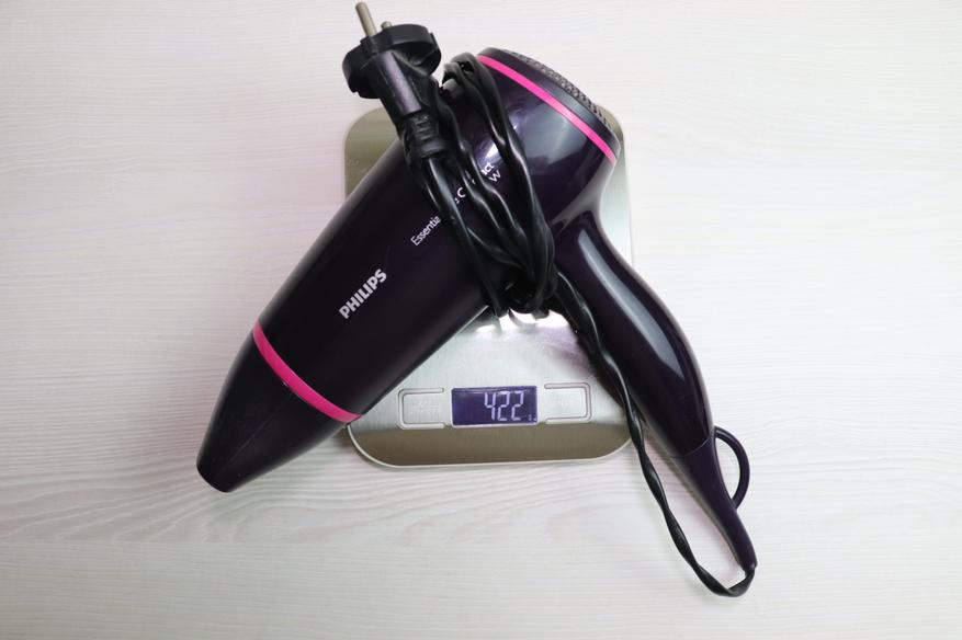 Конечно, брать с собой в дорогу такой фен не совсем удобно, но при необходимости его без проблем можно кинуть в сумку, при этом он не займет там много места. Также добавлю, что вес изделия с насадкой и кабелем составляет 422 грамма.