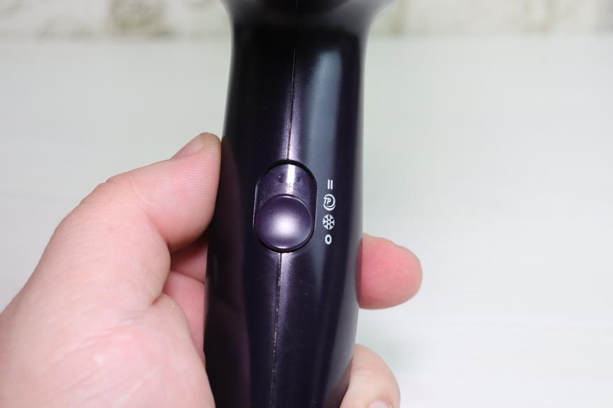 Как я и говорил выше, фен в использовании мне очень нравится. Фен имеет две рабочие скорости и три температурных режима. Первая позиция тумблера имеет пентаграмму «снежинки», и логично предположить, что при этом режиме фен будет гнать исключительно холодный воздух. Однако, он все равно незначительно и малозаметно подогревает воздух, и это я считаю очень продуманным решением. В таком режиме удобно сушить волосы летом или использовать фен тем людям, у кого волосы не любят высоких температур. Второй режим с пентаграммой «TP» для меня является самым используемым, при этом фен включает максимальную скорость вращения вентилятора и еще больше подогревает воздушный поток. А вот при включении третьего режима воздух из фена становится очень горячим и его проблематично использовать продолжительное время. Возможно, кому-то такой режим подойдет, но у нас в семье его никто не использует.