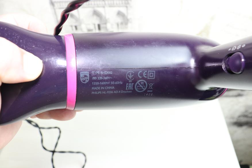 Условно с нижней части фена производитель нанес малозаметную маркировку с краткими техническими характеристиками устройства.