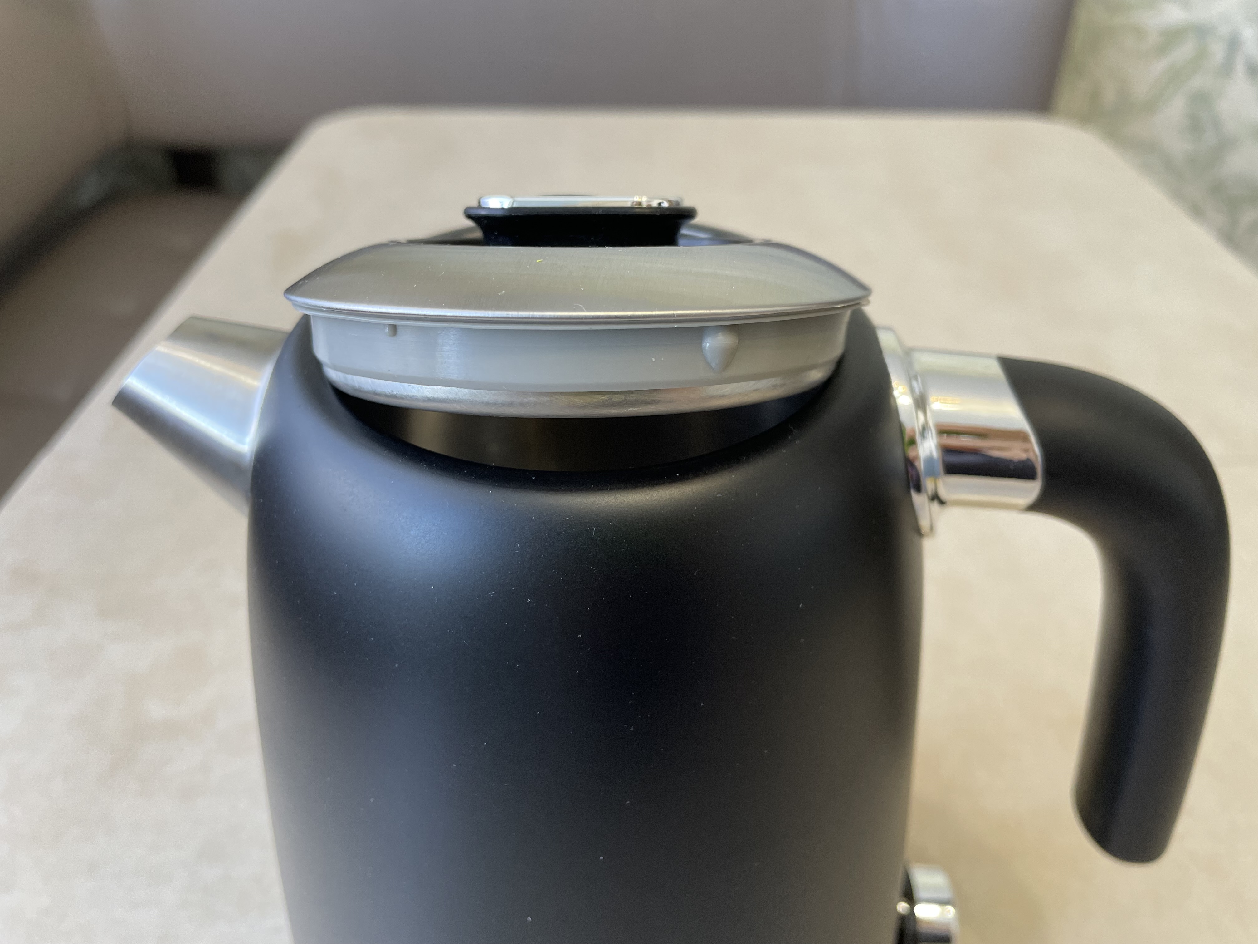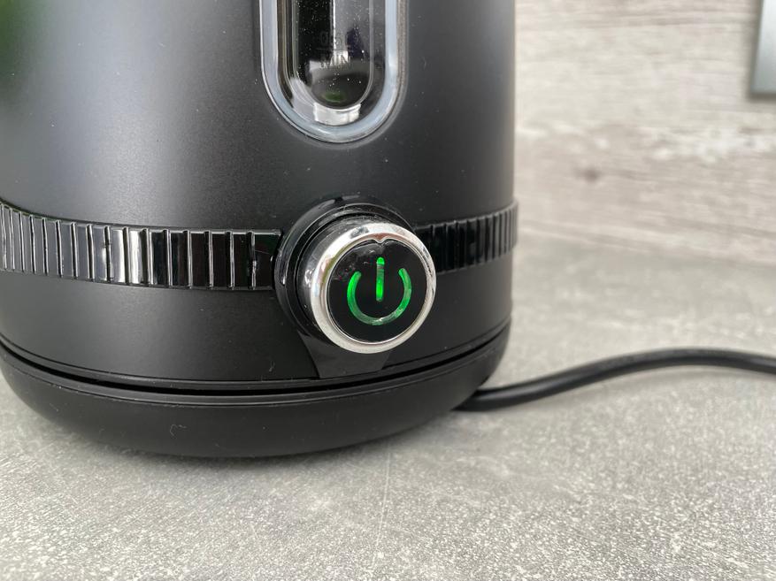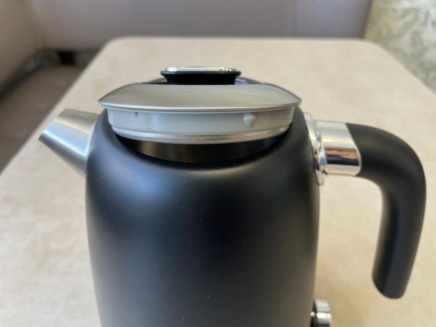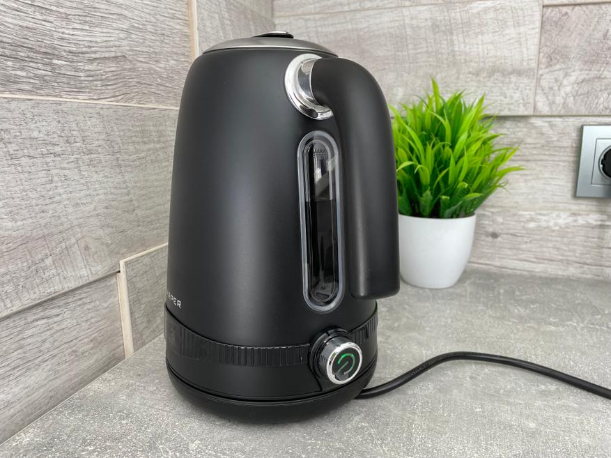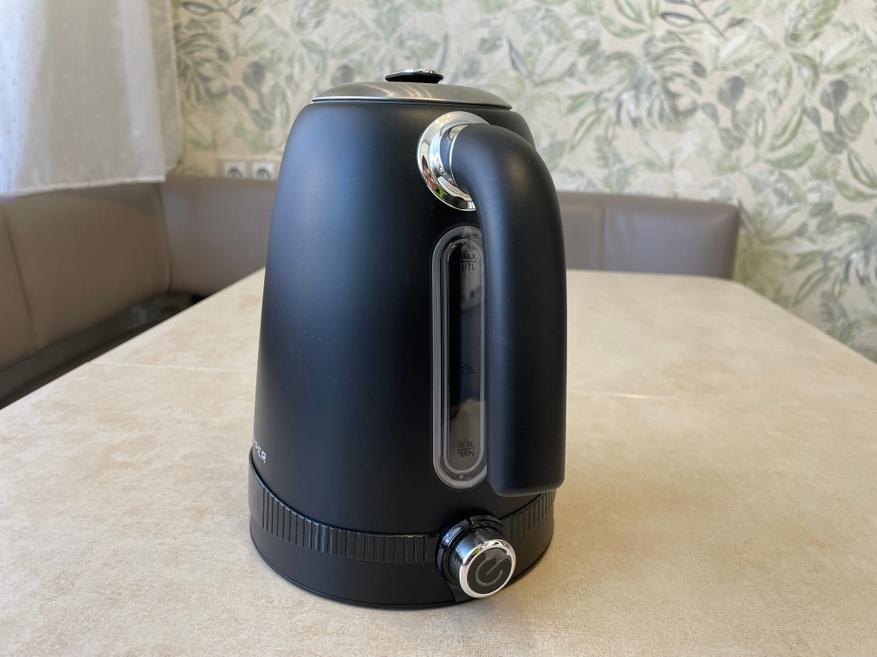 Полностью в черном цвете чайник выглядит необычно. Корпус выполнен из нержавеющей стали. Сбоку на корпусе имеется терморегулятор и окошко для контроля воды MIN 0,5л и MAX 1,7л. Ручка чайника выполнена из черного пластика с металлической вставкой на месте соединения к корпусу. Носик и крышка чайника так же выполнены из нержавеющей стали, цвет металлик. Внутри на носике установлен съемный фильтр от накипи. Крышка полностью съемная. Для плотного закрывания имеет прорезиненную основу. Внизу чайник имеет дисплей который показывает текущую температуру воды. Температуру можно регулировать от 40 до 100 градусов с интервалом в 10 градусов. Включается чайник сенсорной кнопкой, она расположена на регулировке температур. А переключение температуры происходит вращением "регулятора температуры".
