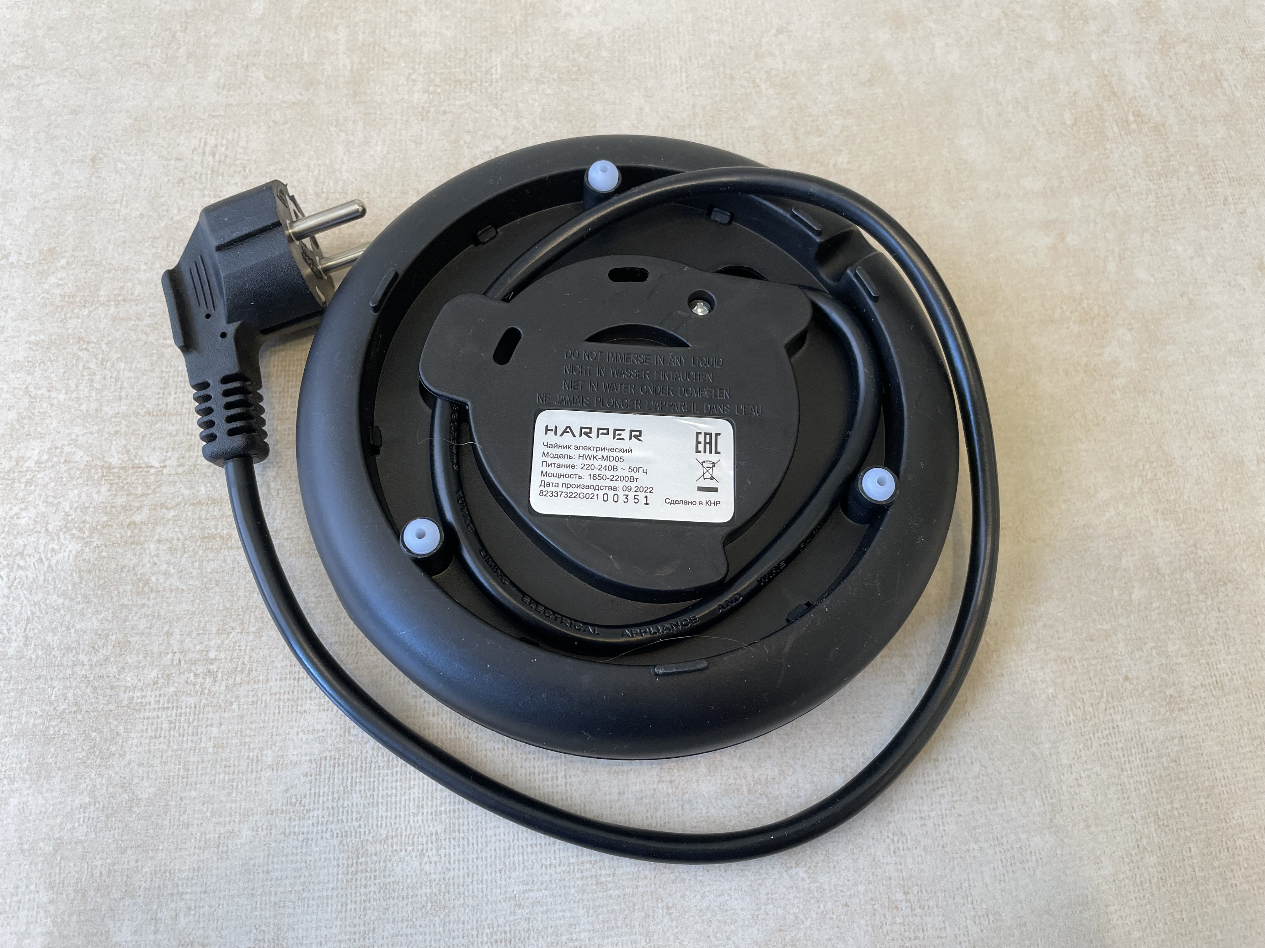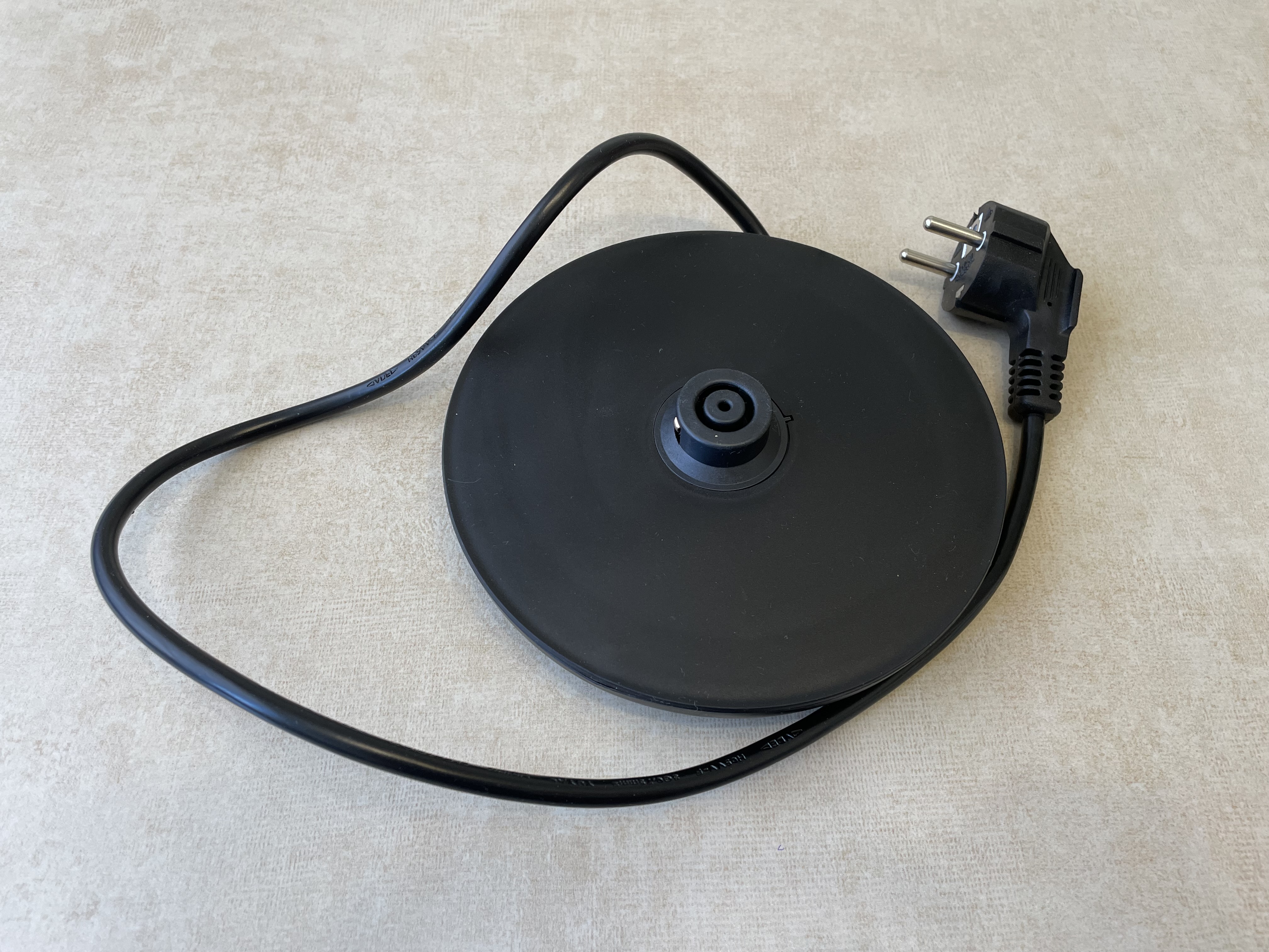 Подставка под чайник изготовлена из черного пластика и имеет три обрезиненных ножки. Длина шнура стандартная 65 см. Можно регулировать делая ее короче, накручивая шнур на внутреннюю катушку подставки.
