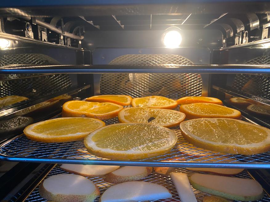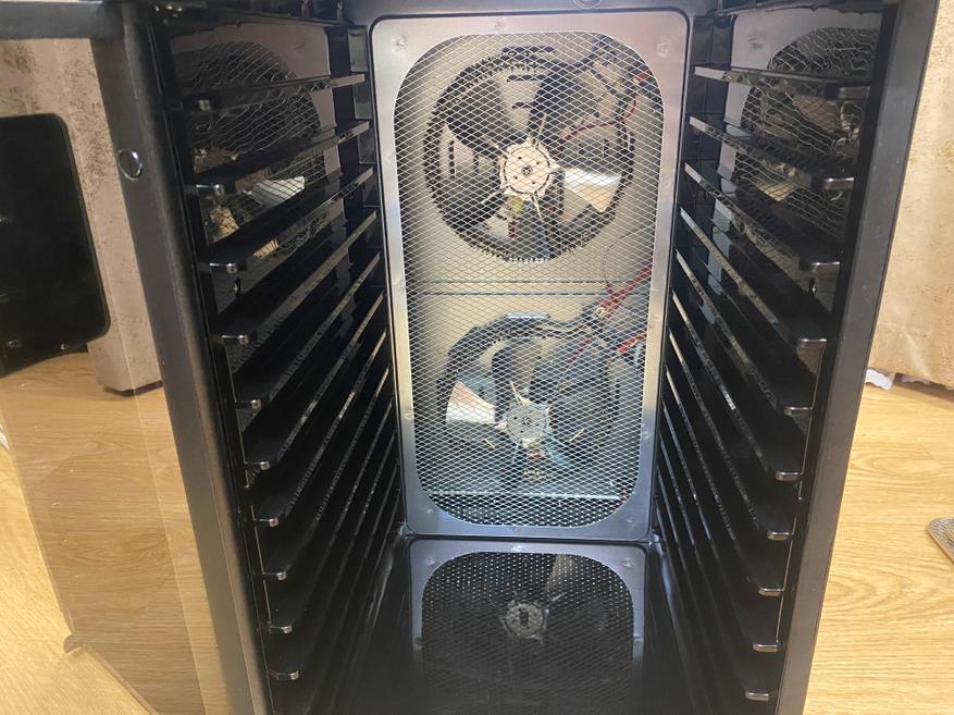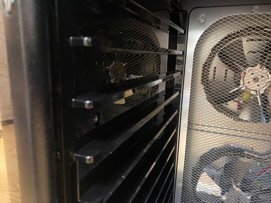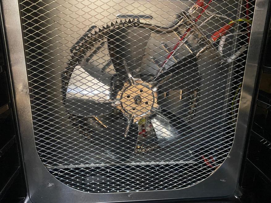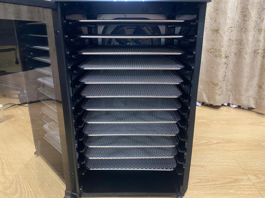 Внутренняя камера имеет максимальный объем 70 литров и имеет 12 уровней для установки разнообразных поддонов. Все направляющие сделаны из толстого пластика. В глубине дегидратора установлены нагревательные элементы и 2 больших вентилятора с металлической крыльчаткой, которая имеет 5 больших лопастей, которые имеют небольшой изгиб. Благодаря двойному обдуву обеспечивается равномерная сушка продуктов, а благодаря горизонтальному воздушному потоку смешивания запахов исключается, а это значит, что можно одновременно готовить несколько видов разнообразных продуктов. Для безопасности, вентиляторы закрыты металлической сеткой, которая предотвратит нежелательный травматизм или повреждения поддонов.