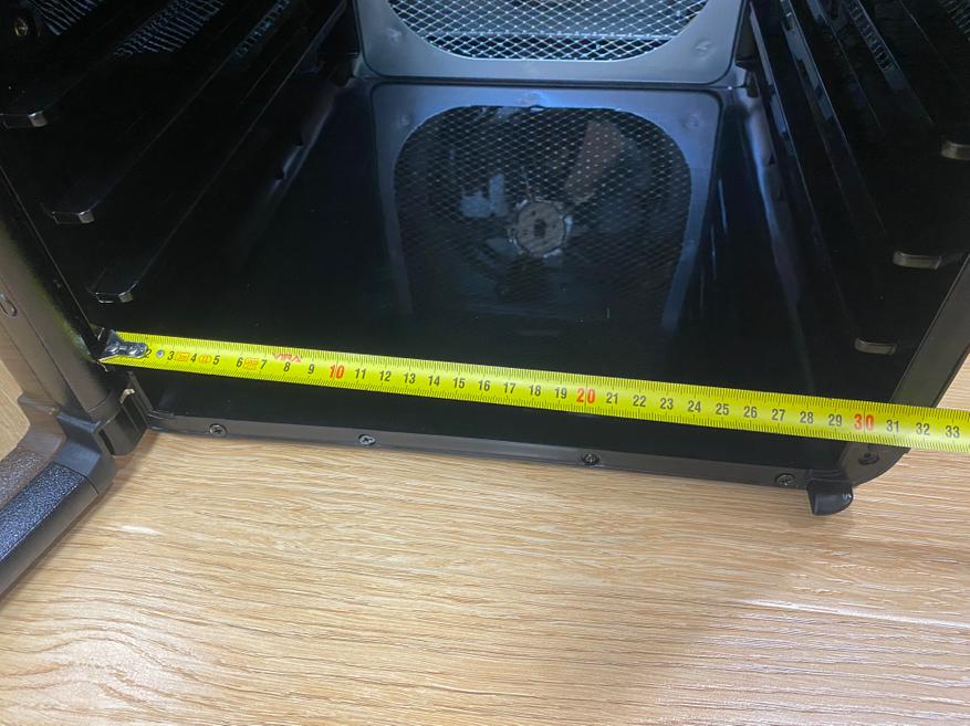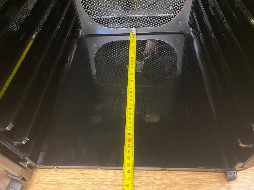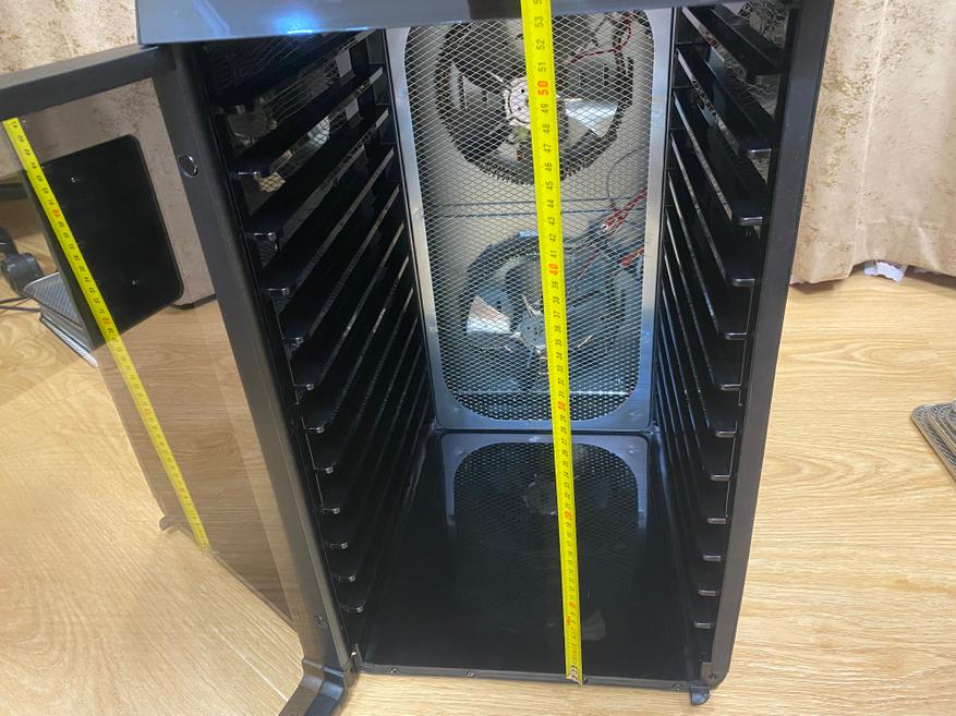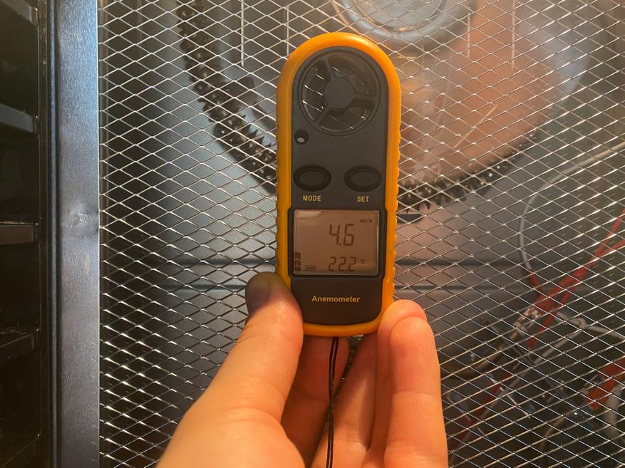 При помощи анемометра замерил силу воздушного потока. При максимальном приближении к вентиляторам получаем 4.6 метра в секунду, а при максимально-доступном отдалении получает 3.0 метра в секунду.