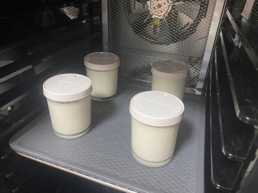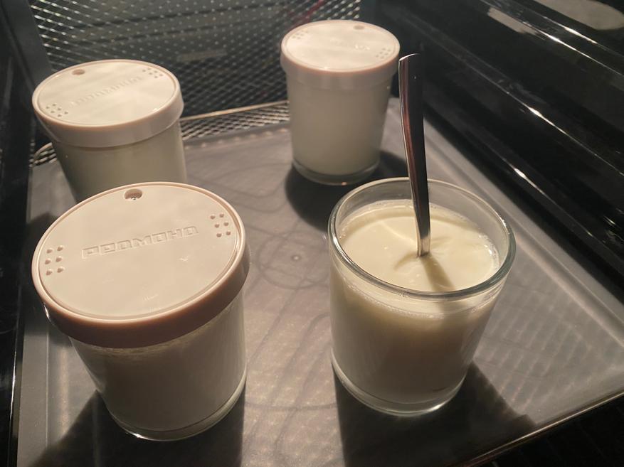 Далее попробуем приготовить домашний йогурт. Для этого нам необходимо заранее приобрести закваску для йогурта и молоко с любым % жирности. Молоко подогреваем до 40 градусов и разводим в нем закваску по рекомендациям указанным на пачке закваске, далее разливаем по формочкам и помещаем в дегидратор. Выбираем режим «ЙОГУРТ» и ожидаем 8 часов. По истечению времени (8 часов) получаем йогурт, который имеет срок гордости — 5 суток (смотреть рекомендации на упаковке выбранной закваски).