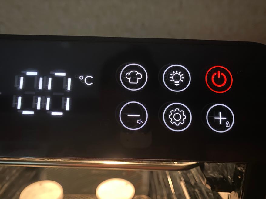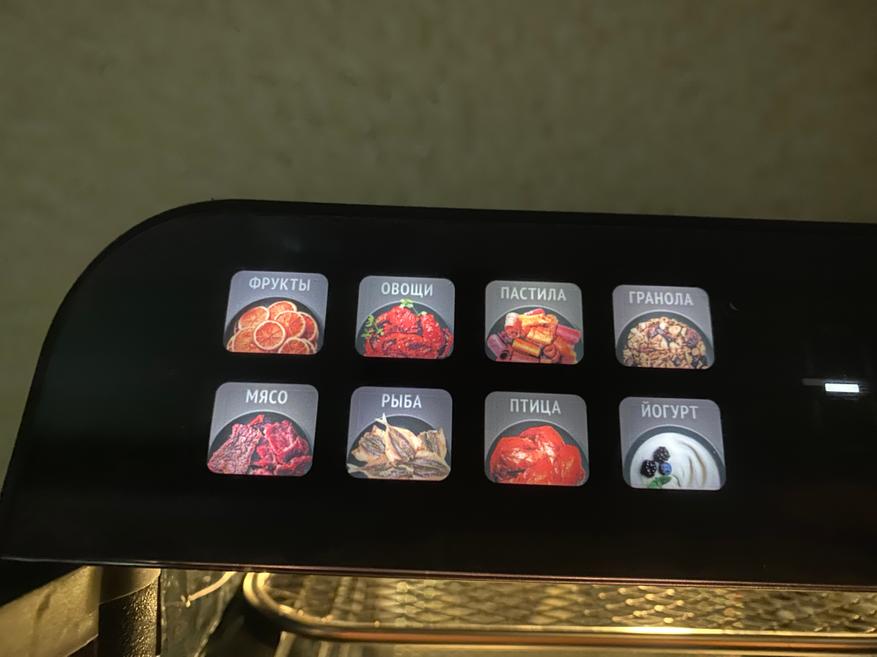 На верхней лицевой части располагается основная сенсорная панель, благодаря которой мы можем выбирать как запрограммированные рецепты с рекомендованными настройками, так и настроить свой режим по умолчанию. По молчанию у нас имеется 8 блюд, которые выведены на лицевую панель, а именно приготовления фруктов, овощей, пастилы, гранолы, мяса, рыбы, птицы, йогуртов. Также на панели имеется сенсорная кнопка включения и выключения выделенного красного цвета, сенсорная кнопка для включения света во внутренней камере, сенсорные кнопки для выставления температурного режима и ручные настройки (температуры-времени). На самом деле, в дегидраторе мы можем приготовить весьма разнообразные блюда, а именно вяленые колбаски, разнообразные джерки, рыбные закуски, снеки, фруктовые чипсы, овощную приправу, ряженку, йогурт, пастилу и многое другое. На панели управления также имеется возможность отключить звуковые сигналы, заблокировать сенсорную панель во избежание необдуманных нажатий (детьми).