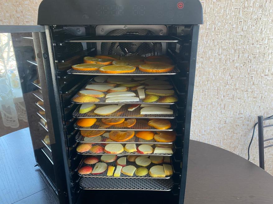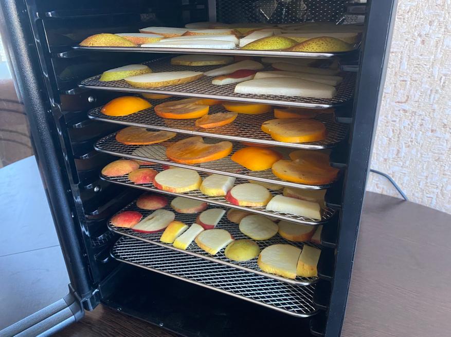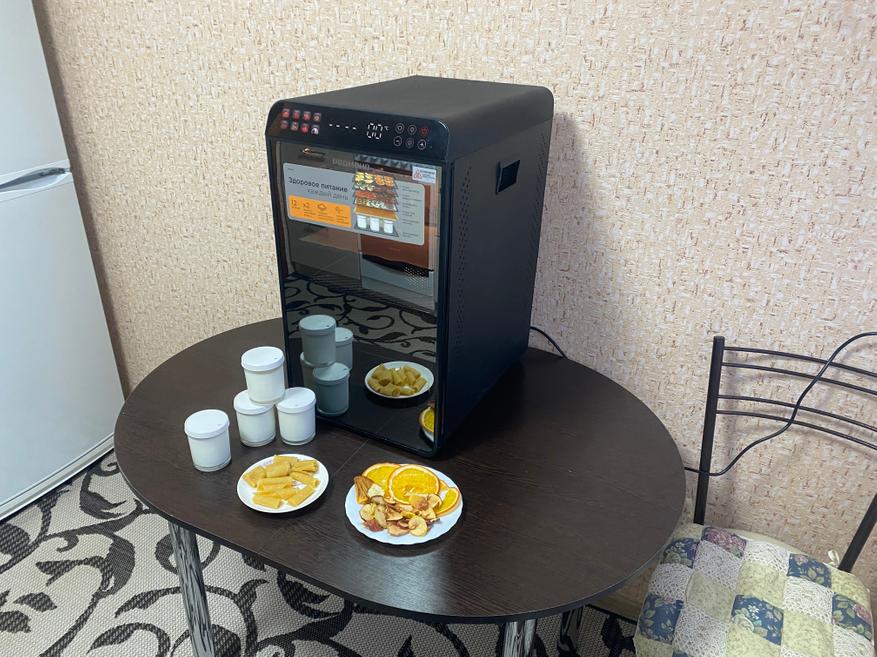 В заключении могу сказать, что дегидратор РЕДМОНД FD1104 показал себя на достаточно хорошем уровне и во время использования никаких замечаний (лично для меня) выявлено не было. Перед покупкой определенно стоит иметь в виду, что данный электроприбор занимает достаточно много места и на маленькой кухне установить его будет проблематично, также хочу отметить, что приготавливать (высушивать) рыбу, мясо, колбаски лучше при открытом окне или в идеале использовать на летней кухне, так как запахи от продуктов будут весьма ощутимы. Во время использования я высушил фрукты, приготовил пастилу из яблок, приготовил йогурты, которые будут намного полезнее магазинного варианта. Дегидратор собран достаточно качественно и аккуратно, поддоны выполнены из прочного пластика и нержавеющей стали, баночки для приготовления йогурта сделаны из толстого стекла и имеют, лично для меня, удобные крышки с датой приготовления.