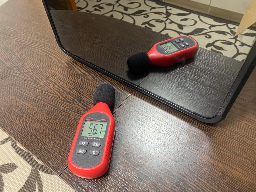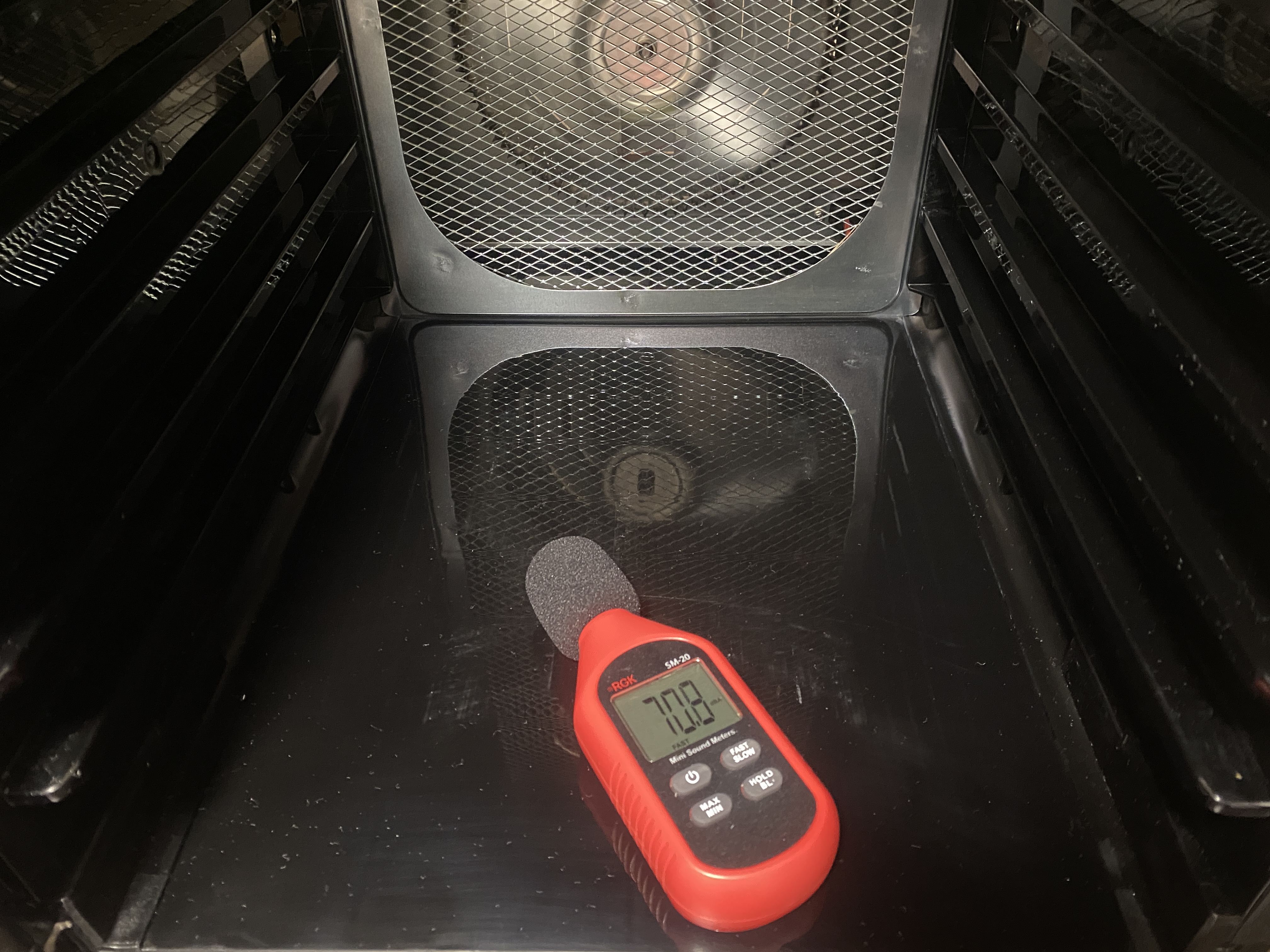 При помощи шумомера замерил уровень шума. При открытии дверцы получаем 70.8 dB, а при закрытой дверцы уровень шума уменьшился до 56.7 dB. Скажу так, что если использовать дегидратор в ночное время в соседней комнате, то шум от работы вентиляторов конечно услышать можно, но он не мешает нормальному сну.