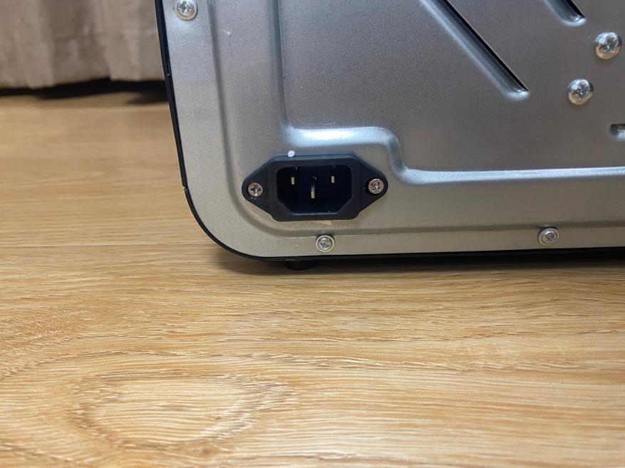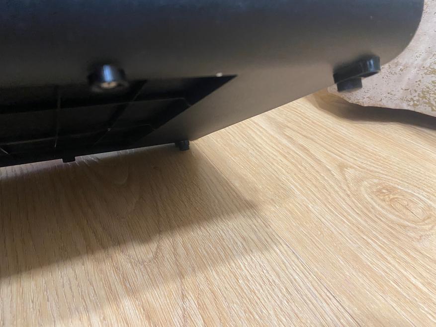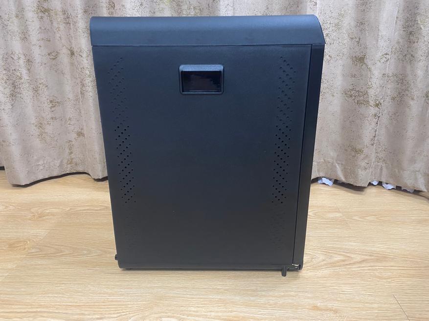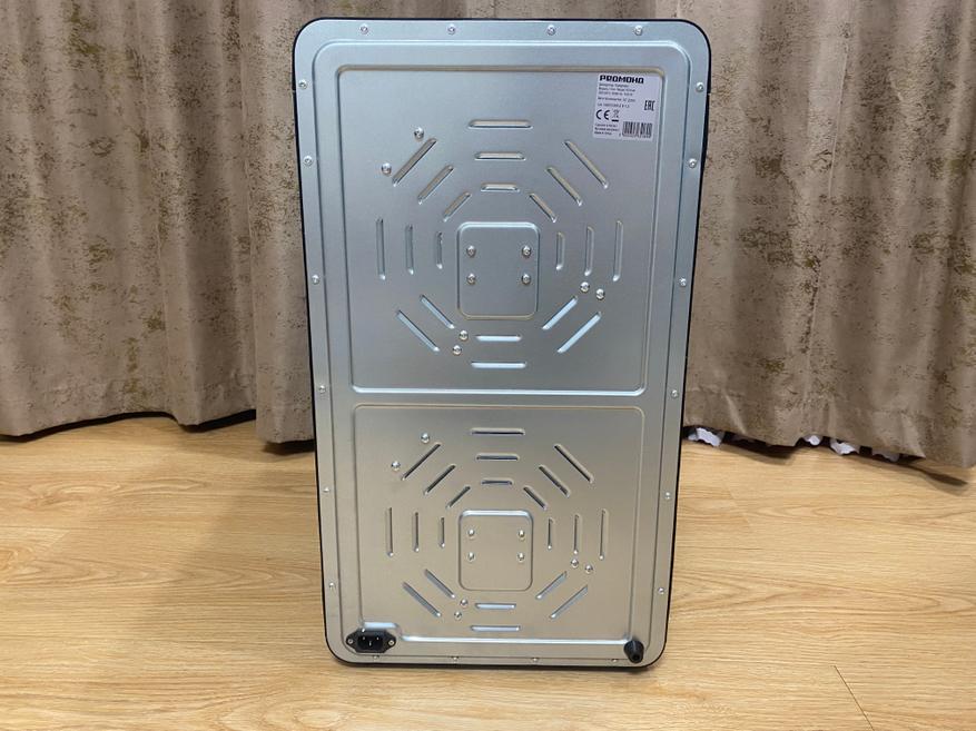 На задней стенки имеется пластиковый ограничитель, которые предотвращается установку дегидратора в плотную к стене, также на нижней части находится разъем для подключения кабеля питания. Задняя металлическая стенка крепится при помощи многочисленных саморезов и если возникнет потребность, то её без проблем можно снять. С двух сторон на корпусе дегидратора имеются вентиляционные отверстия и пластиковые ручки для удобства во время переноски. Устанавливается дегидратор на пластиковые ножки, часть из которых имеют резиновые колпачки для избежания скольжения по поверхности, хотя я думаю, что дегидратор который весит 11.5 кг и так будет проблематично сдвинуть с места, тем более при полной загрузке.