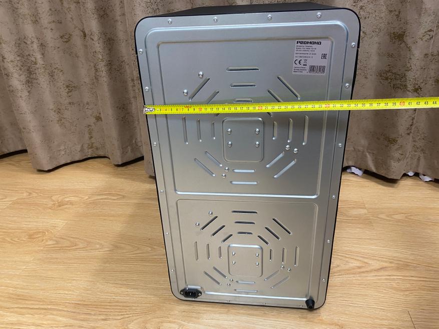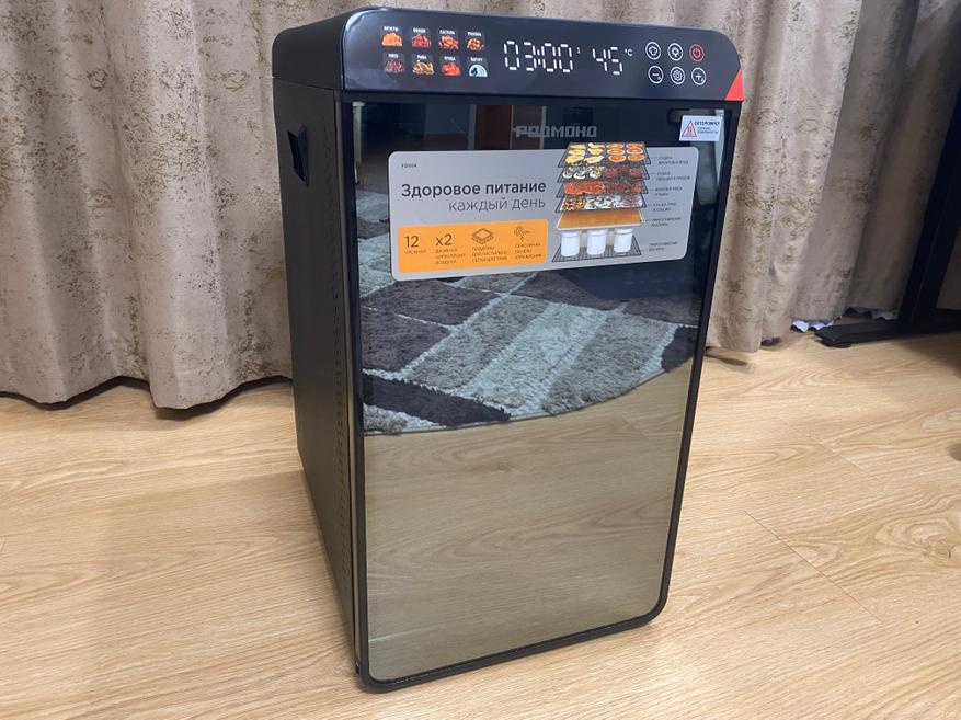Дегидратор поставляется только в одном цвете, а именно в черном. Корпус дегидратора выполнен из пластика и металла. Пластик выполнен в матовом цвете и на самом деле отпечатки пальцев и других загрязнений он собирает не так уж и много, ну конечно кроме пыли, (пыль всегда отлично виднеется на темной поверхности). Уже по упаковке было понятно, что данный электроприбор действительно имеет внушительные размеры, а именно 65 см — 61 см — 33.5 см. Лицевая сторона дверцы выполнена из стекла с зеркальным эффектом, хоть и от стекла все и отражается, но при включении внутреннего света мы можем без проблем наблюдать процесс сушки или приготовления. На стекле можем увидеть информационную наклейку на которой производитель призывает правильно питаться и заботится о своем здоровье каждый день. Также на информационной наклейки имеются описание всех особенностей данной модели.