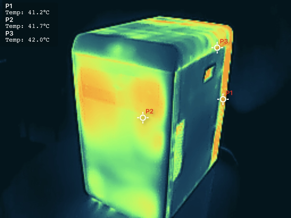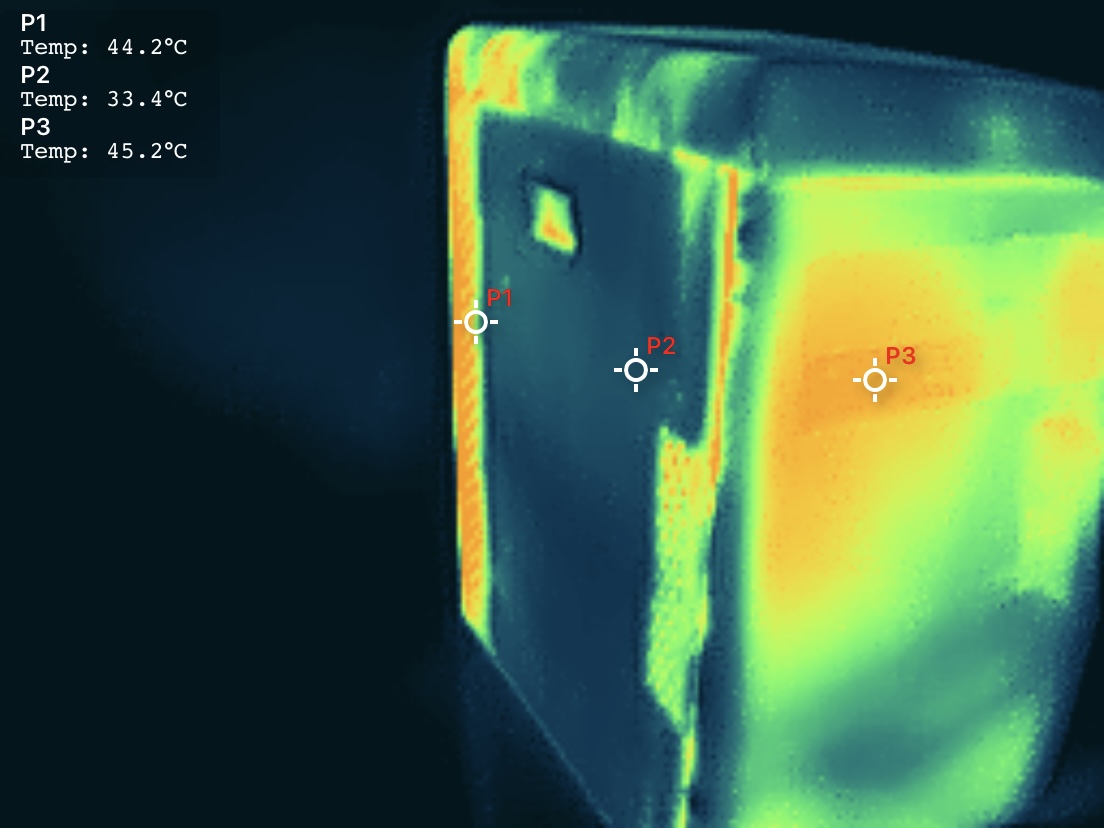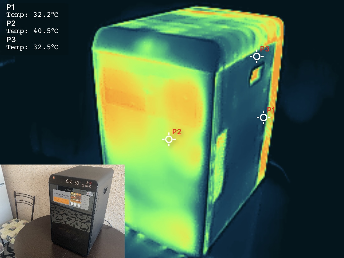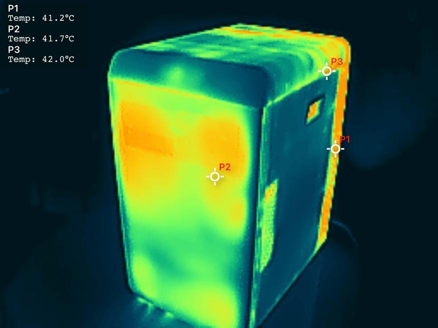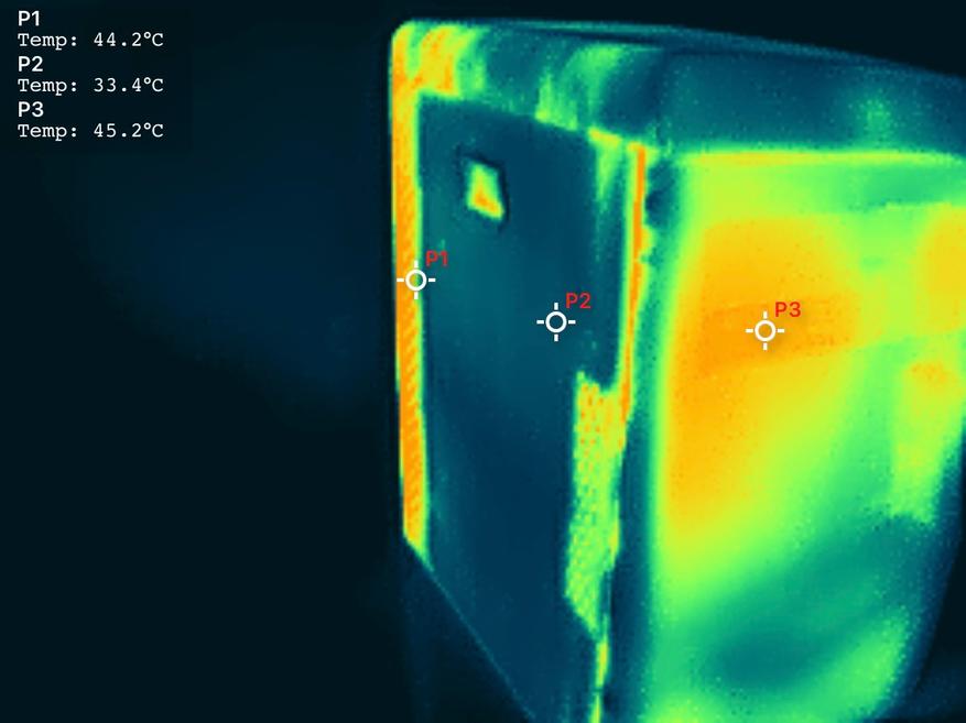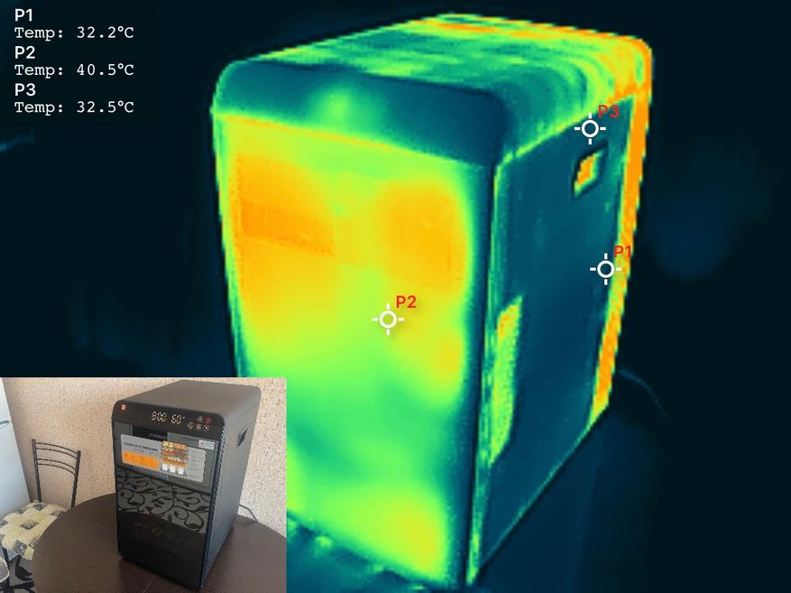 При помощи тепловизора можем наблюдать, что во время использования дегидратора, корпус нагревается в среднем до 40 градусов.