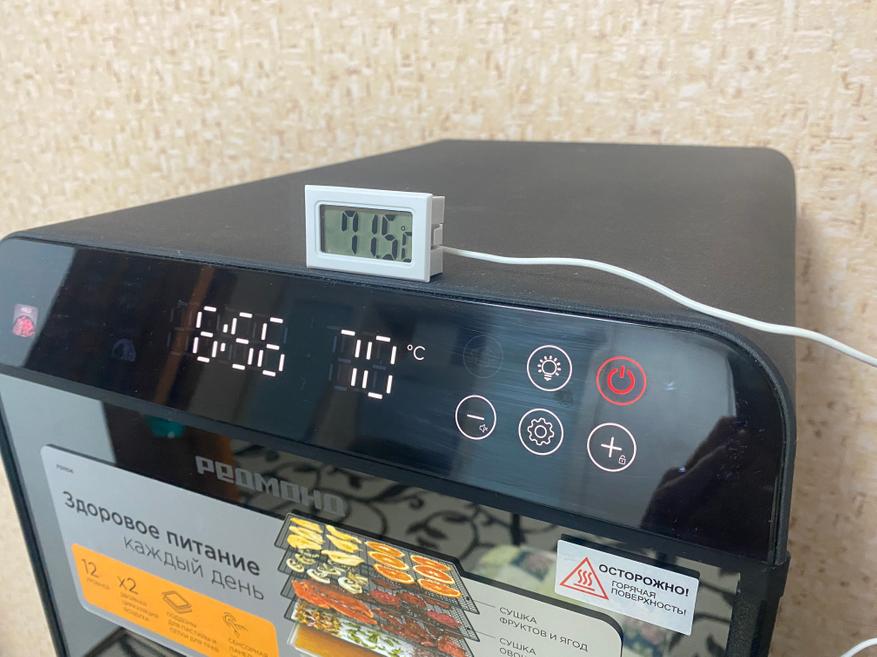 В дегидраторе мы можем выставить максимальную температуру 70 градусов, которая во время тестирования полностью подтвердилась.