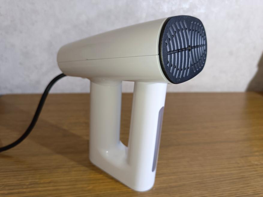 Качество обработки хорошее, ничего не скрипит и не люфтит. Конструкция состоит из двух частей. Первая — это основной блок с нагревательным элементом и керамической подошвой. Второй блок выступает в качестве резервуара для воды объемом 300 миллилитров. Также резервуар является рукояткой. На боковой его части есть прозрачное окно, через которое можно отслеживать уровень воды. Снимается емкость простым поворотом в сторону.