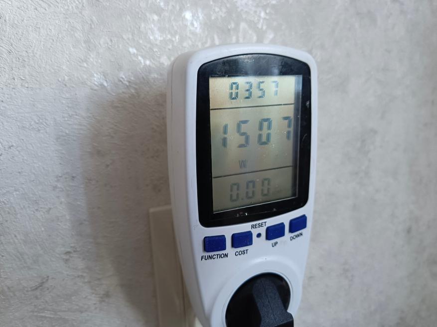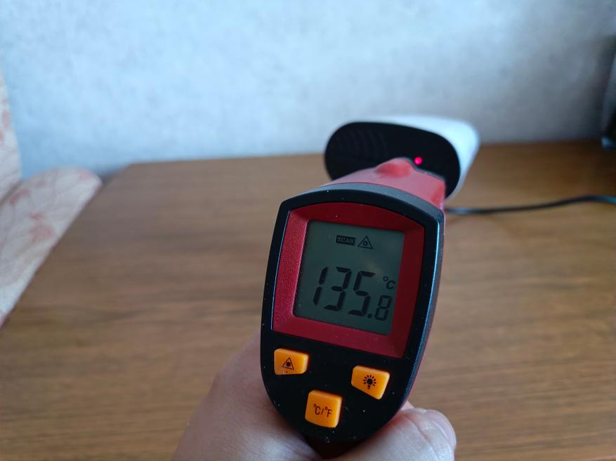 Отпариватель работает от переменной сети и потребляет 1500 Вт при напряжении 220 В. Заявлена мощность в 1650 Вт, но она будет таким при напрежении в сети 230-240В. Пирометр зафиксировал на керамической поверхности 135℃ из 130 заявленных.