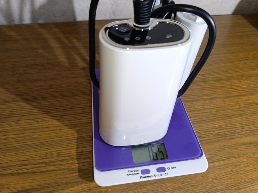 Начну с того, что отпариватель выполнен из белого пластика, а это сразу плюс, так как корпус автоматически становится немарким. Он очень компактный, на второй фотографии можете посмотреть физические сравнения с утюгом. Отпариватель немного короче утюга, но выше. Весит устройство вместе с проводом 765 грамм, что является весьма легким. То есть с полным резервуаром вес составляет около килограмма.