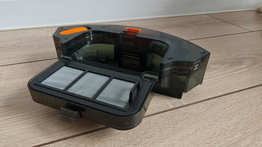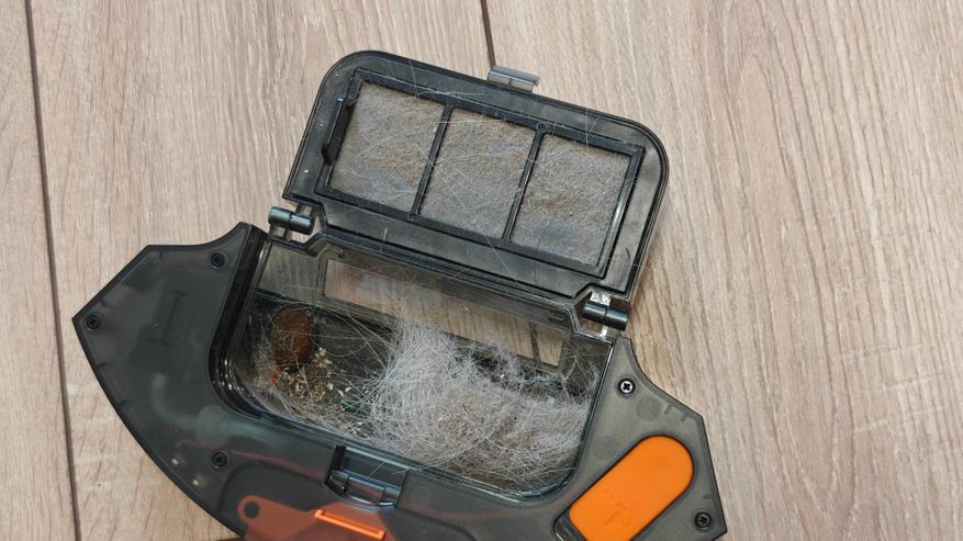 Разумеется, в подобном исполнении, нам нужно самостоятельно очищать контейнер для мусора и стирать салфетки. Но сам робот довольно качественно убирается в квартире. Он может не только проходить с сухой уборкой, но и проводить влажную уборку полоса за полосой. Тут влажная уборка простая, просто проведение влажной тряпкой, но это дает ощущение чистоты при хождении по полу босиком. За время эксплуатации робот ни разу не потерялся, пару раз терял местоположение из-за крутящегося клубка кругом (дети, звери), но все равно корректно находит место, где он есть и возвращается домой. Для сложности сделал роботу совсем неудобный заход на базу, но он все равно возвращается. Он перебирается черезпорог высотой 2см. Не сразу, с третьей — четвертой попытки, но у него получается. После уборки полный контейнер мусора и пыли, даже крупный собачий корм засосал, а также очень много собачей шерсти, а значит он действительно помогает в ежедневной уборке.