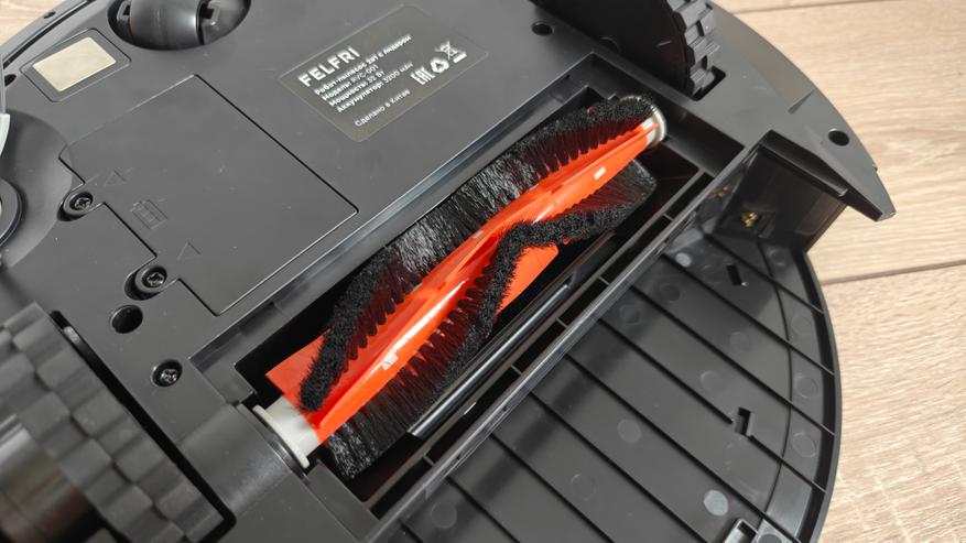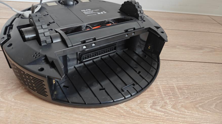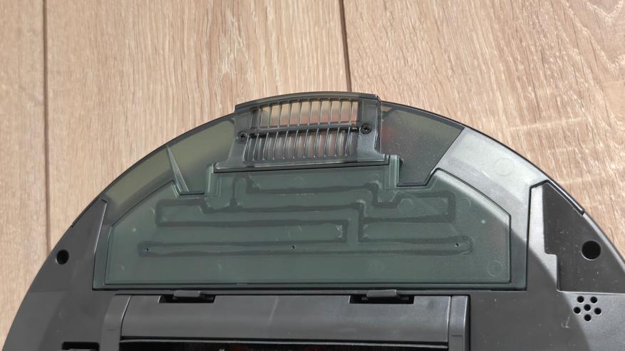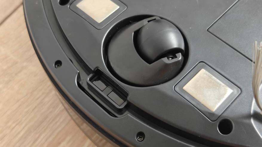 Нижняя сторона также не удивит каким-то своеобразным расположением элементов. Тут два подпружиненных моторизированных колеса и отсек турбо щетки между ними. Спереди поворотное колесико, подпружиненный контактный бампер, а по периметру датчики определения падения. Изначально салфетка сразу установлена на насадку для влажной уборки и на контейнер пылесоса. Боковая щетка одна (есть запасная). Также мы можем сразу заметить отсек для быстрой замены аккумулятора.