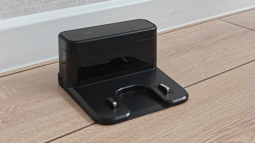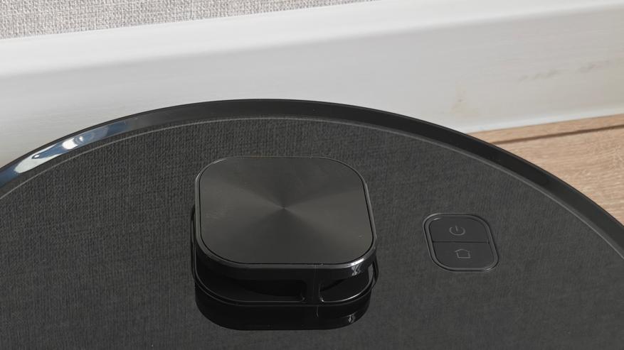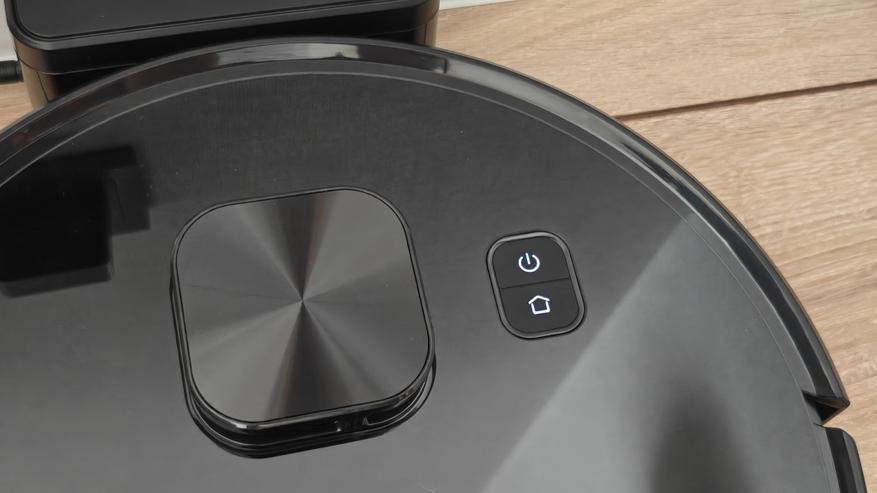Робот пылесос имеет традиционный круглый корпус, полностью выполненный из глянцевого черного пластика. На верхней стороне классическое расположение элементов, разве что башня лидара имеет квадратную форму. Сверху также мы найдем логотип производителя и две кнопки (на базу и включение).