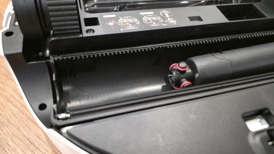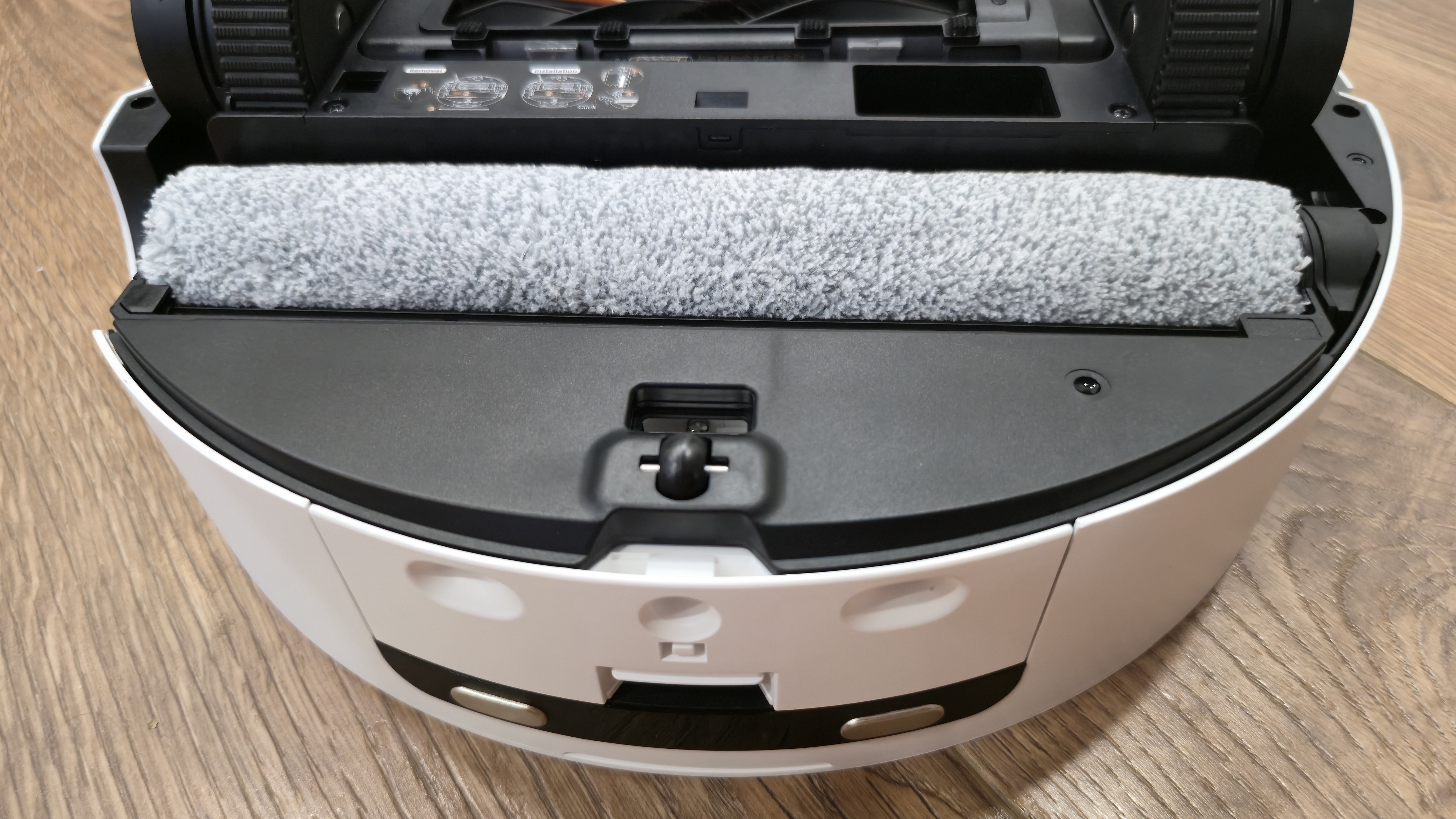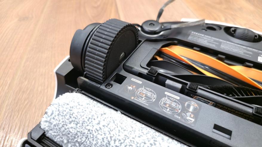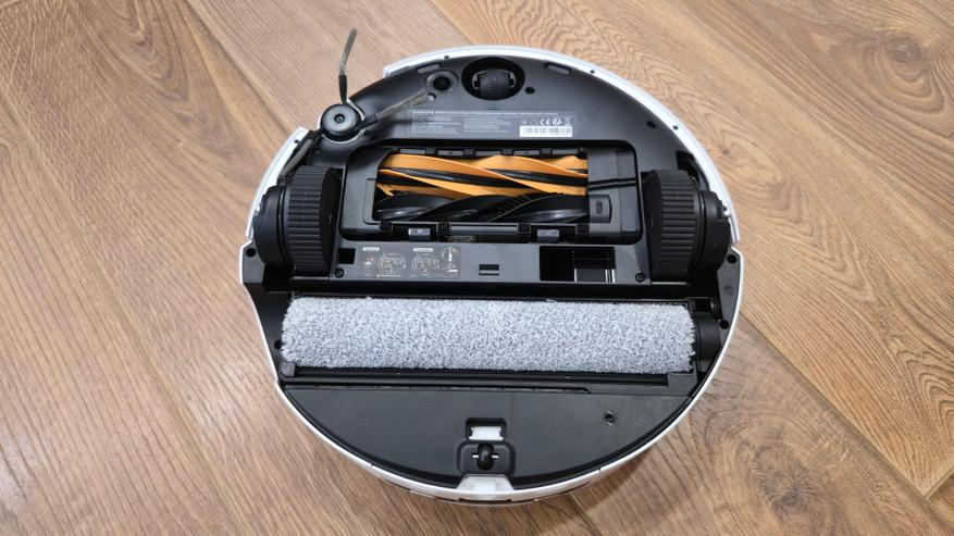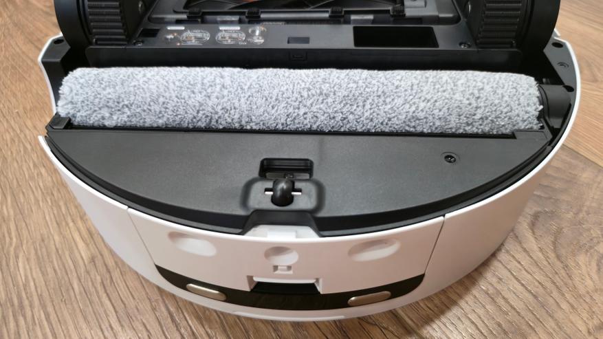Сзади — узел влажной уборки. Во всю ширину корпуса установлена роликовая швабра в отдельной кассете. Перед ней идет пластиковый скребок для отжима, сверху — контр-вал Fluff Roll, который распушает ворс ролика. В нише заметны каналы подвода чистой воды и слив к сборной полости. Задняя кромка днища скошена и имеет вырез под аппарель базы, чтобы робот заезжал в станцию без зацепов.