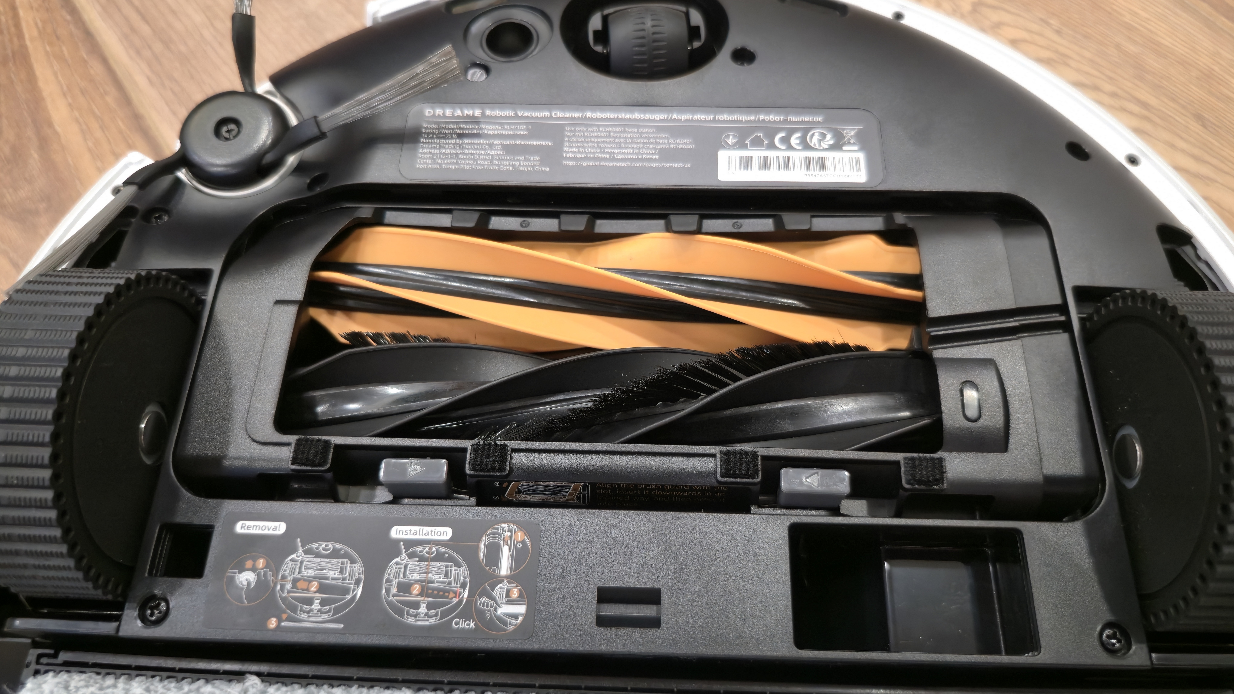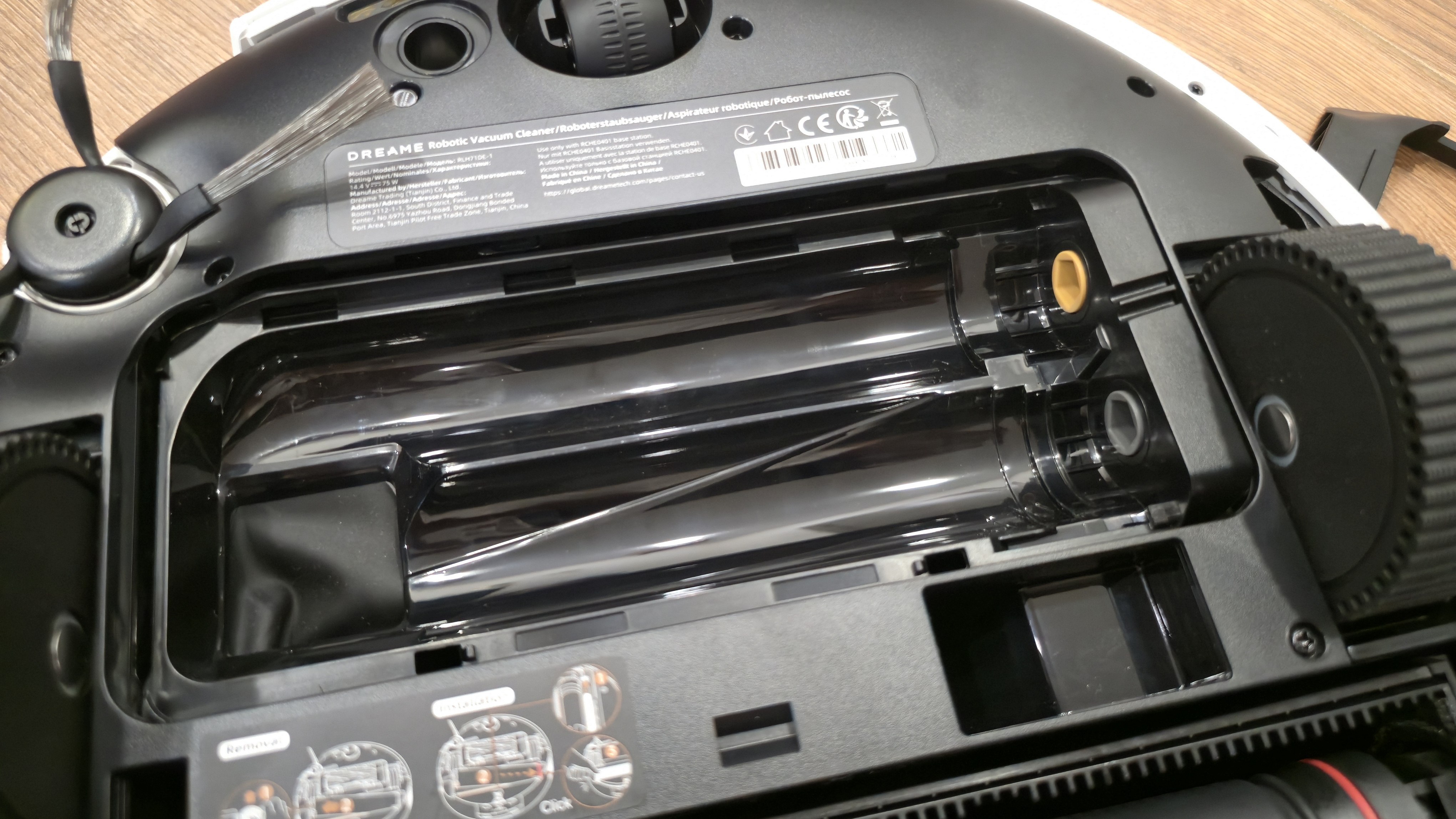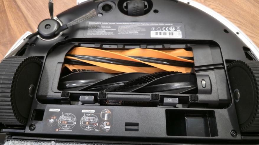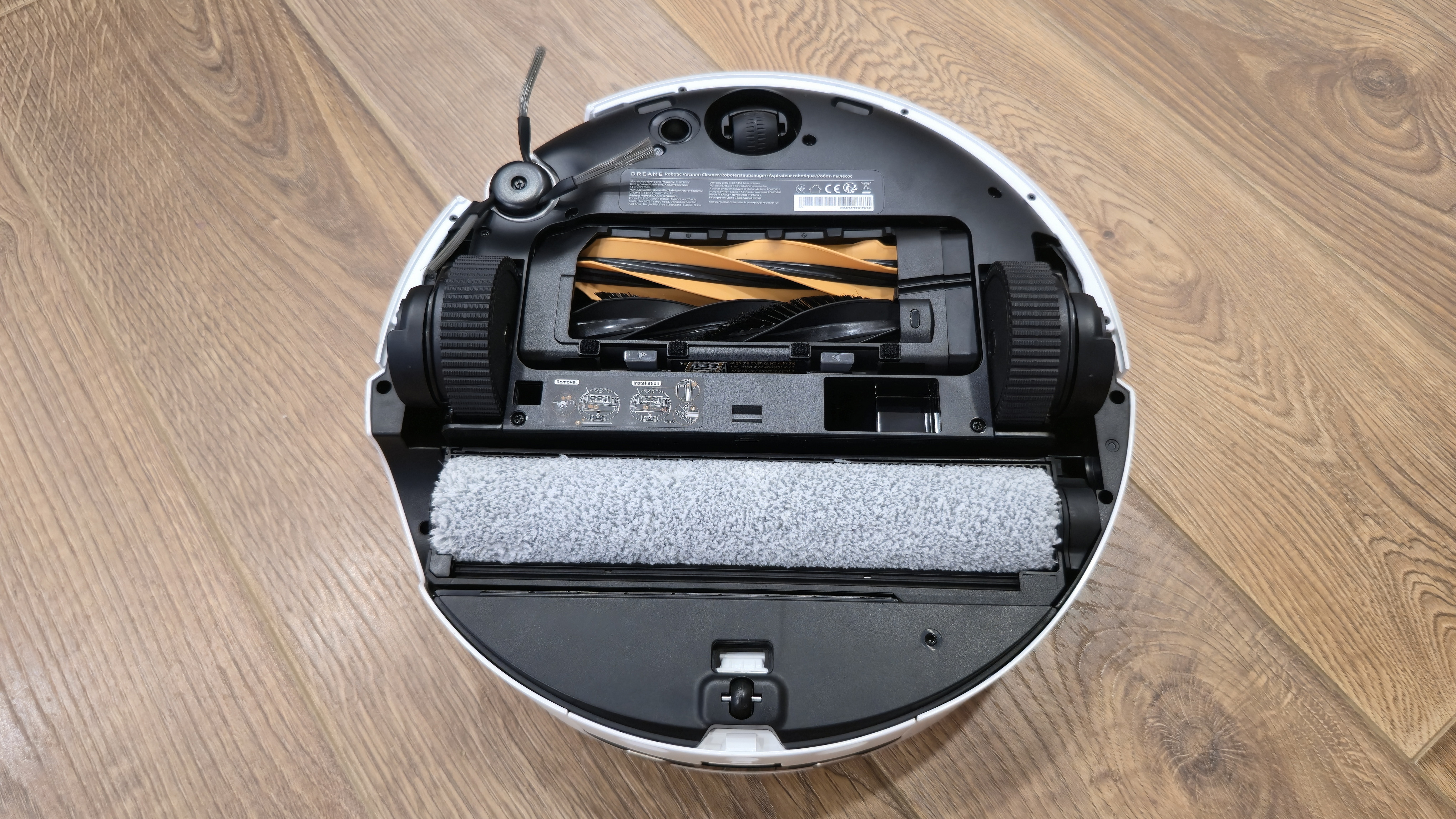Сзади — узел влажной уборки. Во всю ширину корпуса установлена роликовая швабра в отдельной кассете. Перед ней идет пластиковый скребок для отжима, сверху — контр-вал Fluff Roll, который распушает ворс ролика. В нише заметны каналы подвода чистой воды и слив к сборной полости. Задняя кромка днища скошена и имеет вырез под аппарель базы, чтобы робот заезжал в станцию без зацепов.