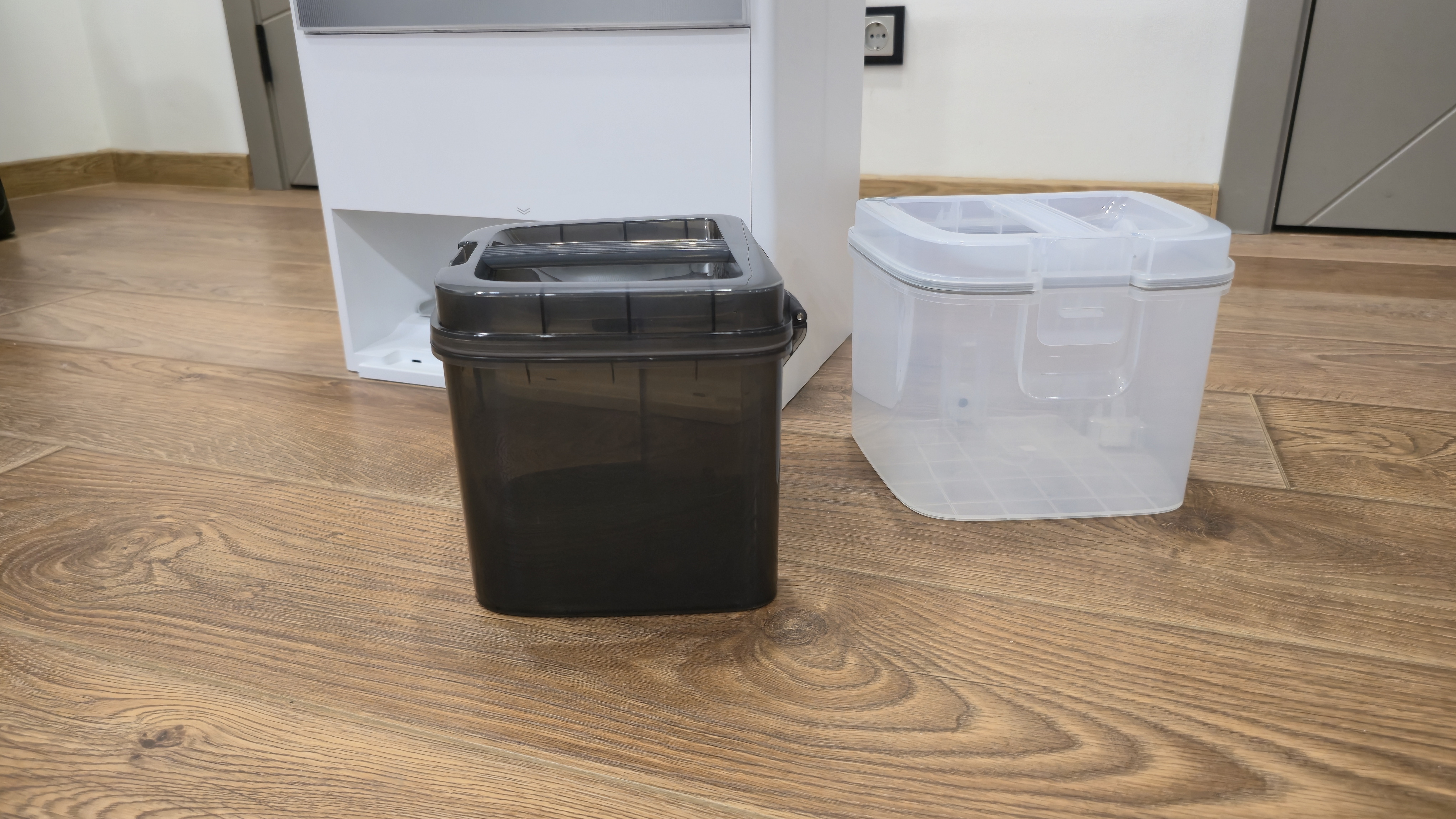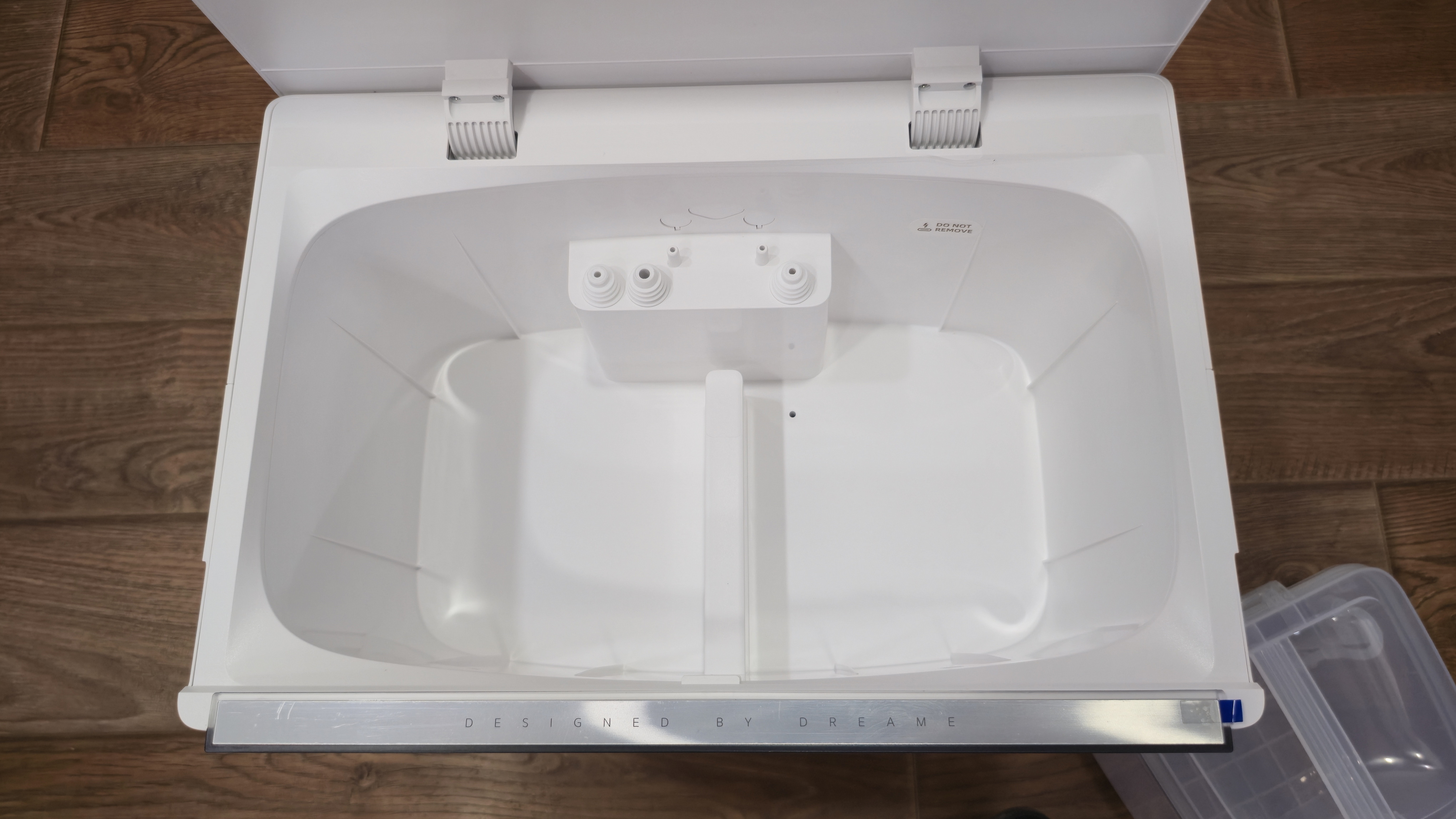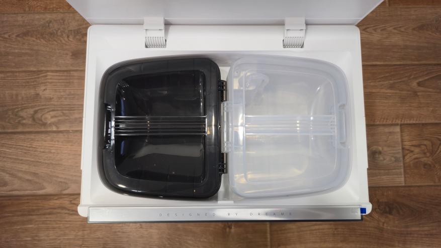 Верхняя крышка открывается целиком. Под ней стоят два бака: прозрачный для чистой воды и затемненный для грязной. Объемы: чистая вода — 4 л, грязная — 3.5 л. Между гнездами баков выведены три штуцера подачи/обратки, направляющие. Бачки невысокие, с ручками и съемными крышками.