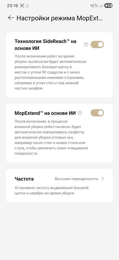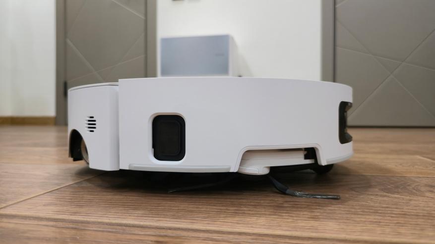 За сухую уборку отвечает система Vormax с заявленной тягой до 30 000 Па. В тракте стоит HyperStream с двумя центральными щетками и защитой от наматывания волос; этот блок поднимается, когда робот моет пол, чтобы не мешать подаче воды, а боковая щетка умеет убираться, если это требуется. Для кромки вдоль плинтусов и ножек мебели предусмотрено боковое выдвижение самой роликовой швабры SideReach и торцевой щетки — за счет этого захватывается зона, куда круглая база обычно подбирается неохотно.