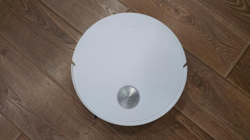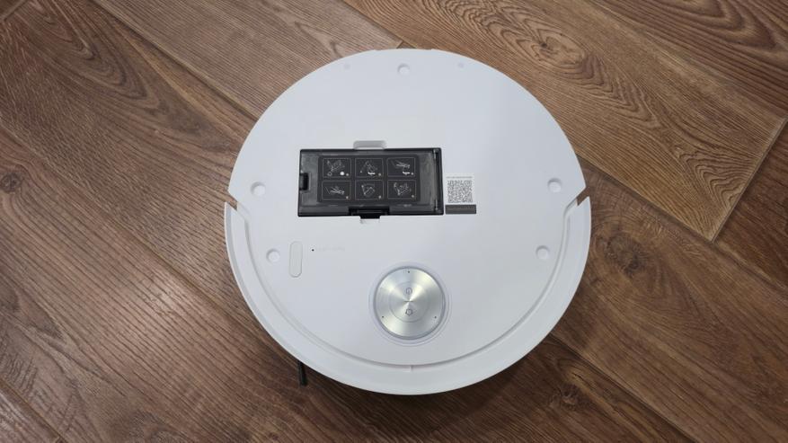 Корпус круглый, белый, без лишних вставок. Сверху почти вся площадка гладкая, ближе к передней кромке стоит подвижная «таблетка» лидара. На его верхней панели нанесены пиктограммы питания и возврата на базу, по кольцу идет световой индикатор. Центральной крышки в привычном смысле нет, но верхняя панель быстросъемная: под ней находится вытянутый контейнер для пыли с наглядными подсказками по снятию и промывке, рядом QR с ссылкой на приложение и кнопка сброса сетевых настроек.