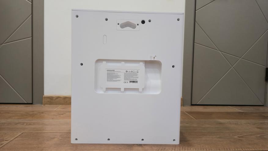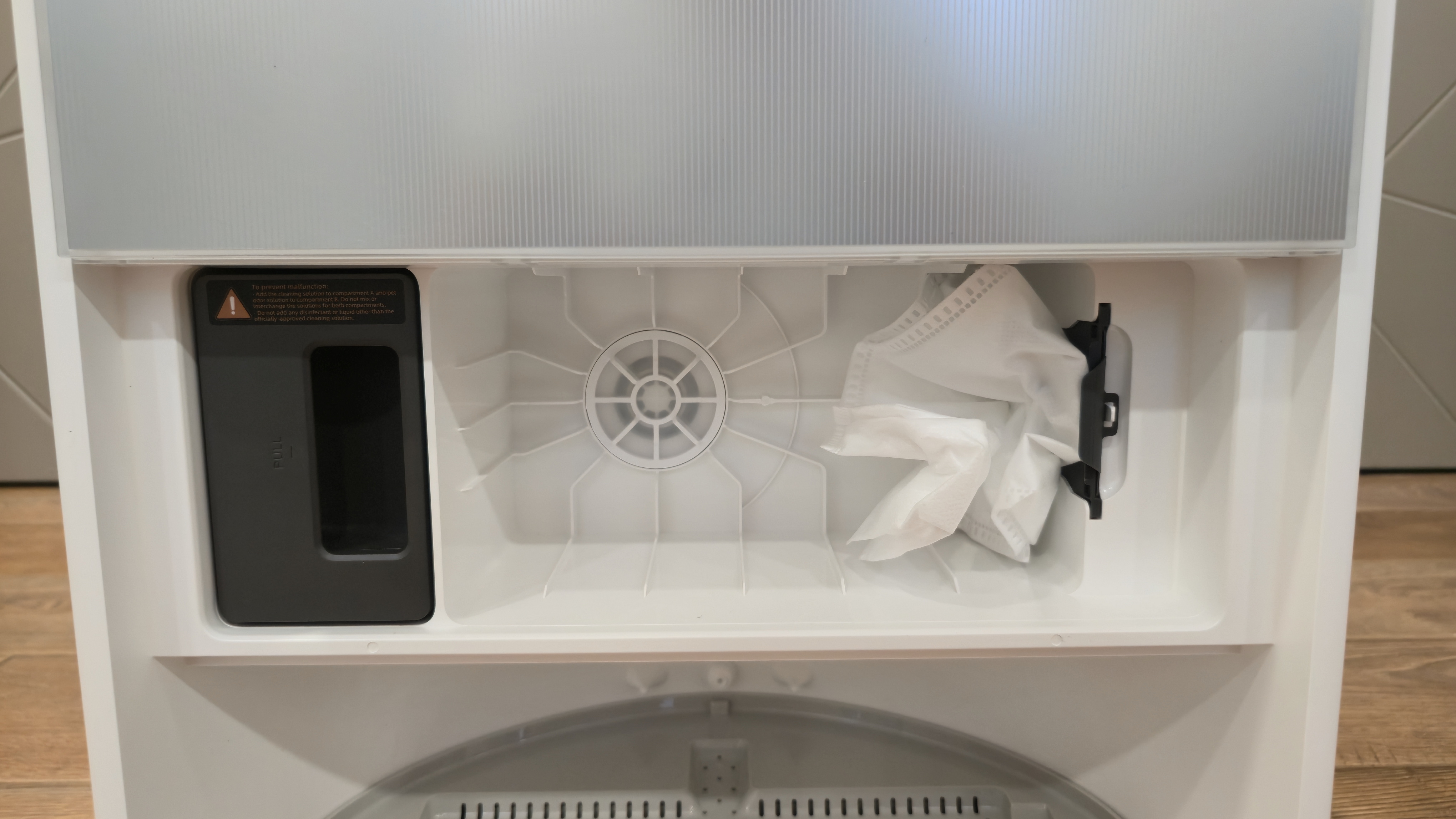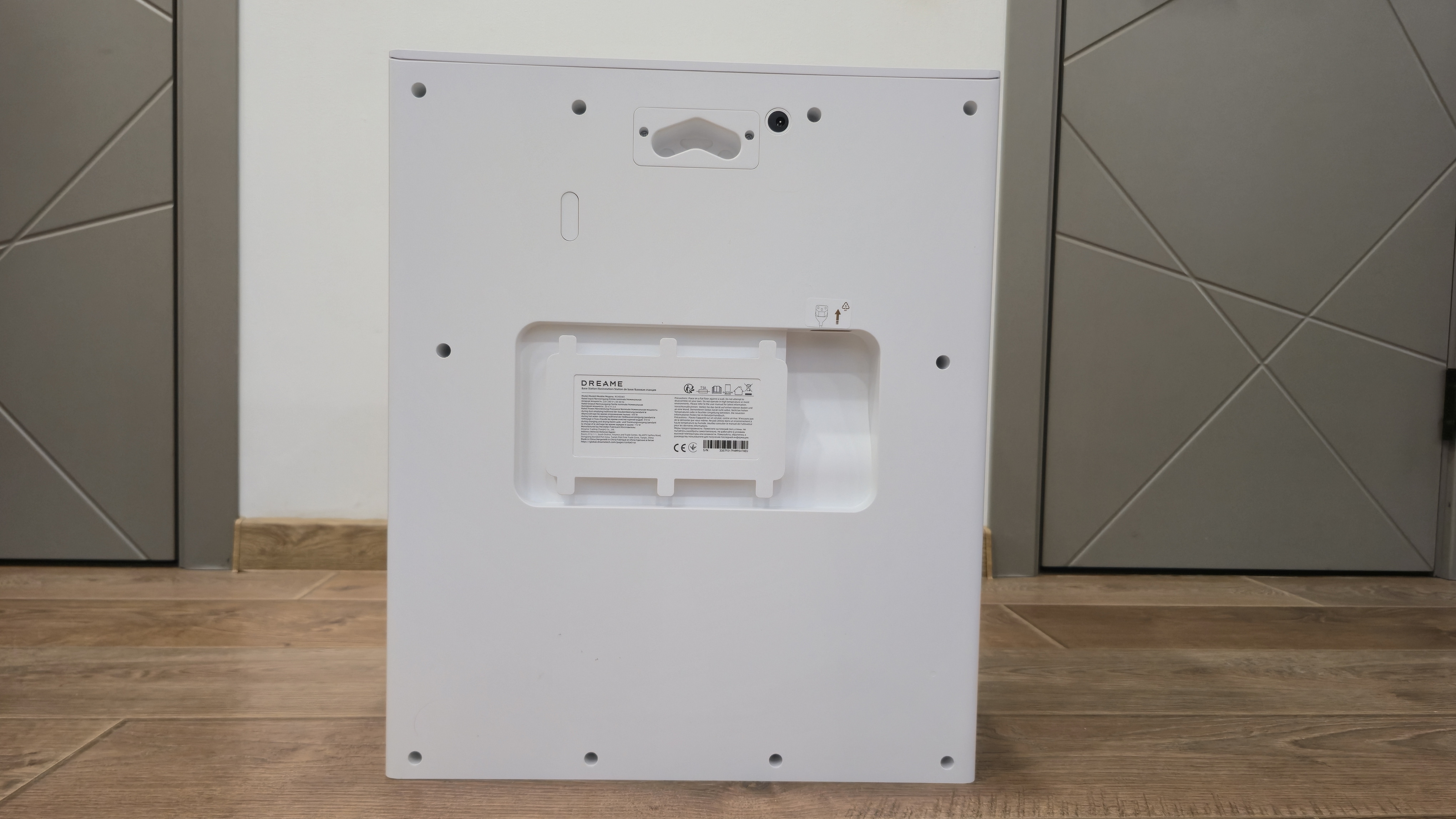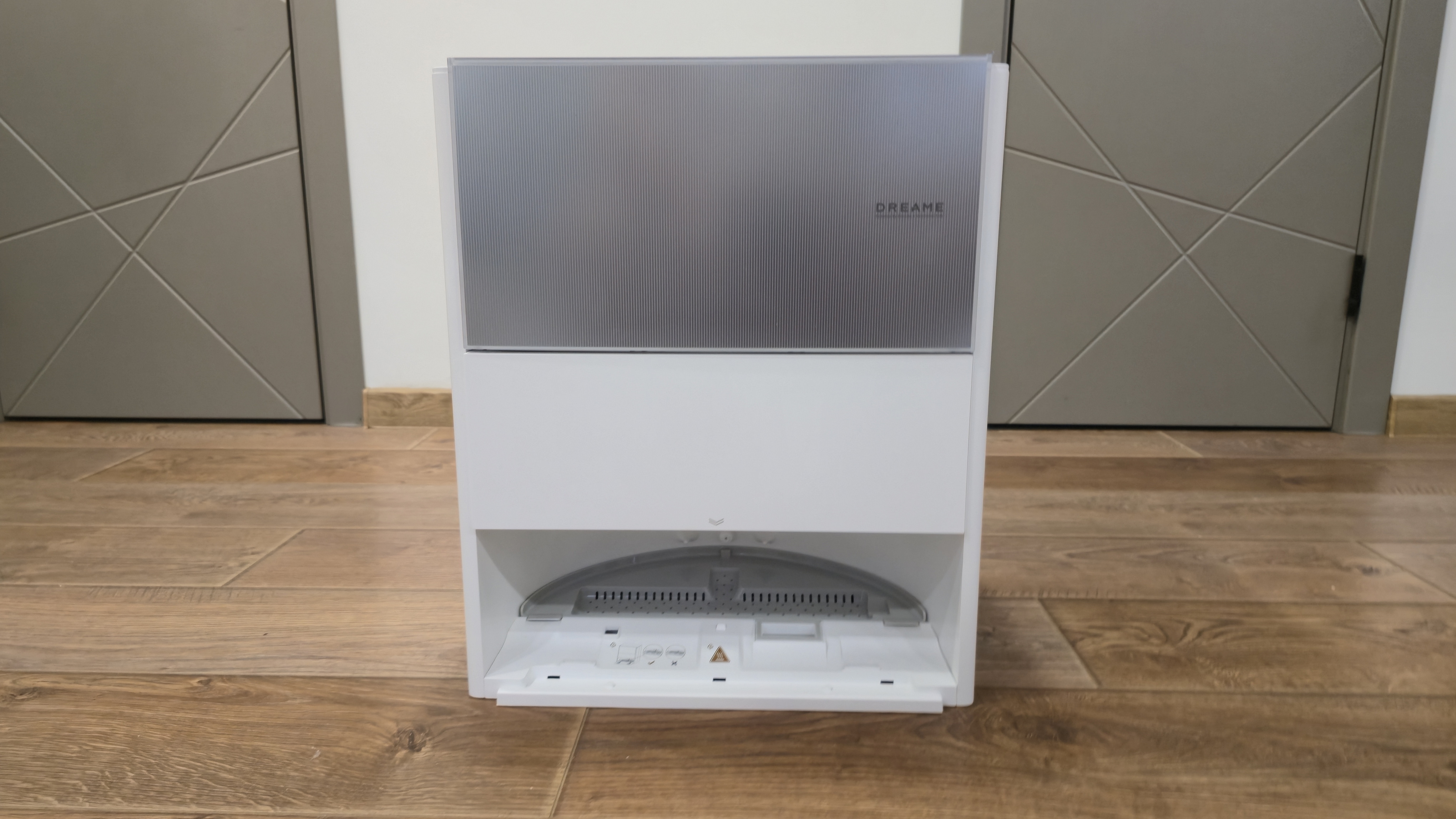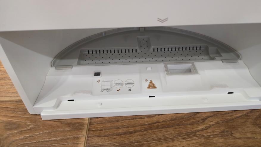 Спереди станция разделена на две зоны. Верхняя закрыта большой откидной панелью с вертикальной фактурой и логотипом. Нижняя — открытая ниша для парковки робота с широкой аппарелью; накладка аппарели съемная. В глубине ниши установлен дугообразный съемный лоток-решетка: через отверстия в нем проходит вода при промывке, а крупный мусор задерживается на поверхности. Над лотком — зона обслуживания: под пластиком спрятан нагревательный элемент почти во всю ширину, он подает горячую воду при промывке роликовой швабры; здесь же находятся два технических вывода — один для всасывания грязной воды из робота, второй для вакуумного опустошения его пылевого контейнера. На верхней кромке ниши нанесены пиктограммы и метки стыковки.