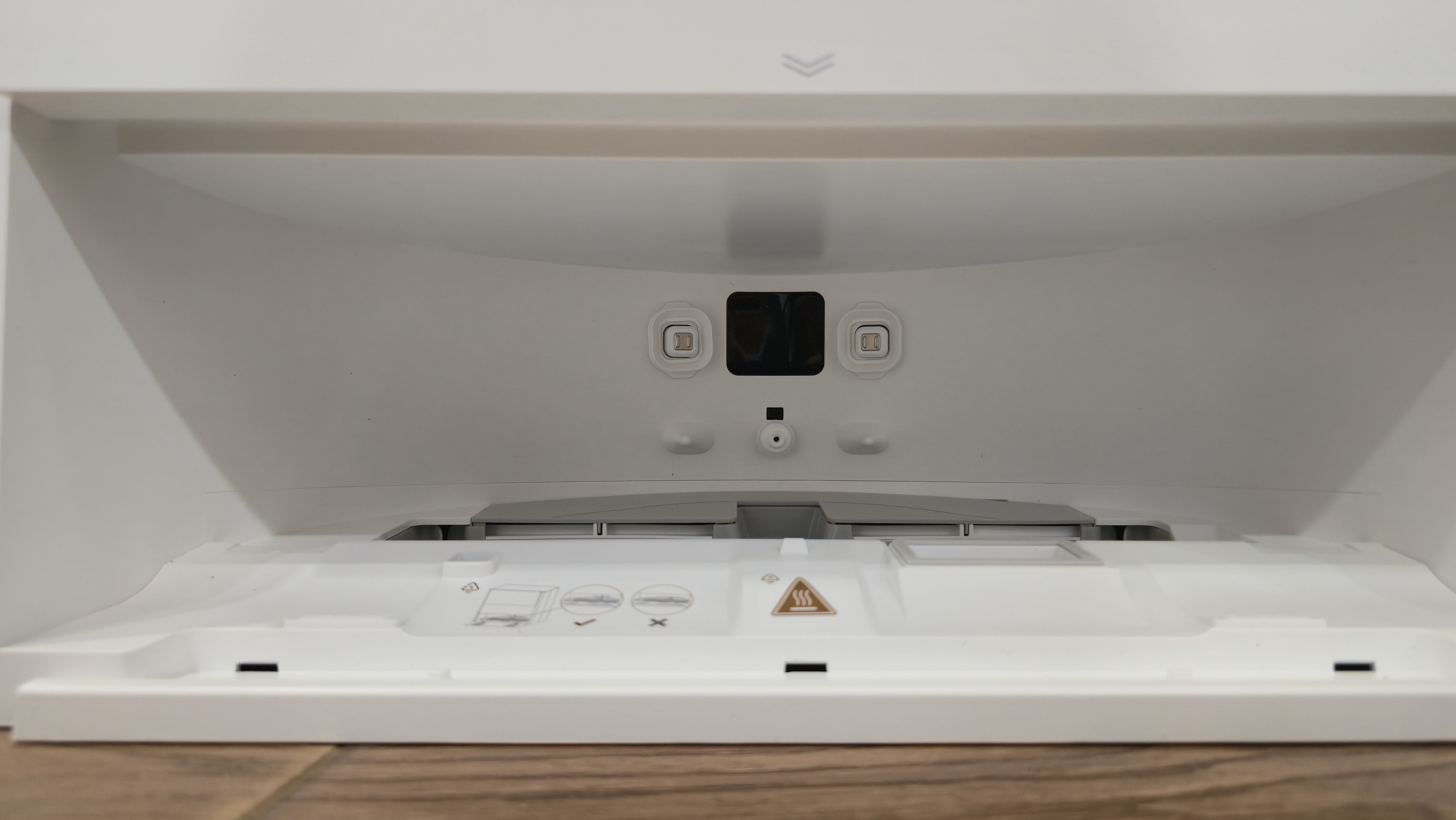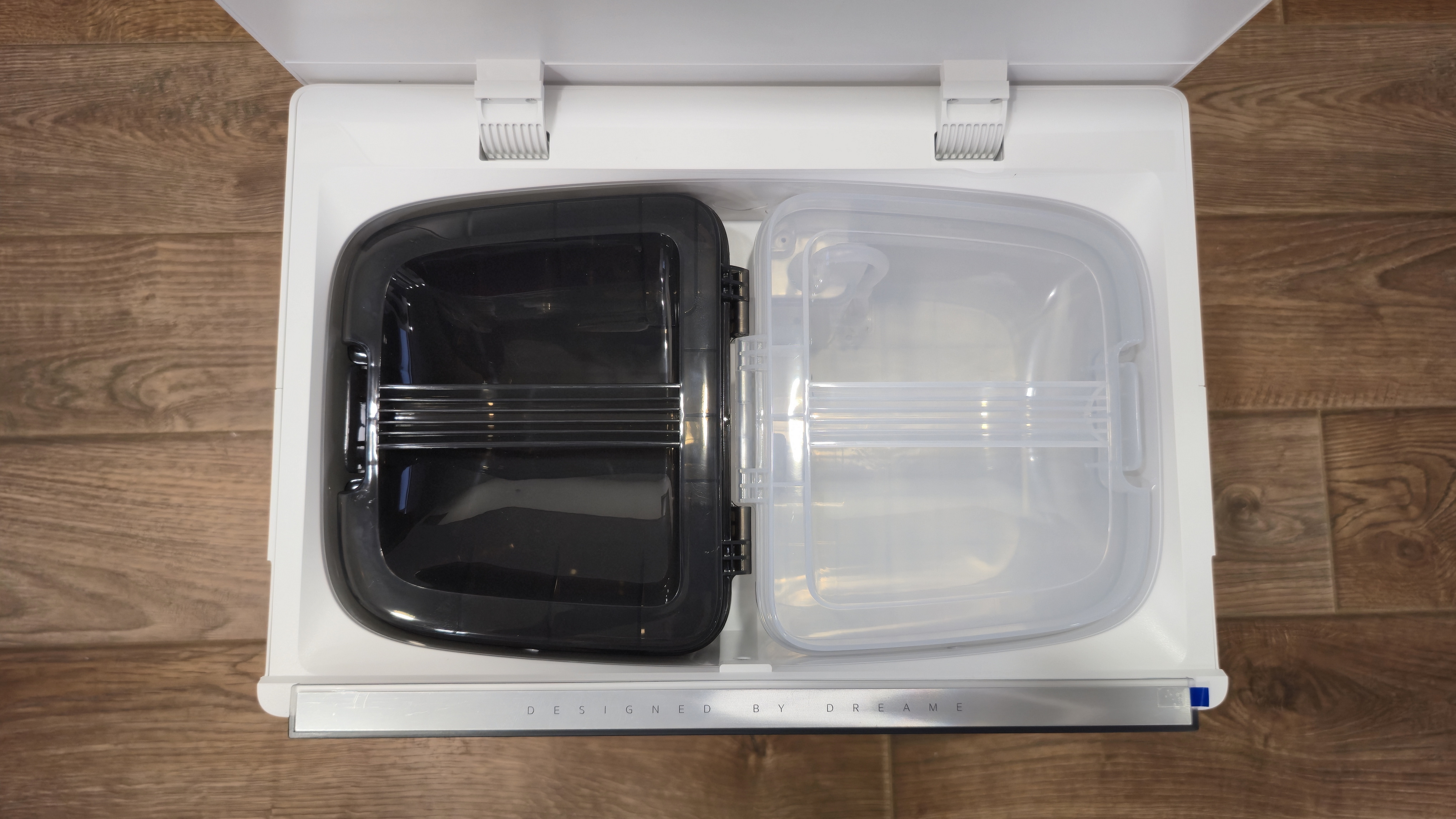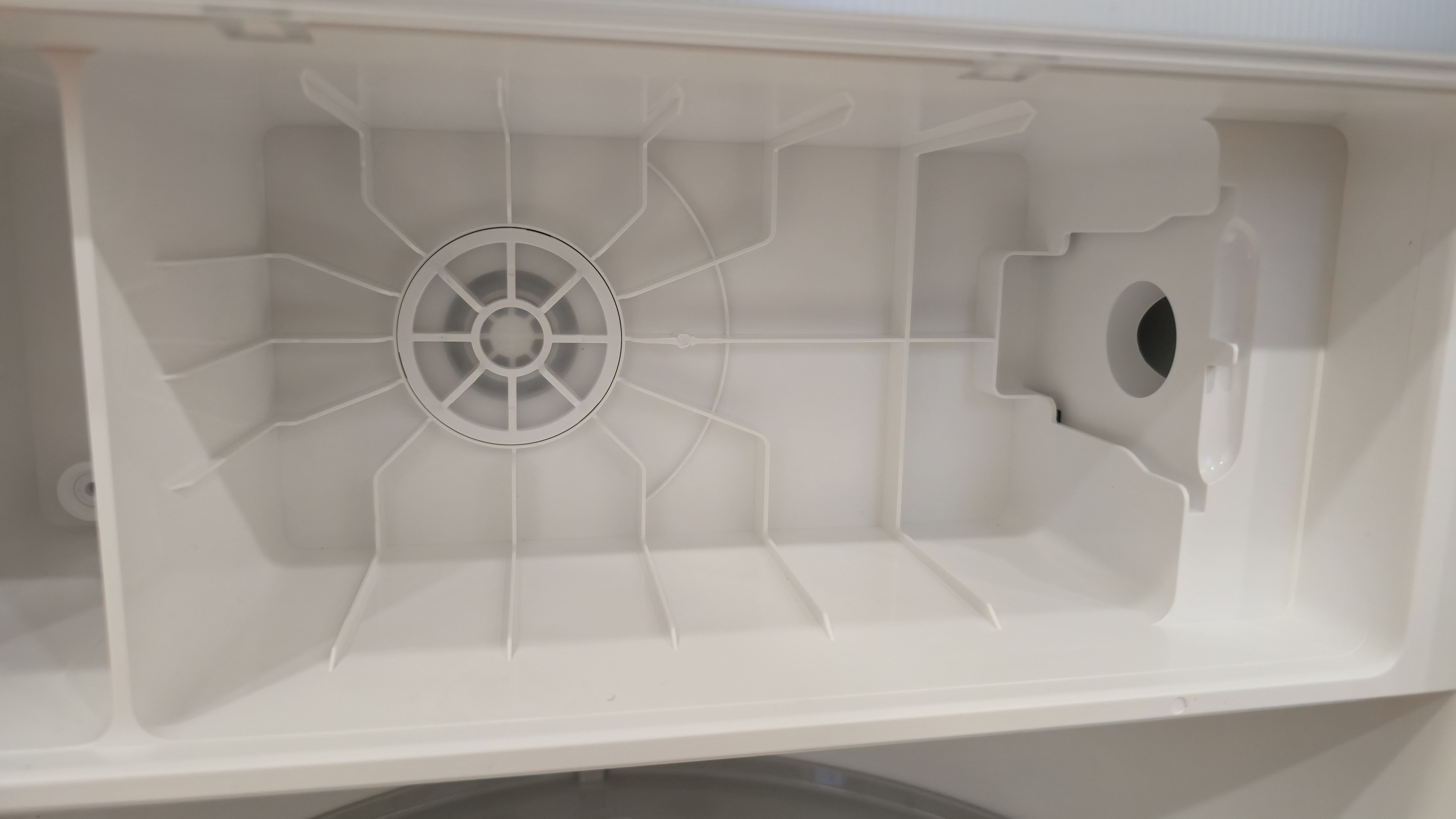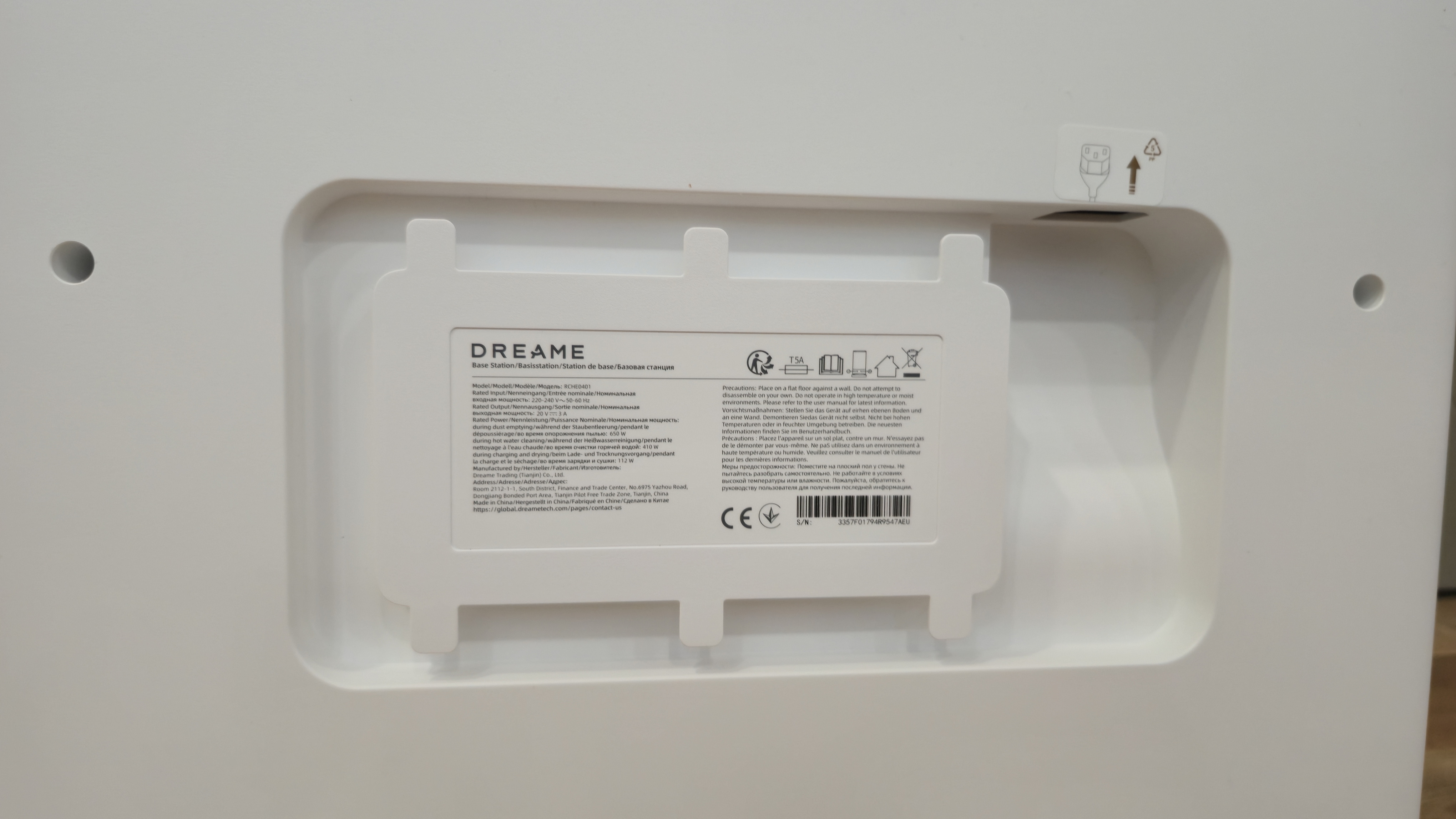 Спереди станция разделена на две зоны. Верхняя закрыта большой откидной панелью с вертикальной фактурой и логотипом. Нижняя — открытая ниша для парковки робота с широкой аппарелью; накладка аппарели съемная. В глубине ниши установлен дугообразный съемный лоток-решетка: через отверстия в нем проходит вода при промывке, а крупный мусор задерживается на поверхности. Над лотком — зона обслуживания: под пластиком спрятан нагревательный элемент почти во всю ширину, он подает горячую воду при промывке роликовой швабры; здесь же находятся два технических вывода — один для всасывания грязной воды из робота, второй для вакуумного опустошения его пылевого контейнера. На верхней кромке ниши нанесены пиктограммы и метки стыковки.