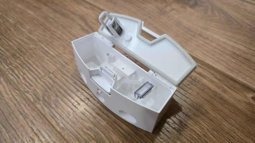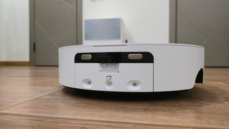 Сзади у робота отдельный сервисный узел. В центре находится прямоугольная крышка с небольшим язычком; за ней вставляется съемный резервуар грязной воды на 140 мл. Крышка фиксируется защелкой, по краям видны направляющие, чтобы бак вставал без перекосов. Над крышкой проходит темная вставка с контактной группой для зарядки, ниже расположены три круглых посадочных гнезда и стыковочные окна. Через этот блок робот сопрягается с базовой станцией: станция подает и откачивает воду для обслуживания роликовой швабры и организует сушку, а сам робот фиксируется по направляющим.