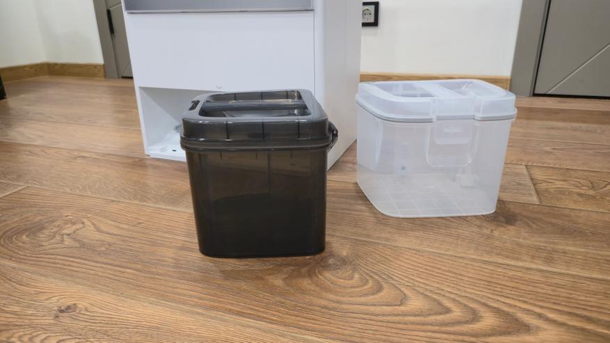 Вода и мусор разведены по разным контурам. Внутри робота стоят малые емкости, обслуживающие процесс на ходу: 100 мл для чистой и 140 мл для отработанной воды. Основные объемы находятся в базовой станции: бак чистой воды на 4 л и бак грязной воды на 3.5 л. Пыль и сухой сор из внутреннего контейнера переносятся в станционный мешок объемом 2500 мл; собственный пылевой контейнер робота 310 мл. Алгоритм простой: во время работы устройство само возвращается на базу, опустошает контейнер, промывает и сушит ролик, при необходимости дозаправляется водой и продолжает незавершенную уборку с места паузы.