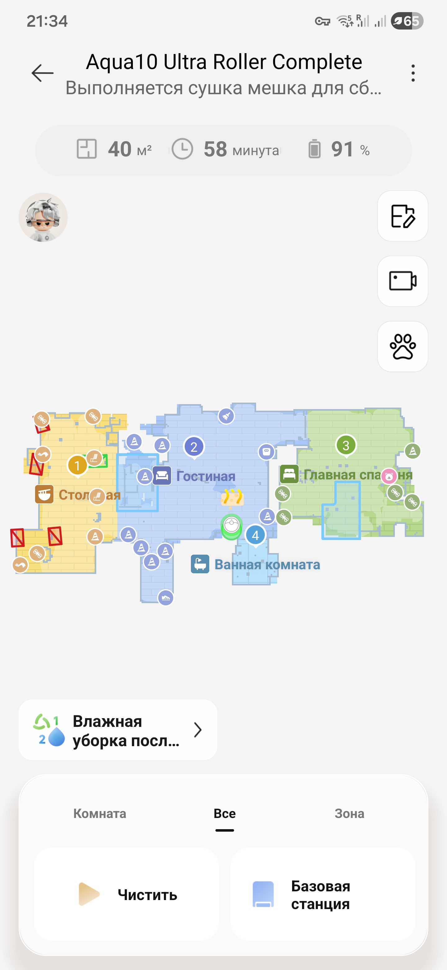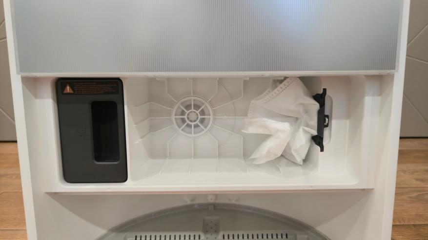 По окончанию режима сухой уборки уровень заряда аккумуляторной батареи составлял 58%. Перед влажной частью он делает короткую техническую паузу. Возвращается на базу, замирает на пару секунд, и слышно, как станция втягивает воздух — контейнер в роботе пустеет, весь сухой сор уходит в пакет пылесборника. Выгрузил, моргнул индикатором, и пошла подготовка к влажной уборке. Заполнение встроенного резервуара для воды, добавление моющего средства. Честно говоря, в этот момент приятно смотреть.