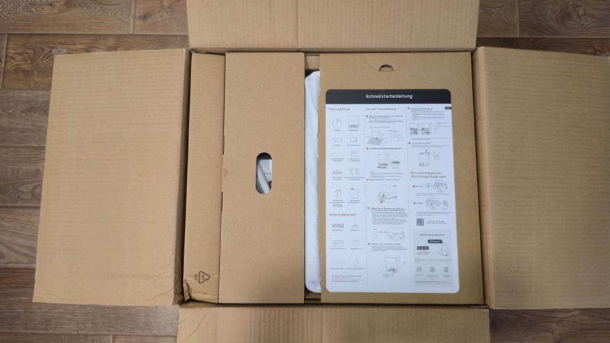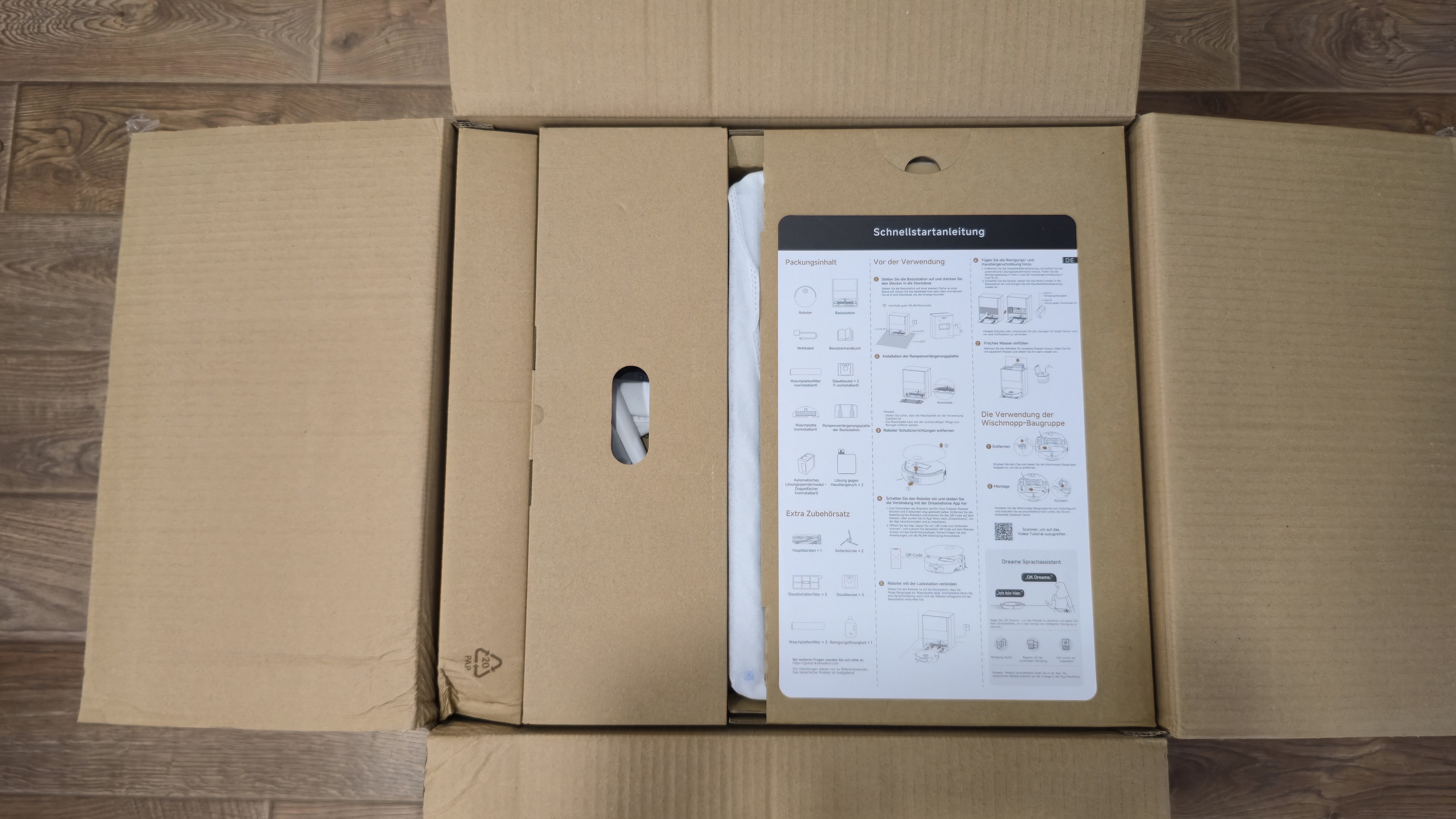 Коробка крупная, жесткая, из плотного картона черного цвета. На боковых поверхностях находятся изображения робота и станции, а также сведения о технических характеристиках устройства. Внутри все разложено по отдельным картонным ложементам: сверху — быстрый старт, под ним — модули и аксессуары в секциях; транспортные фиксаторы и пакеты.