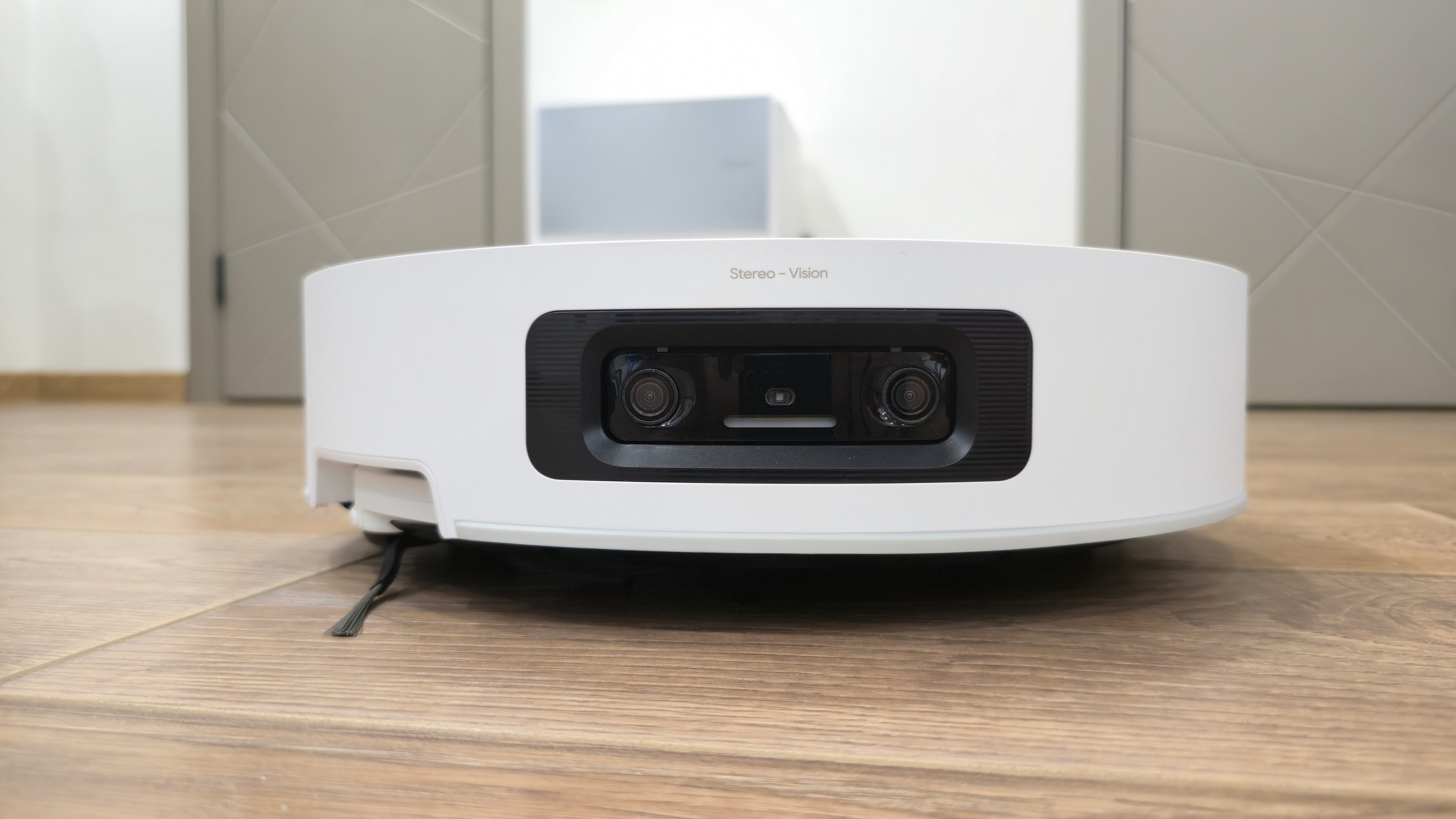 Передняя дуга отдана под бампер. В середине бампера встроен единый блок Stereo Vision: две фронтальные камеры и встроенная подсветка (LED/3D-подсветка) для работы в темноте и подсвета объектов. Чуть выше на пластике есть аккуратная надпись Stereo Vision. По бокам передней части заметны небольшие окна датчиков.