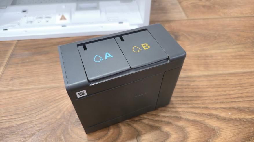 Под откидывающейся средней крышкой — сервисный блок. Справа размещается пылевой мешок на фиксаторах; левее установлена кассета со сдвоенным резервуаром для химии с маркировкой A и B: одна секция под стандартное моющее средство, вторая — под состав для удаления запахов домашних животных.